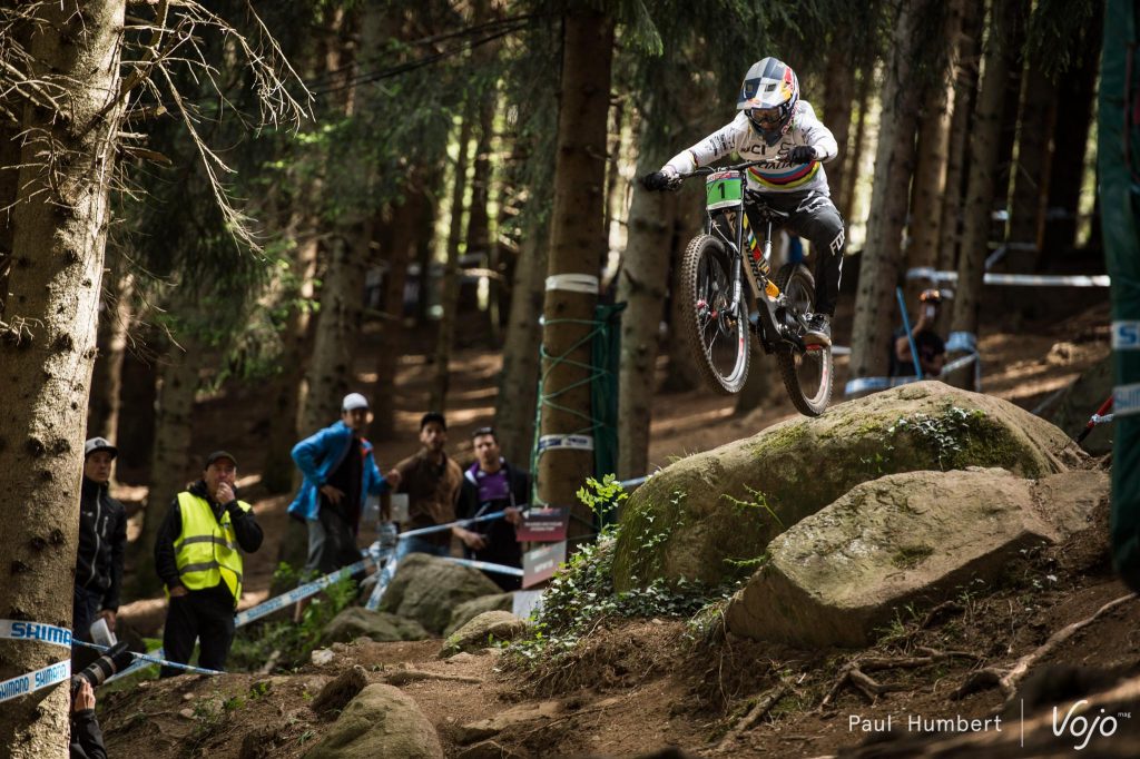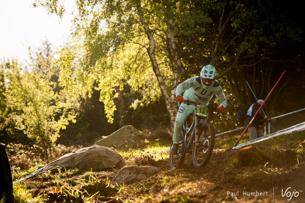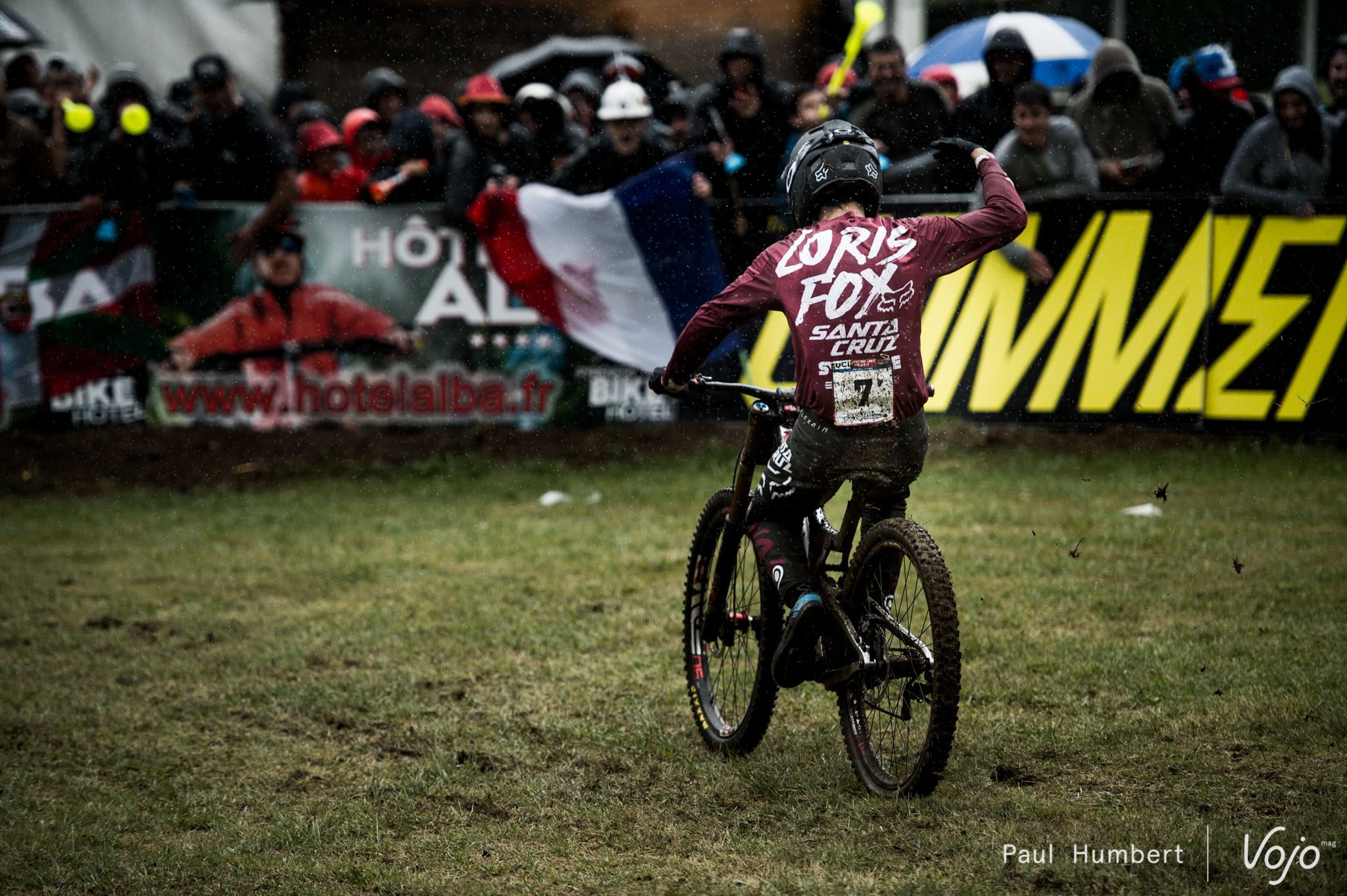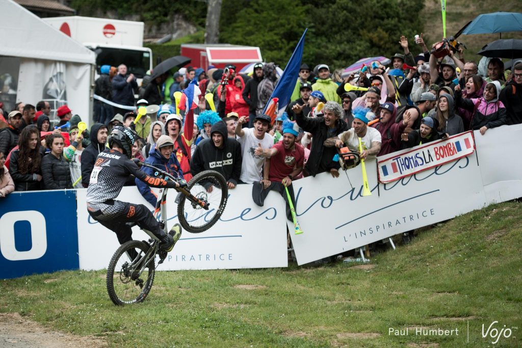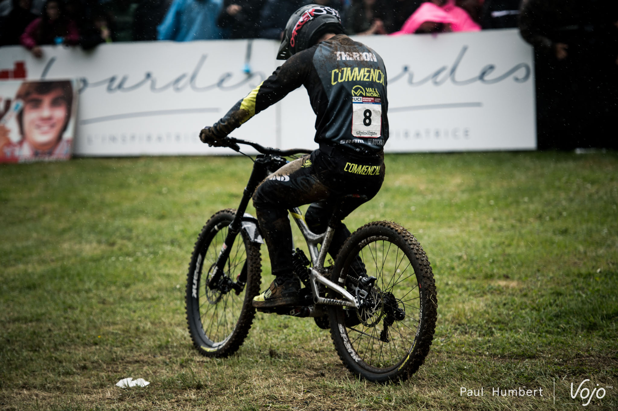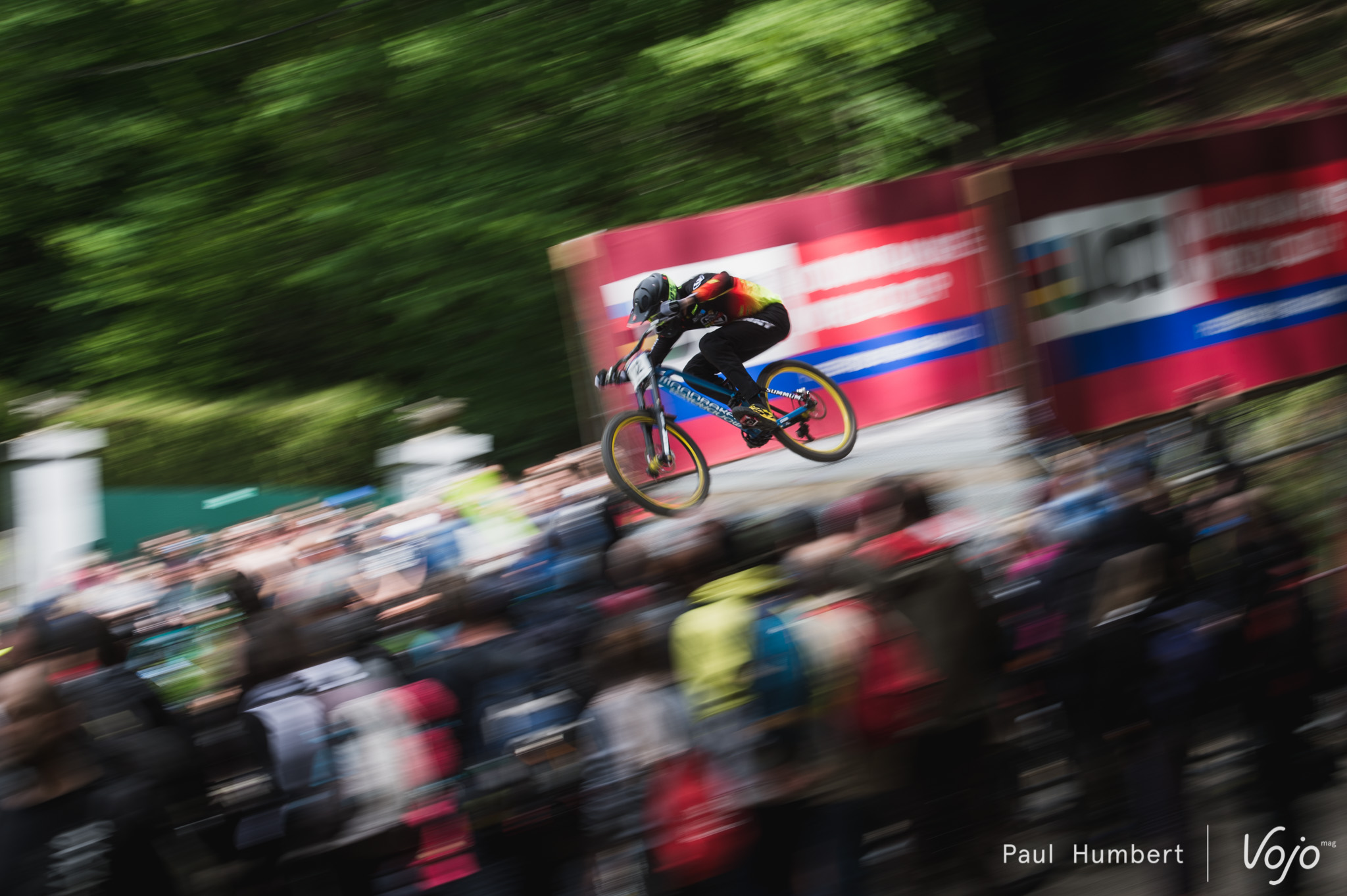 Tous les pilotes se cassent les dents sur le chrono et on comprend que plus personne ne pourra la détrôner quand des pilotes comme Danny Hart ou Rémi Thirion se voient relégués à 15 secondes dès le premier chrono intermédiaire. Aaron Gwin paie lui aussi les frais de la météo, chute et est disqualifié en remontant sur la piste plus loin qu’à l’endroit où il l’a quittée.