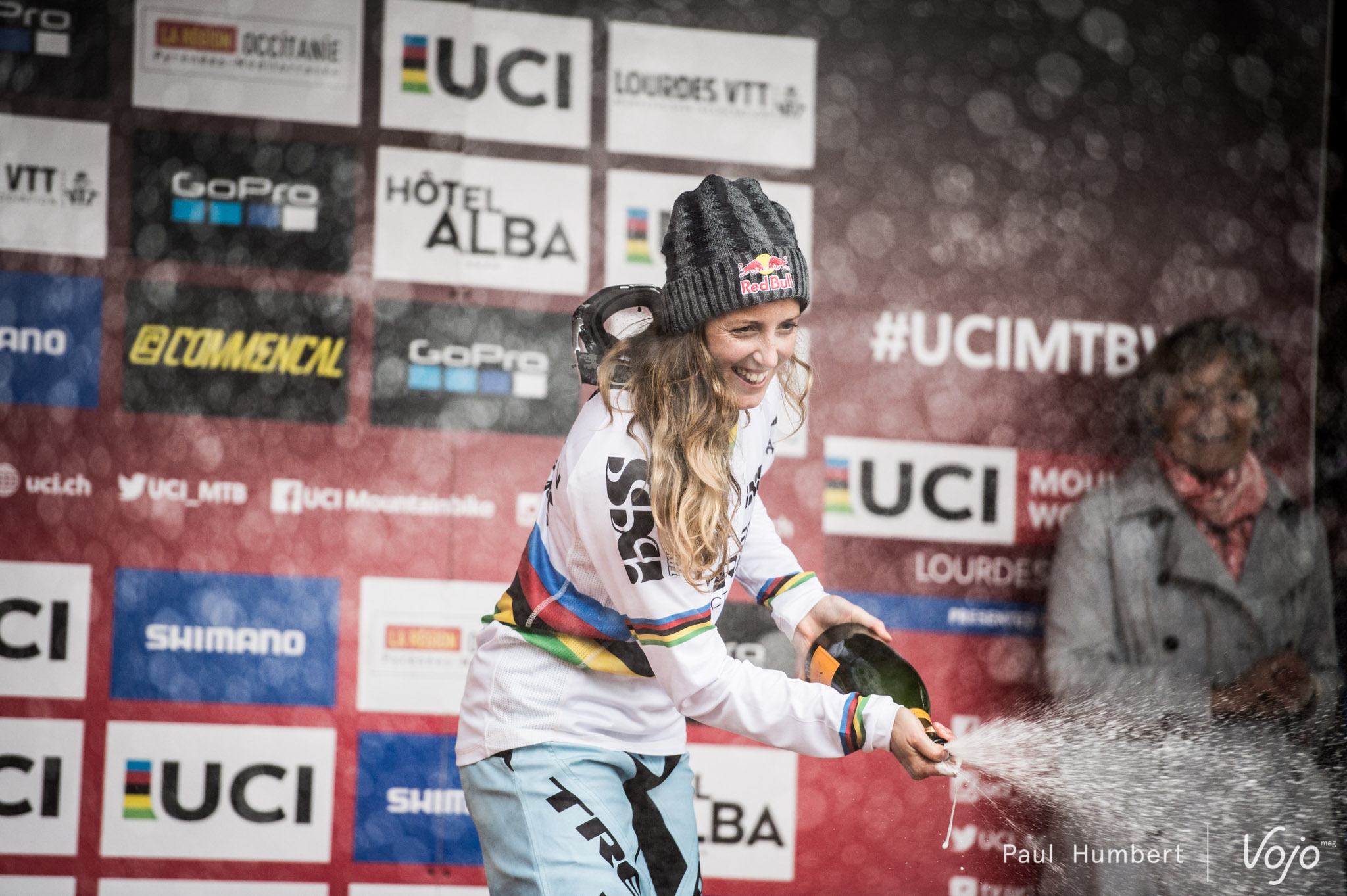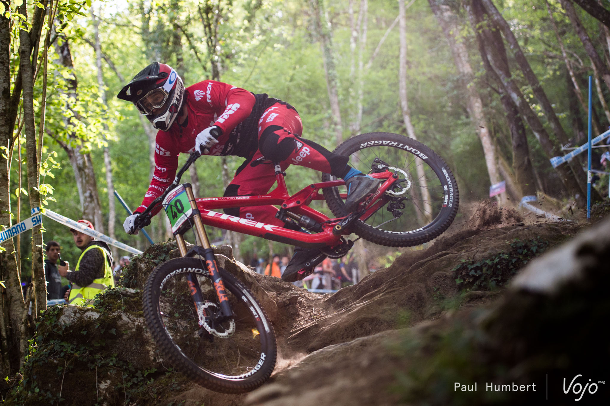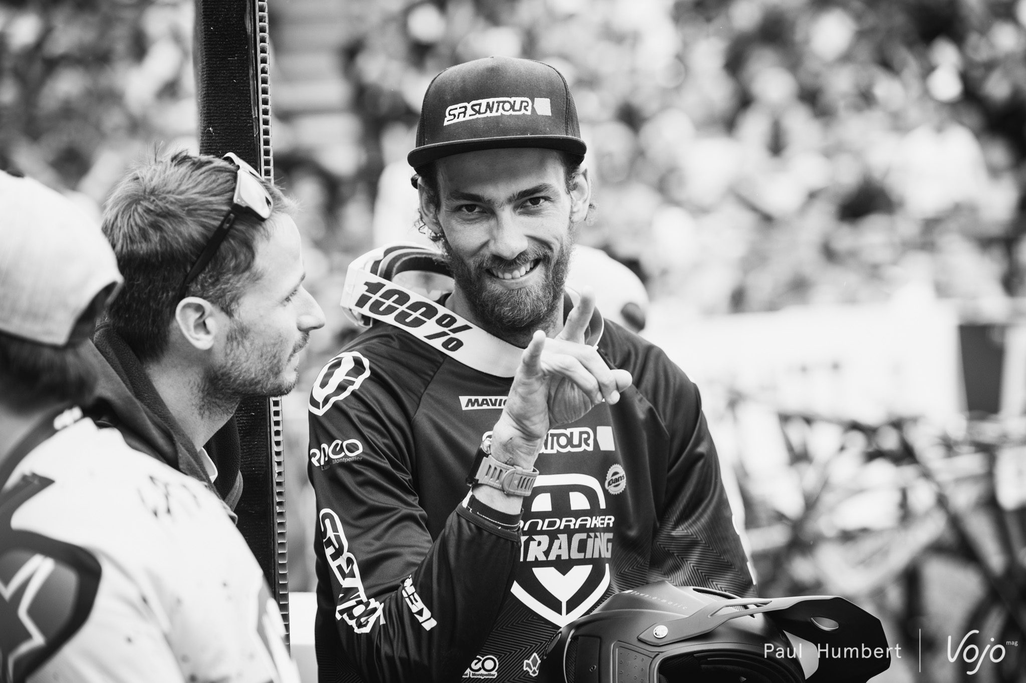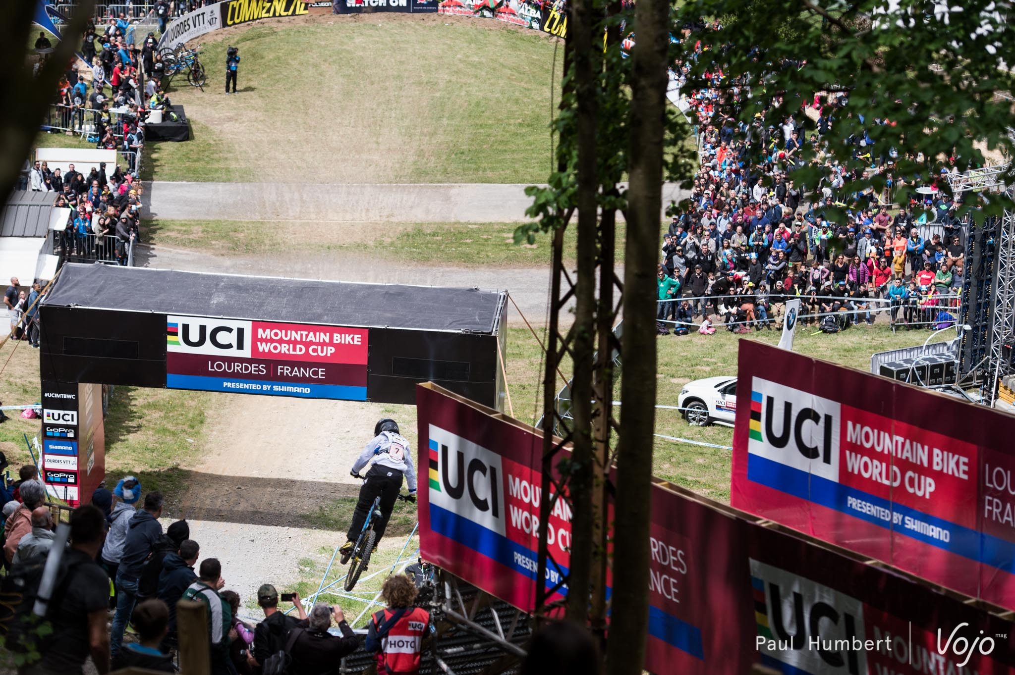 Tous les pilotes se cassent les dents sur le chrono et on comprend que plus personne ne pourra la détrôner quand des pilotes comme Danny Hart ou Rémi Thirion se voient relégués à 15 secondes dès le premier chrono intermédiaire. Aaron Gwin paie lui aussi les frais de la météo, chute et est disqualifié en remontant sur la piste plus loin qu’à l’endroit où il l’a quittée.