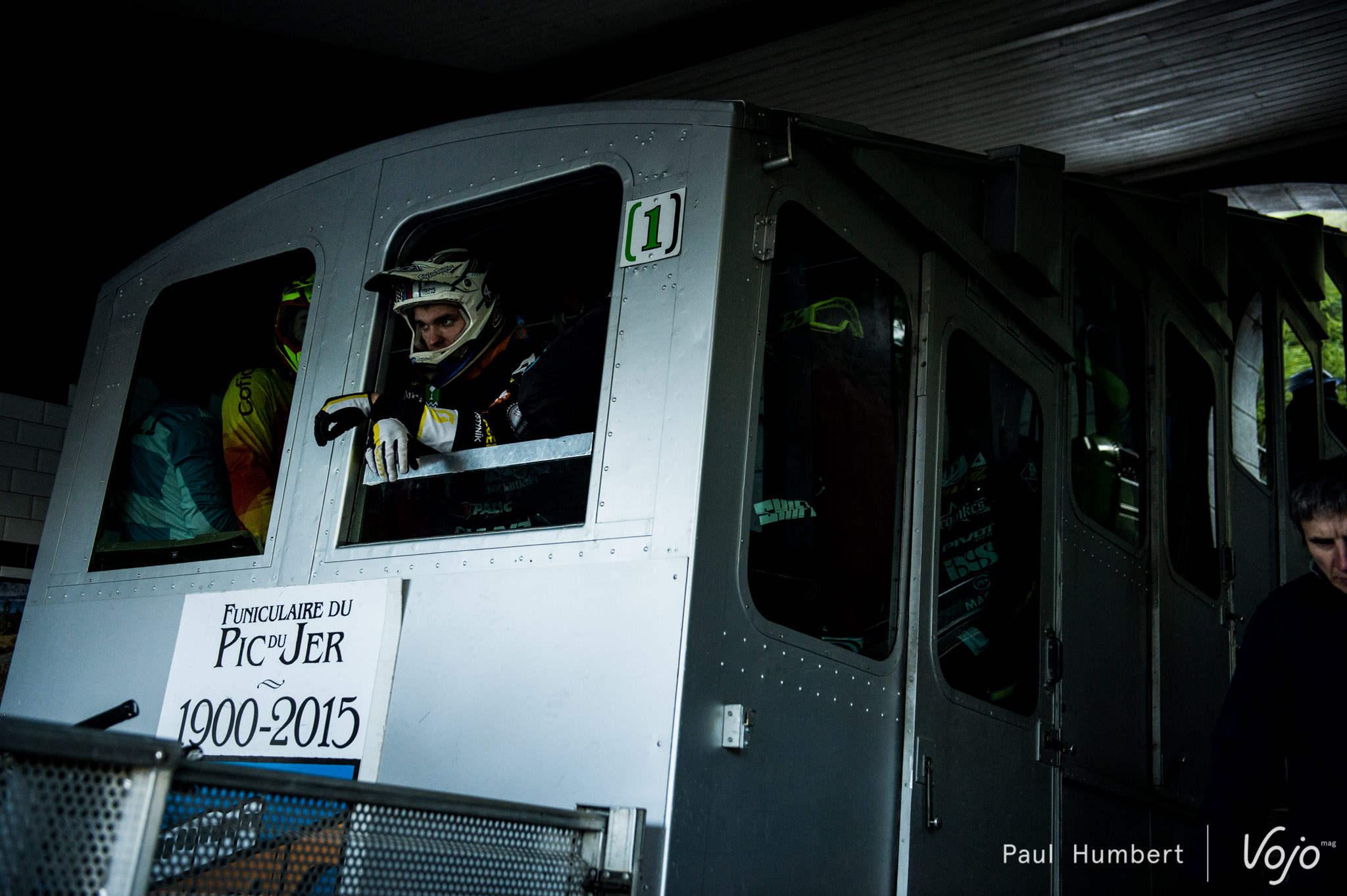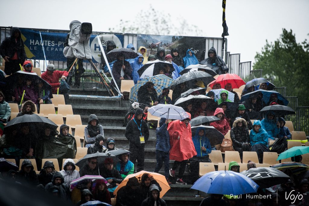 Il habite à quelques encablures de Lourdes et s’est qualifié 14ème : Thomas Estaque est un des premiers pilotes à partir sous le déluge. Dans la raquette d’arrivée, on constate sur l’écran géant que les conditions sont bien pires en haut et que la poussière et la terre se transforment en glaise. Le pilote du team Lac Blanc Commencal réalise un run impressionnant, loin du chrono, et profite du moment dans la raquette d’arrivée avec ses proches venus en nombre.