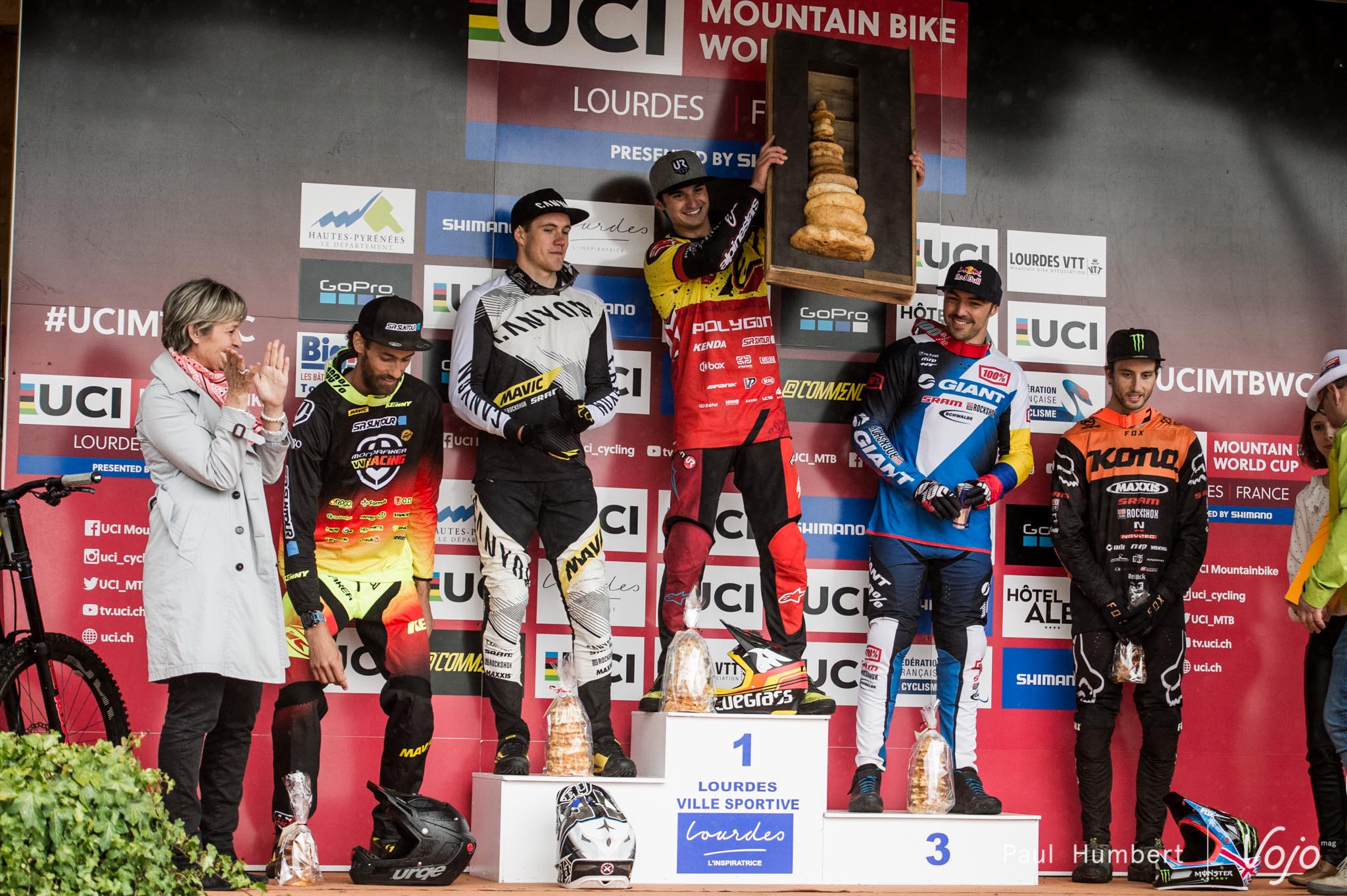 Si tout le monde avait un oeil rivé sur le ciel et les applications météorologiques, personnes n’aurait pu prédire le nom du gagnant de cette première coupe du Monde de la saison. Alexandre Fayolle s’empare de sa toute première victoire à Lourdes après un run tout en vitesse, soutenu par de fortes pluies qui ont écarté les concurrents suivants du podium. Chez les dames, Rachel Atherton continue sa longue série de victoires et ajoute une nouvelle coupe du Monde à son palmarès. Découvrez nos plus belles images du dimanche de course :