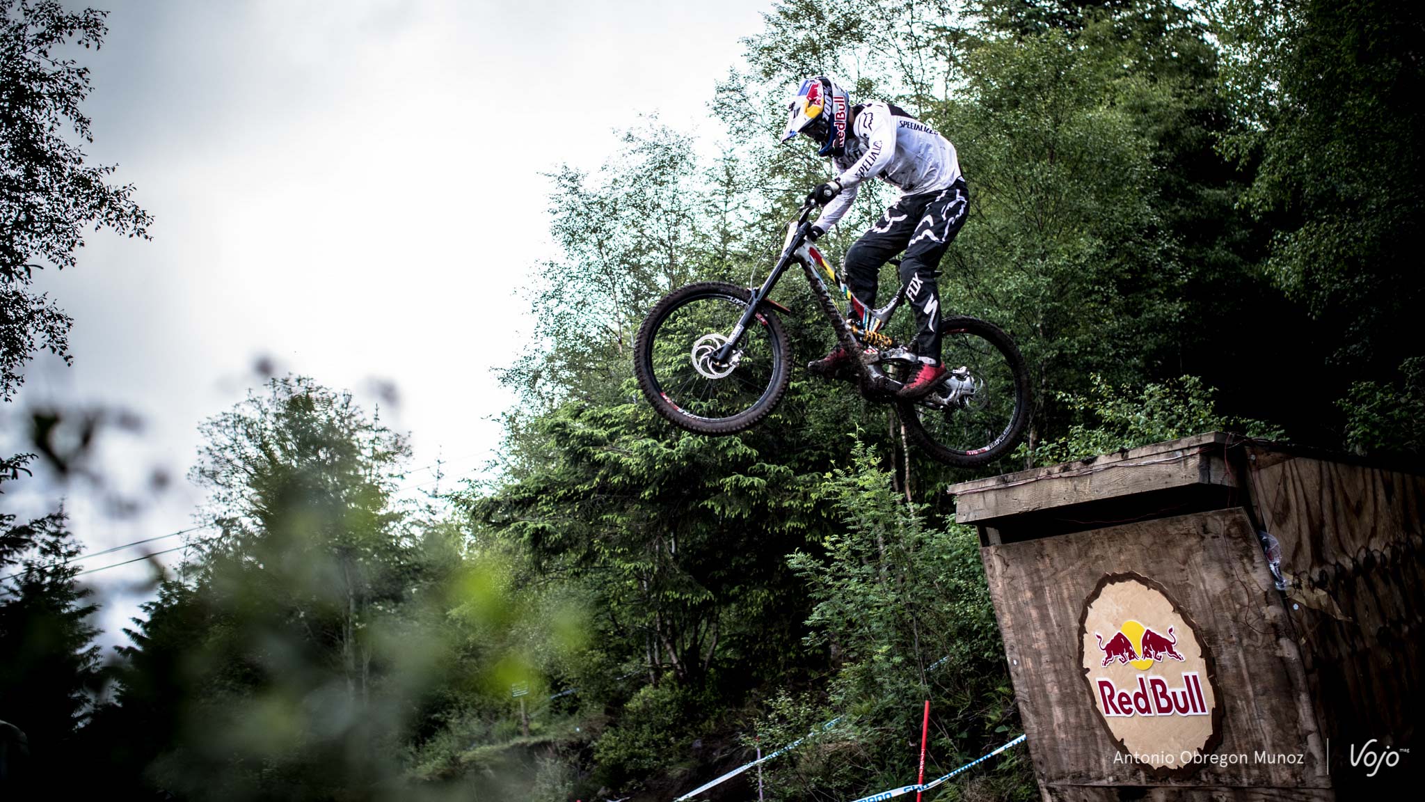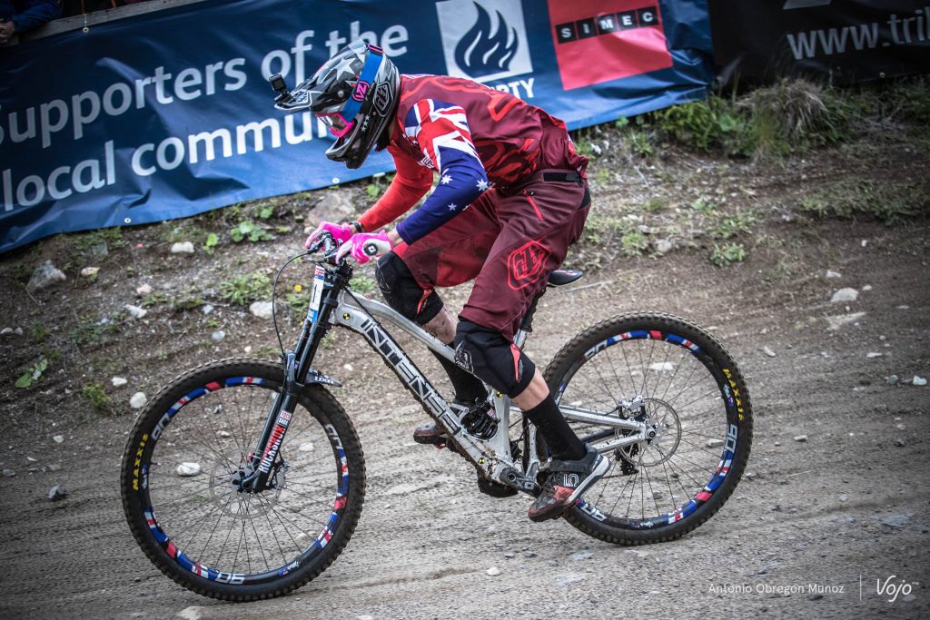 Devant tant d’enthousiasme en bas du tracé, on oubliait presque que le pilote le plus âgé, mais aussi le plus titré, du circuit est au départ. Greg Minnaar est l’athlète respecté de tous, et à raison, car c’est le Sud-Africain qui décroche le meilleur chrono sur une piste qu’il affectionne. Il était lui aussi sur son nouveau vélo équipé de roues de 29 pouces.