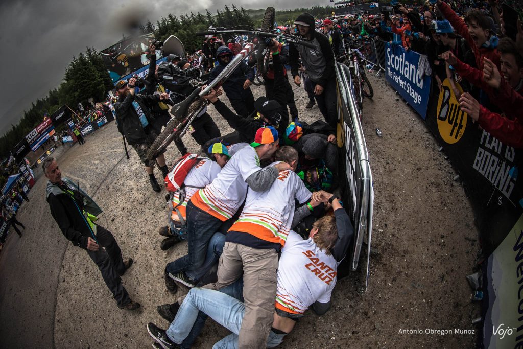 Toute son équipe et des fans lui sautent dessus pour célébrer une légende du VTT de descente. En plus de ses nombreuses victoires, l’histoire de notre sport se souviendra qu’il aura été le premier descendeurs à gagner une coupe du Monde au guidon d’un 29 pouces.