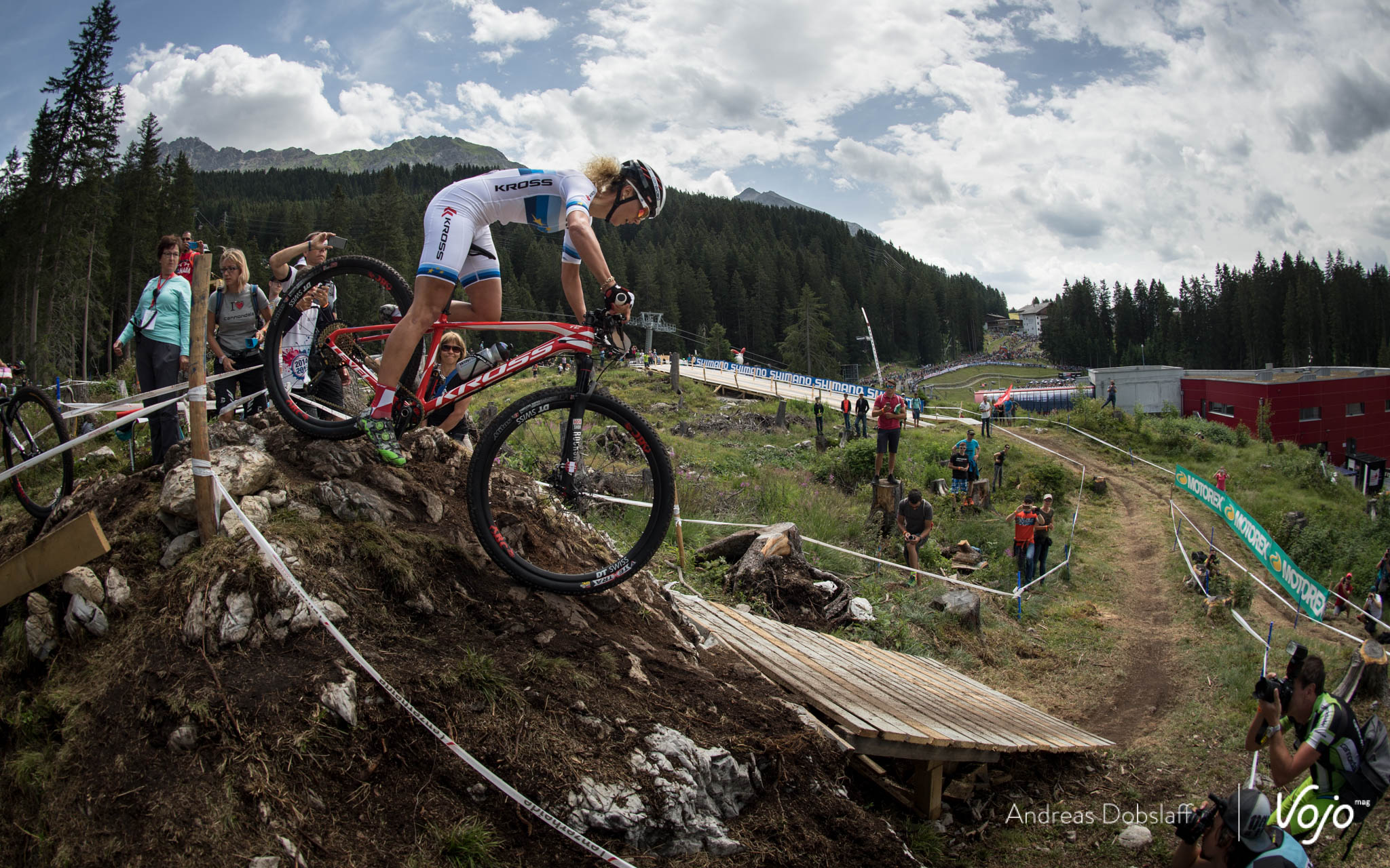 Il faut dire aussi que le parcours a été légèrement remanié pour offrir encore plus de visibilité au public et, pour l’avoir roulé en 2016 lors d’une présentation, on peut vous dire que c’est un parcours de pur vtt où les obstacles artificiels sont rares. Malgré quelques passerelles pour franchir des portions trop difficiles à aménager, la nouvelle mouture reste dans la même veine, entre rochers, humus et racines… et c’est tant mieux. Tiens, en passant, observez bien cette image : c’est la seule dont nous disposons avec Annika Langvad. Grippée, elle a préféré renoncer.