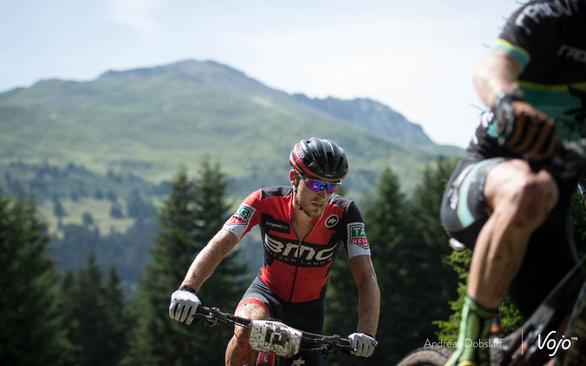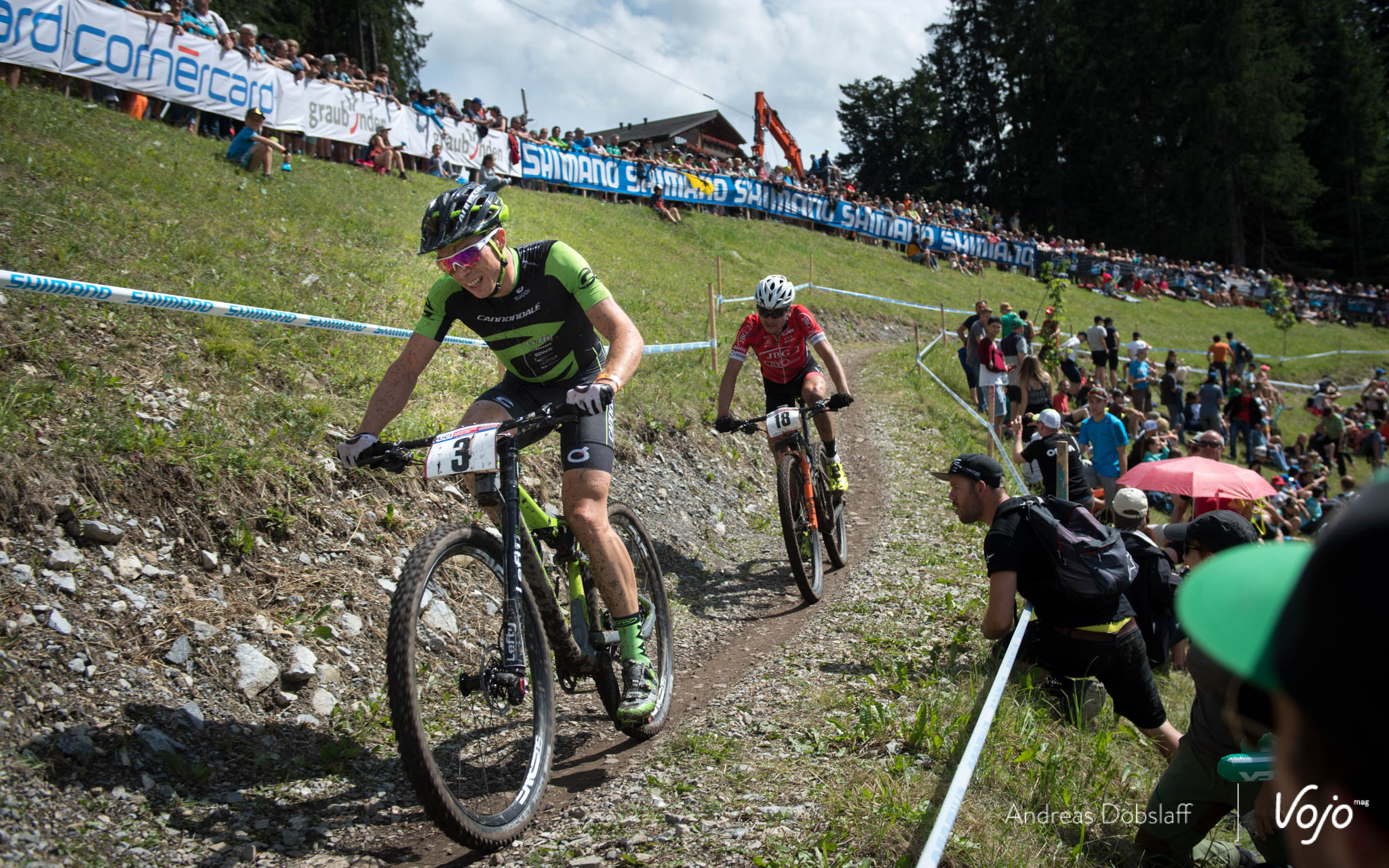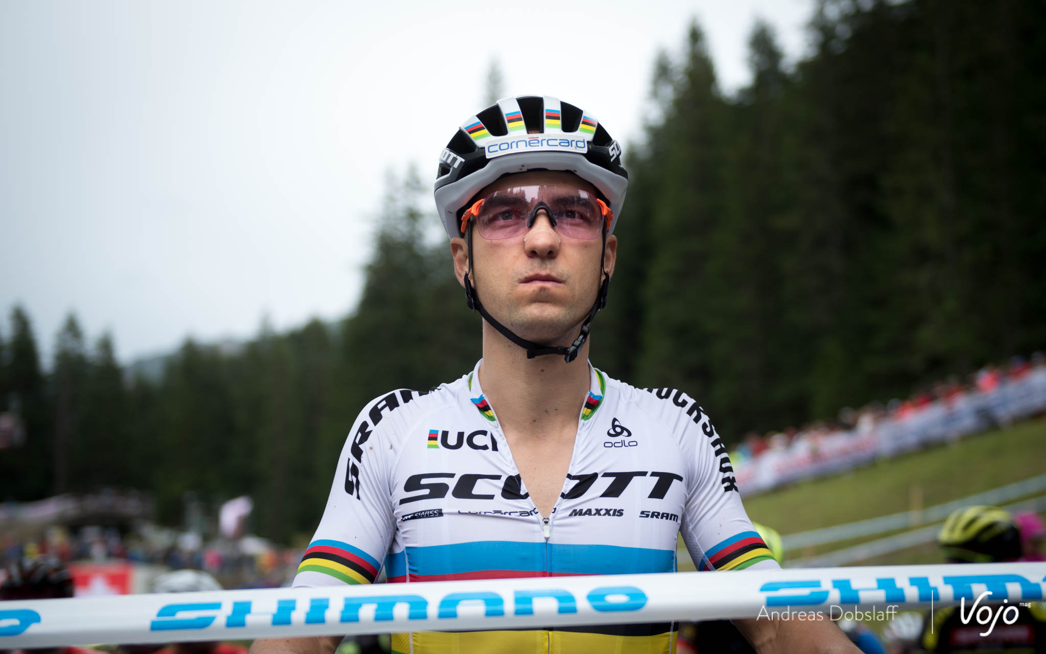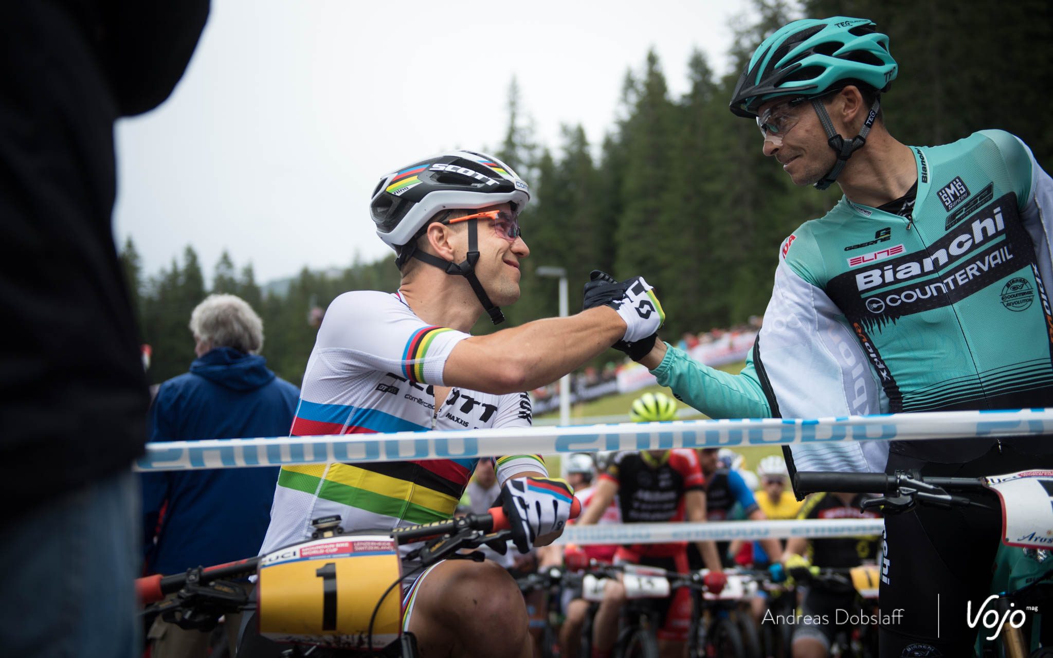 Pendant qu’il « serre des pinces » à ses voisins, dont Stéphane Tempier, Nino Schurter observe du coin de l’oeil son nouveau « meilleur ennemi » en l’absence d’Absalon : Mathieu van der Poel. Alors qu’il n’était pas sûr de participer à plus d’une coupe du Monde de VTT cette année, la star du cyclo-cross semble y prendre goût. Reste que, comme son voisin sur la ligne, Jordan Sarrou, nous sommes curieux de voir ce qu’il va pouvoir faire après sa contre-performance de Vallnord.