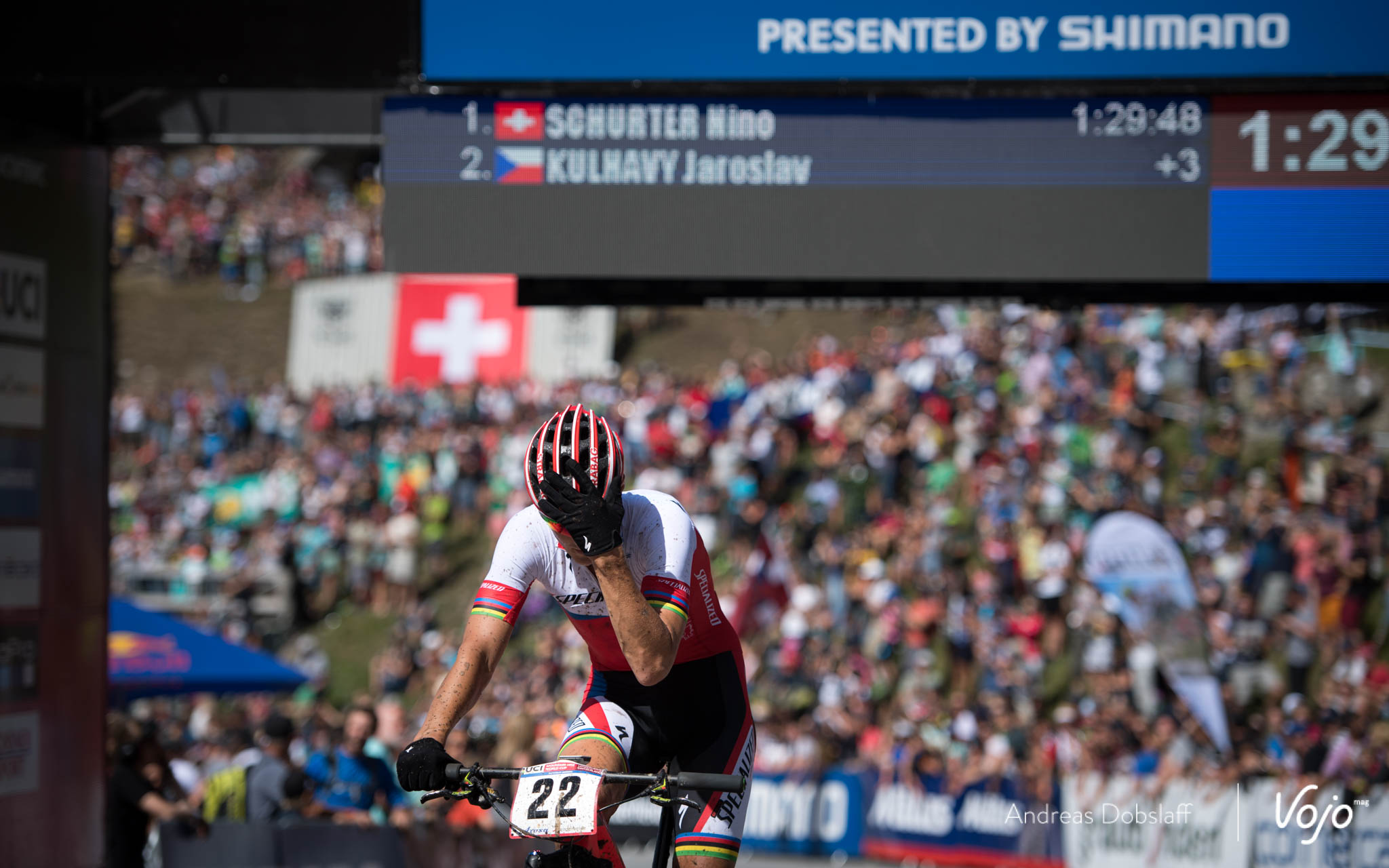 … Nino Schurter pense pouvoir gérer sur les racines glissantes. Dans les derniers hectomètres, il se retourne, ne voit personne, mais les spectateurs perçoivent la menace : Kulhavy est juste derrière et si le Suisse ne le voit pas ce n’est qu’un effet d’optique.