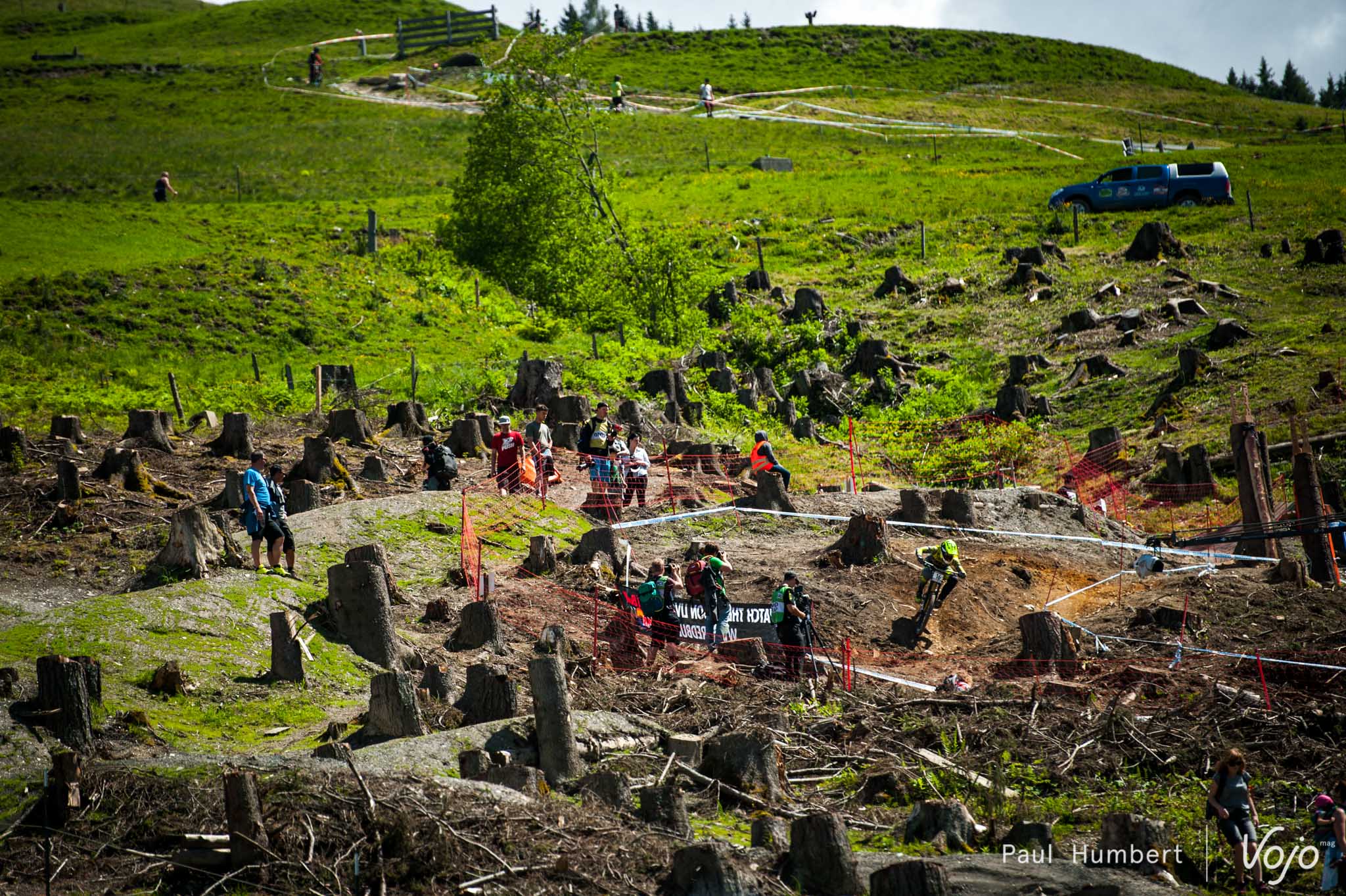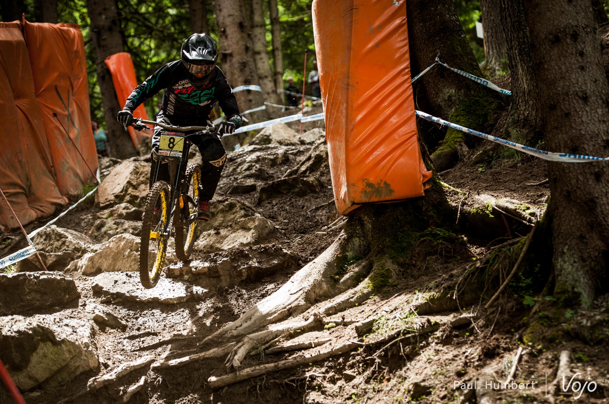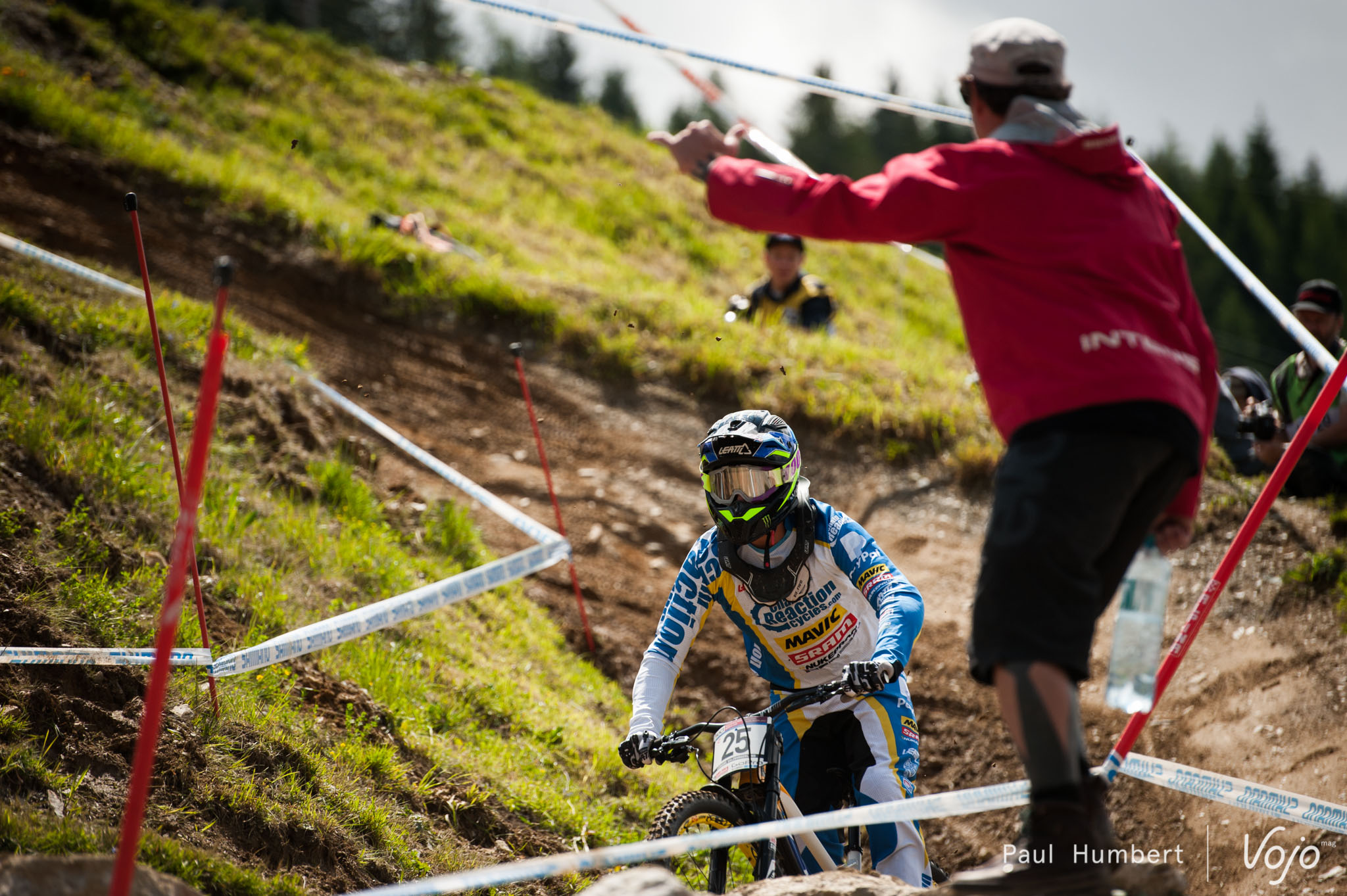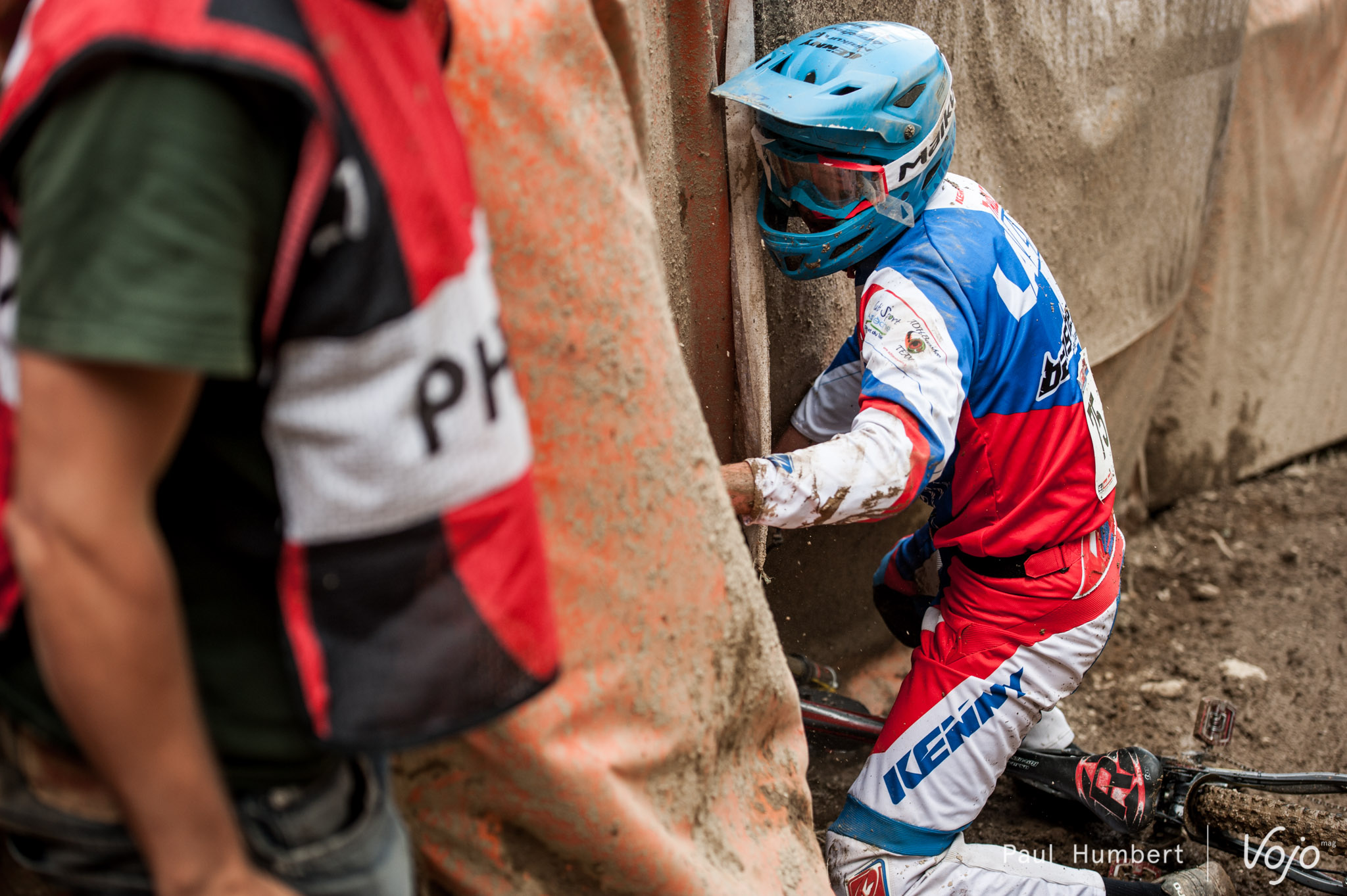 Dimanche matin, 8h. Les Dames et les Juniors s’entraînent une dernière fois sur la piste avant de redescendre attendre leur run de finale. Le terrain est encore humide mais la terre commence à sécher.