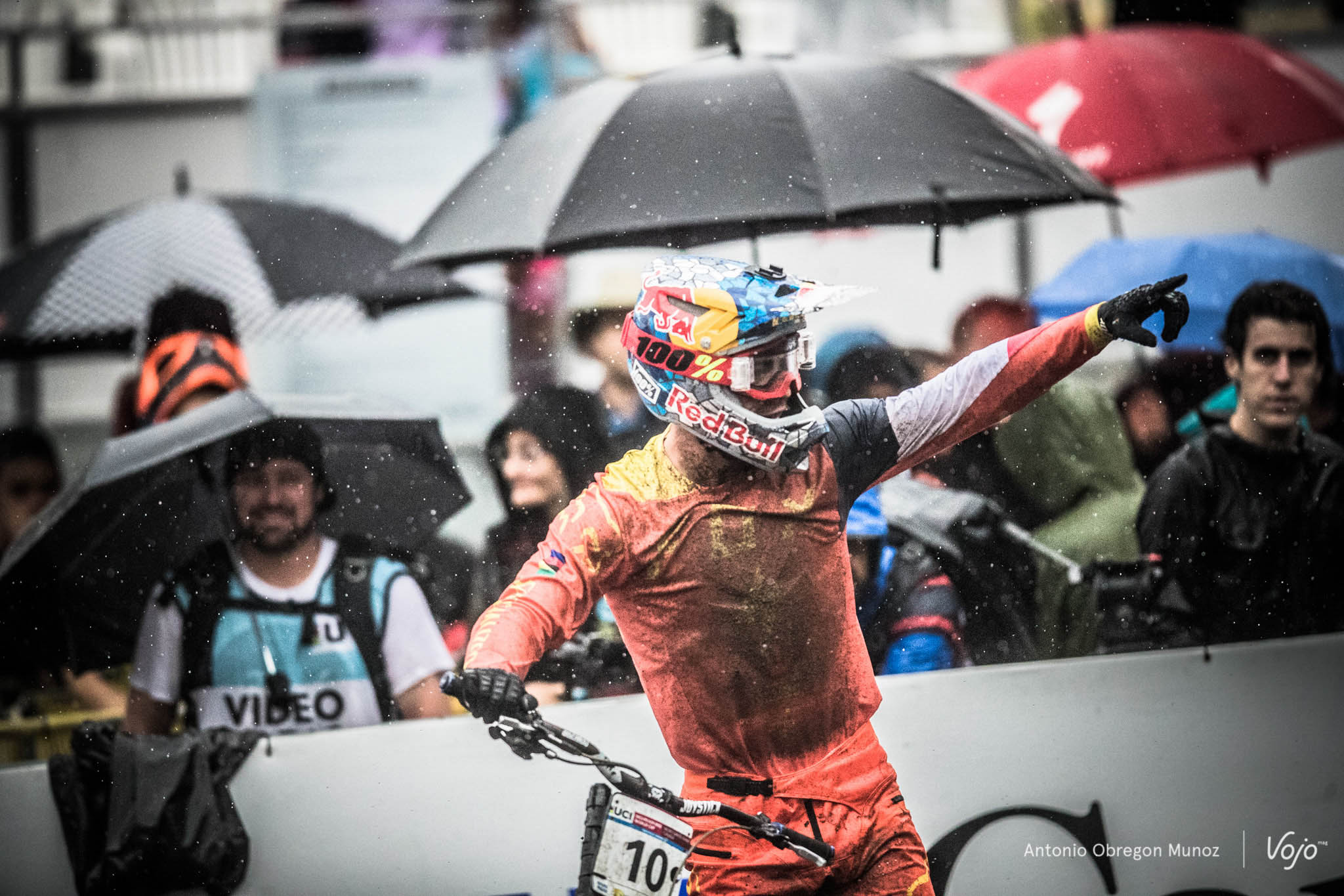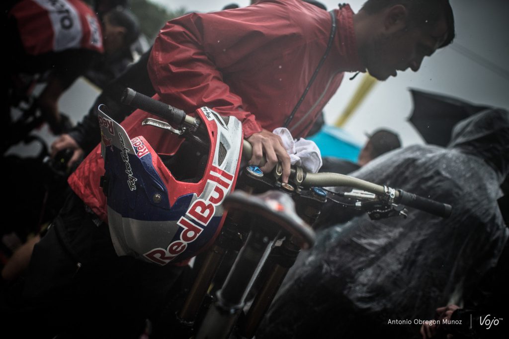 Dernier à partir, tout le monde a les yeux rivés sur l’américain Aaron Gwin. On connait son talent, mais tout le monde connait également la difficulté de la piste et de cette météo qui a dramatiquement changé les règles du jeu.