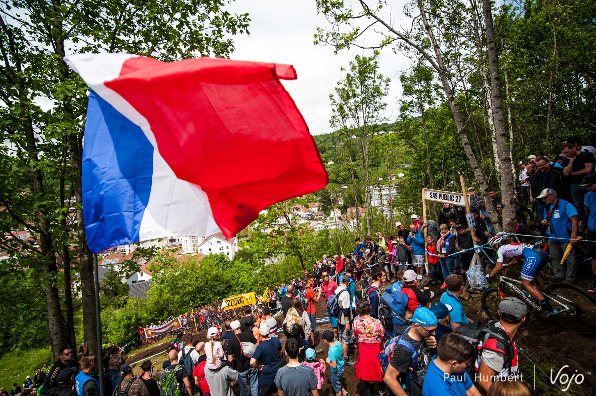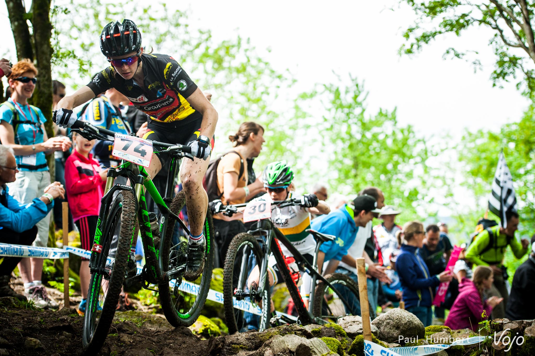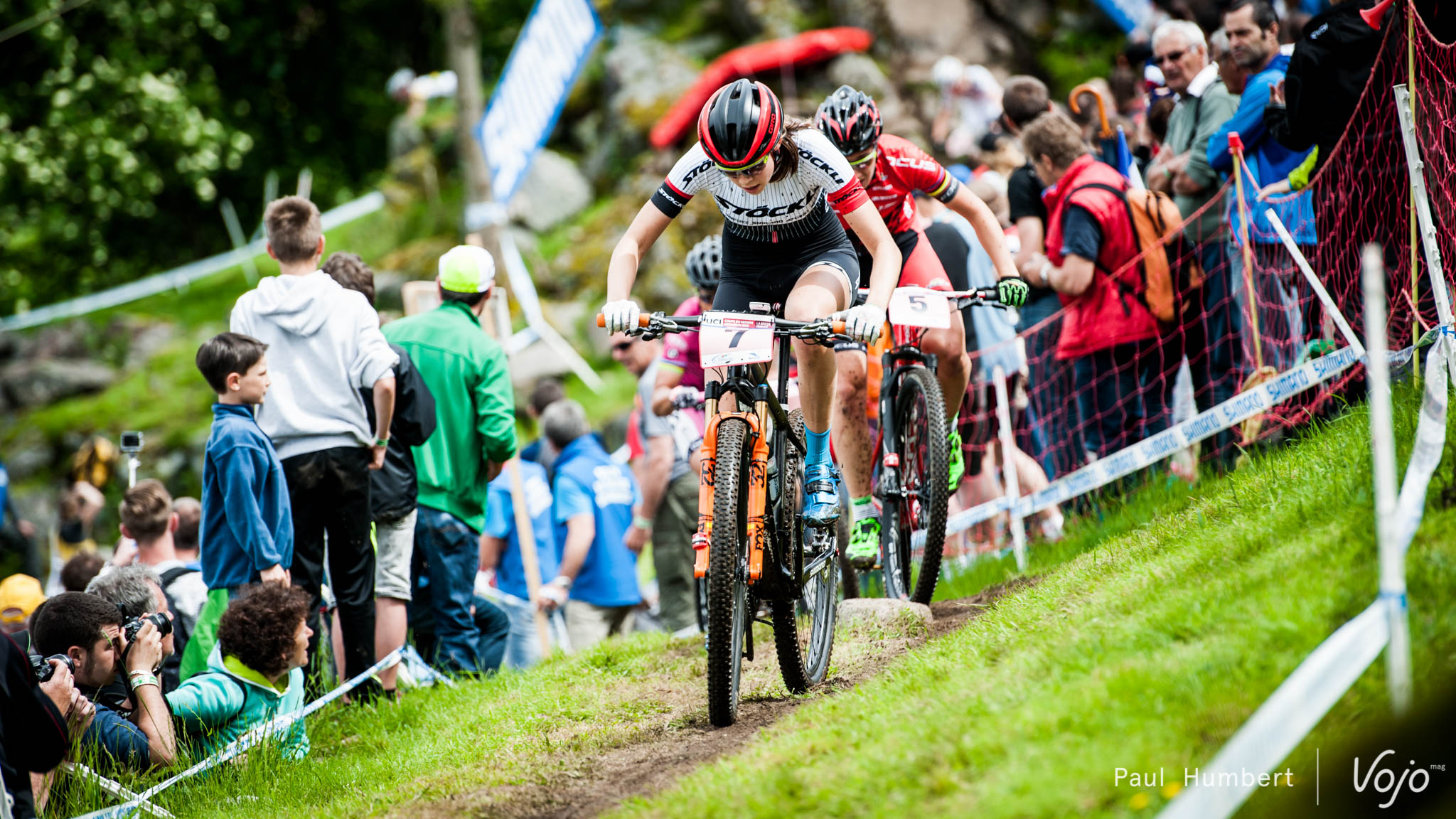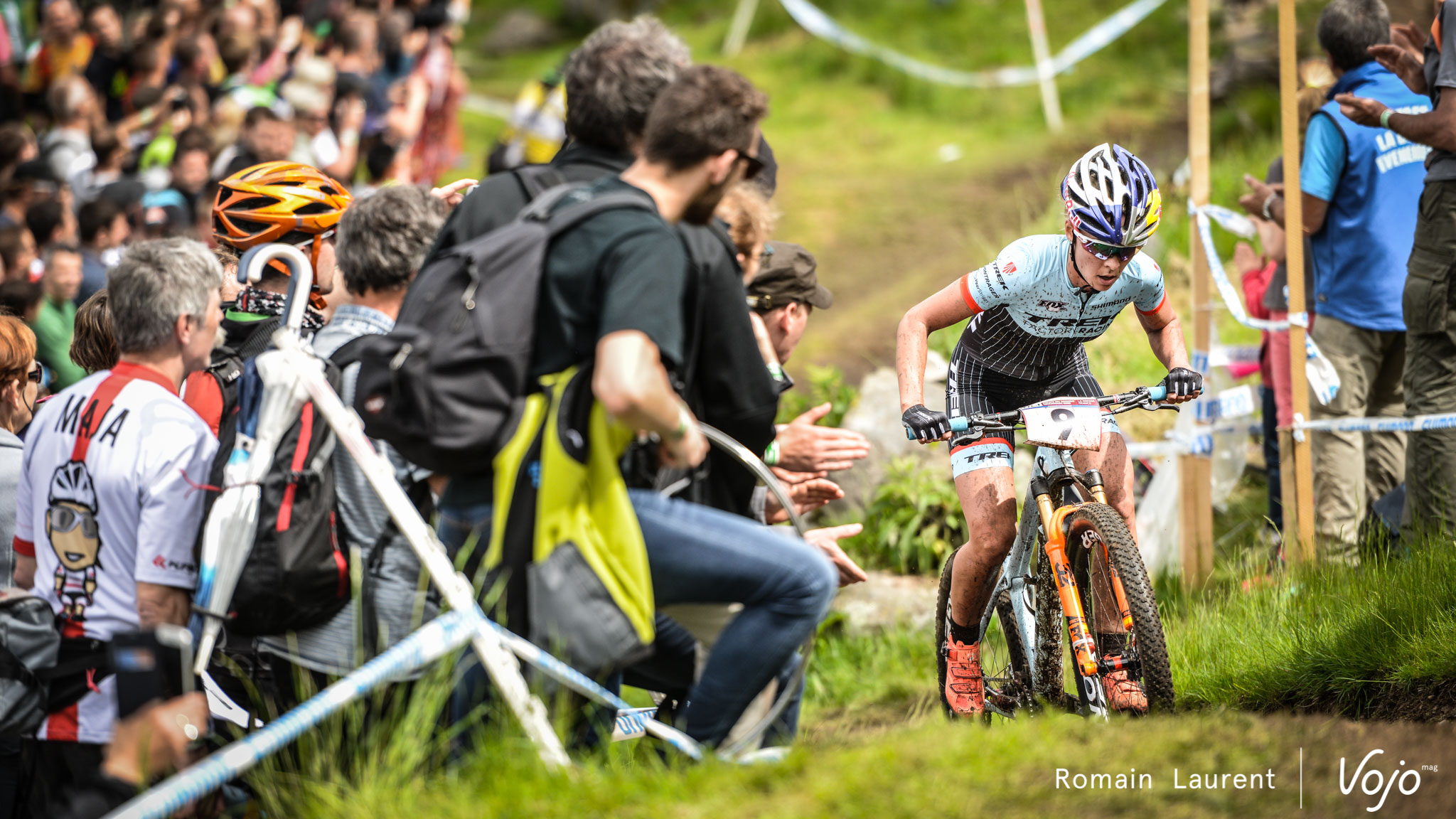 En noir et jaune, Perrine Clauzel passe à la 22ème position au quatrième tour : « Je me suis débloquée dans les trois derniers tours. J’étais vraiment très bien dans la descente. J’ai adoré, il y avait un public de fou. Au début, au start, je me suis fait serrer et j’étais loin. Je ne me suis pas affolée, je me suis dit que ça allait revenir et que j’allais pouvoir remonter du monde. Je me suis vraiment sentie mieux sur la fin. J’ai monté les bosses au tempo pour que mon coeur ne s’emballe pas et que les jambes suivent. Je voyais des filles devant moi et je me suis dit qu’il fallait que je les rattrape. J’ai réussi à battre la belge Githa Michiels que je rattrapais en bas des descentes et qui repassait devant en montée. Personne ne m’a vraiment gênée et à la fin j’ai réussi à rattraper deux coureuses supplémentaires. »