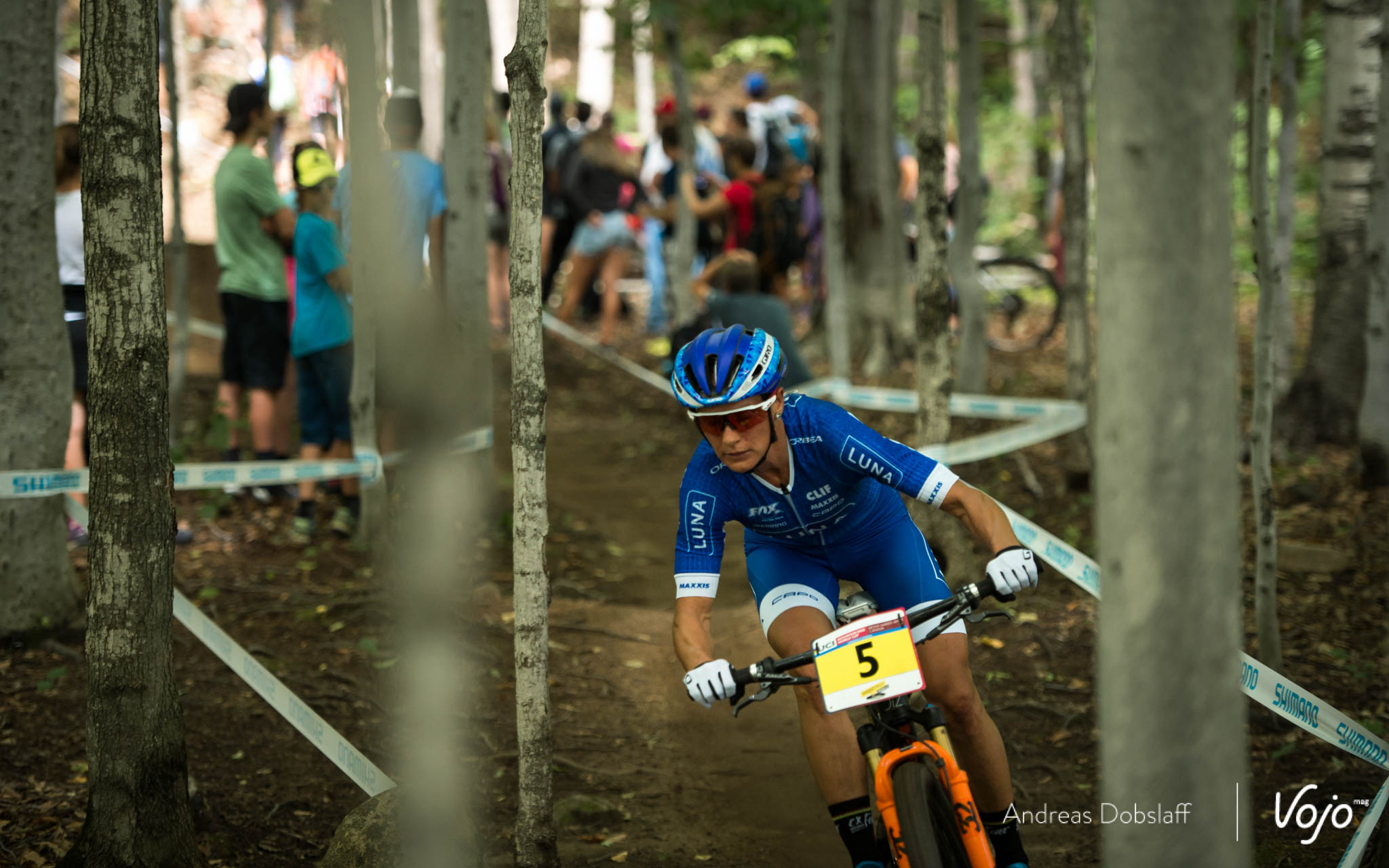 Certaines scènes au départ nous rappellent que le VTT est un sport mécanique et que chaque machine a ses faiblesses. Au pied du podium nous retrouvons Chloe Woodruff. L’Américaine est la surprise de la course. Elle devance Tanja Zakelj et Rebecca Henderson. Yana Belomoina et Lea Davison complètent le top 10.