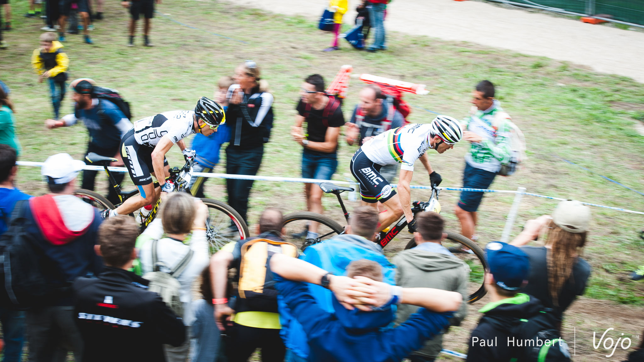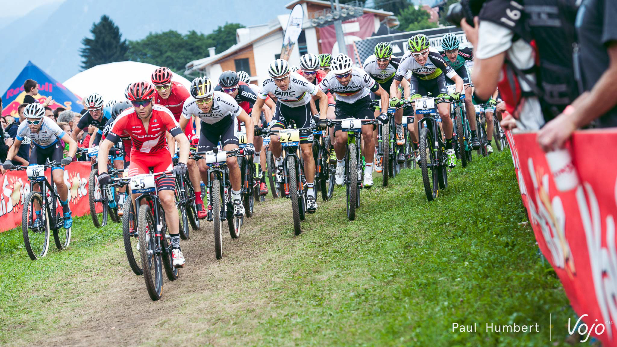 Sur la ligne, Julien Absalon est souriant. Il sait que la forme est au rendez-vous. Fidèle à son habitude, Maxime Marotte se concentre profondément. Quant à Ralph Naef, il savoure ces instants très particuliers : il s’agit de sa dernière Coupe du Monde ! Sur son cintre, en plus d’un petit canard/klaxon, une petite fleur collée sur sa plaque de cadre rappelle qu’il y a un an tout juste, Annefleur Kalvenhaar nous quittait suite à un dramatique accident lors de la course XCE. Tous les coureurs ont arboré ce symbole sur leur plaque pendant le week-end en guise d’hommage.