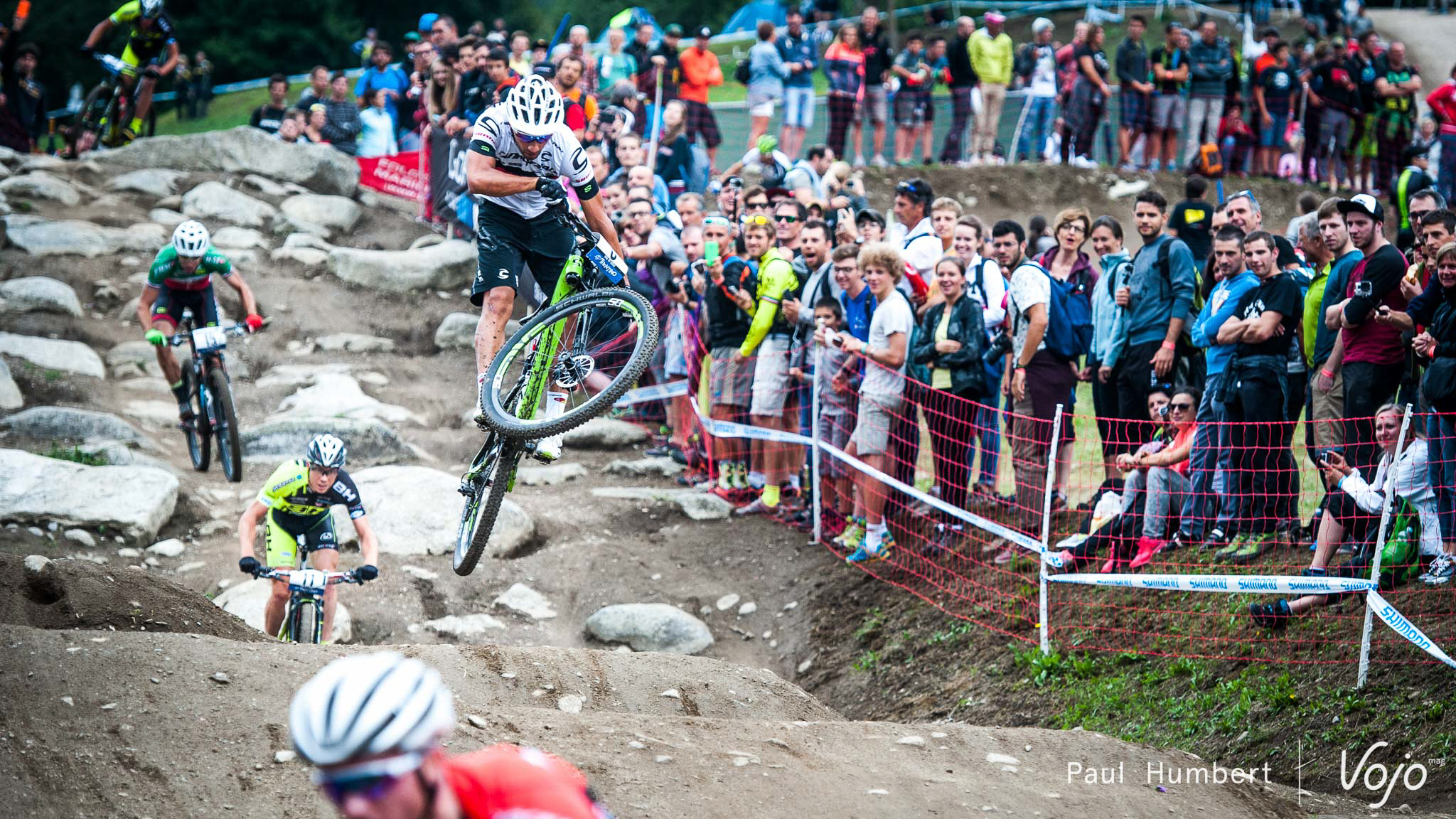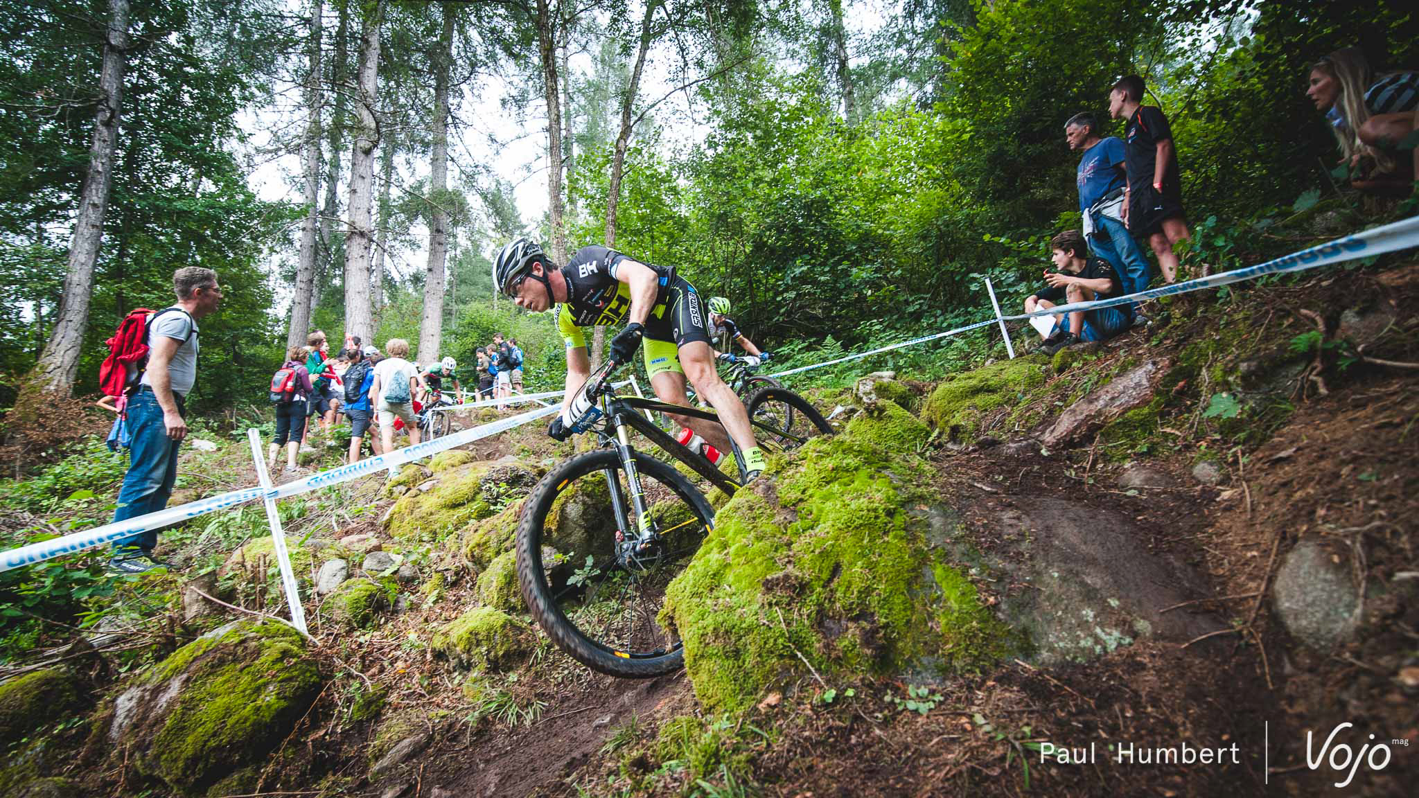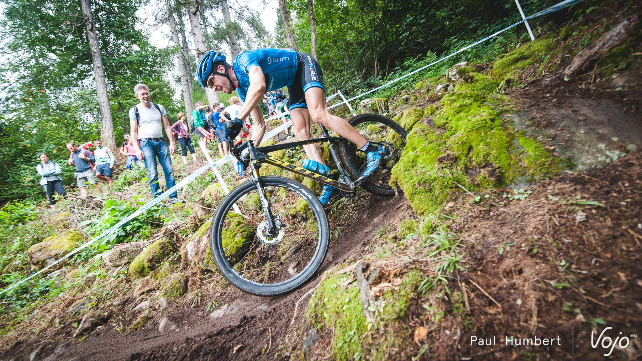 Juste après le fameux pierrier, plusieurs grosses doubles bosses viennent rappeler que la parcours XC emprunte une partie du final de la piste de 4X. On parle souvent du style de Nino Schurter, mais Manuel Fumic n’est pas mal non plus dans son genre ! Derrière lui, Maxime Marotte observe les frasques du pilote Cannondale qui, après son énorme performance de Windham (3e), termine cette fois 12e.