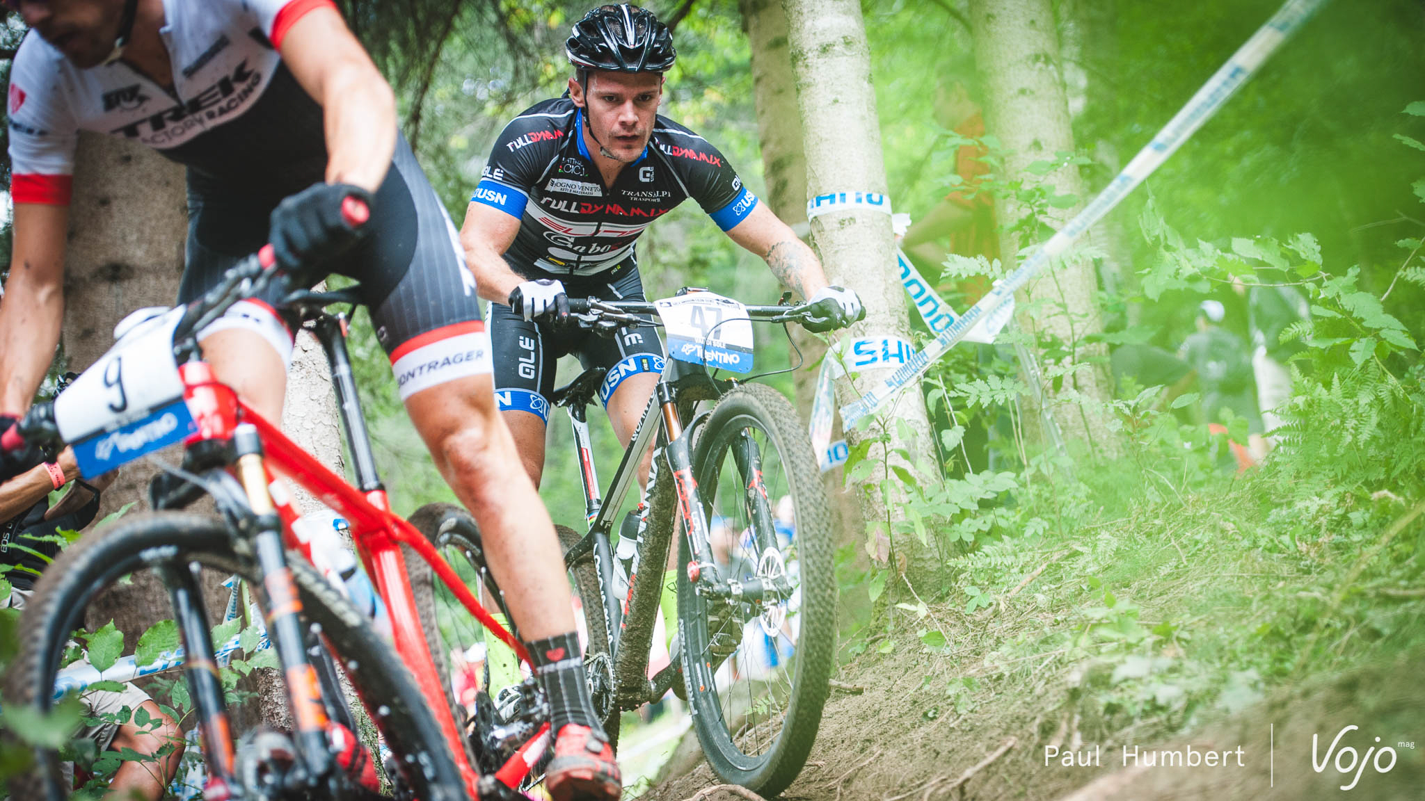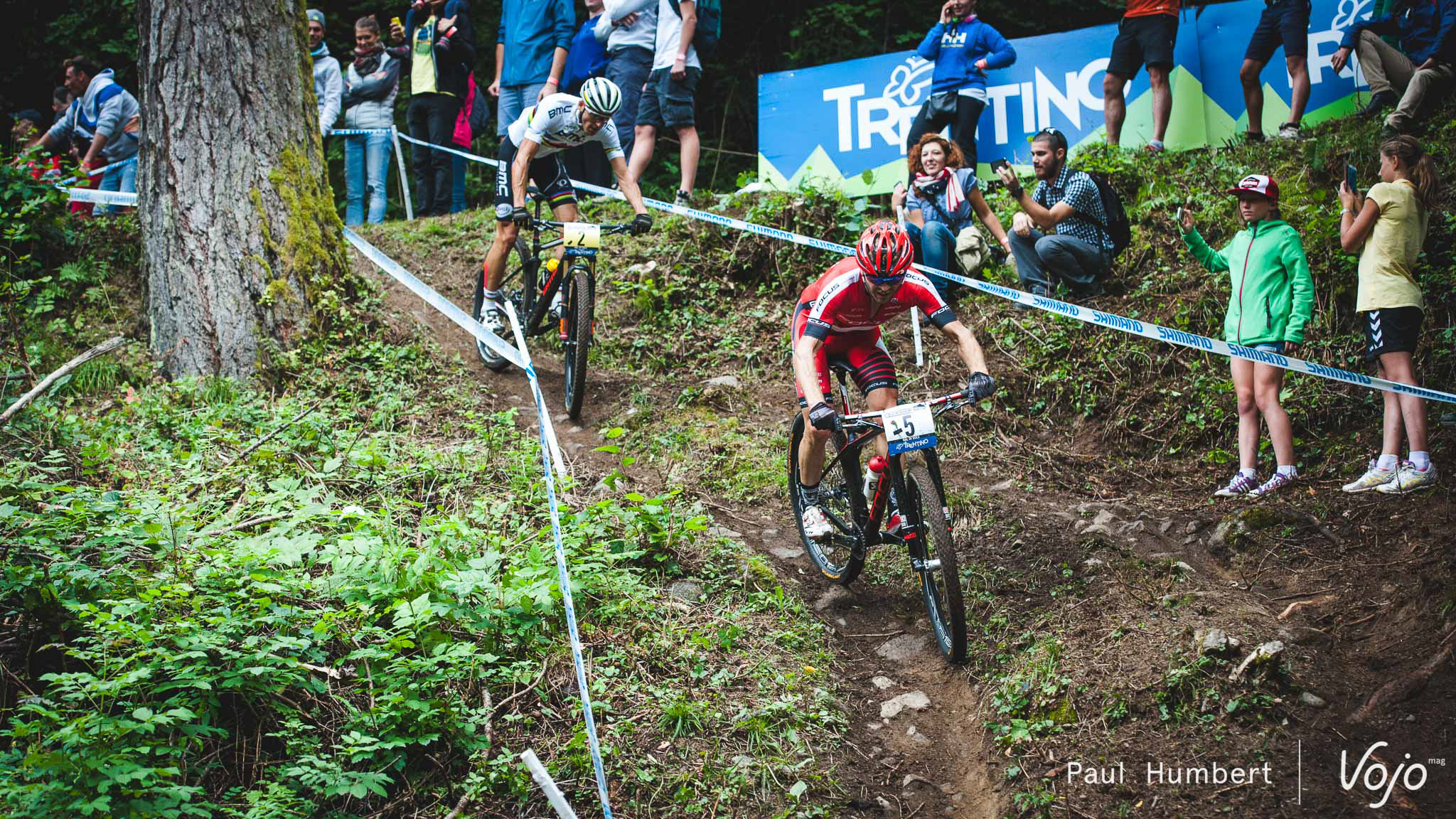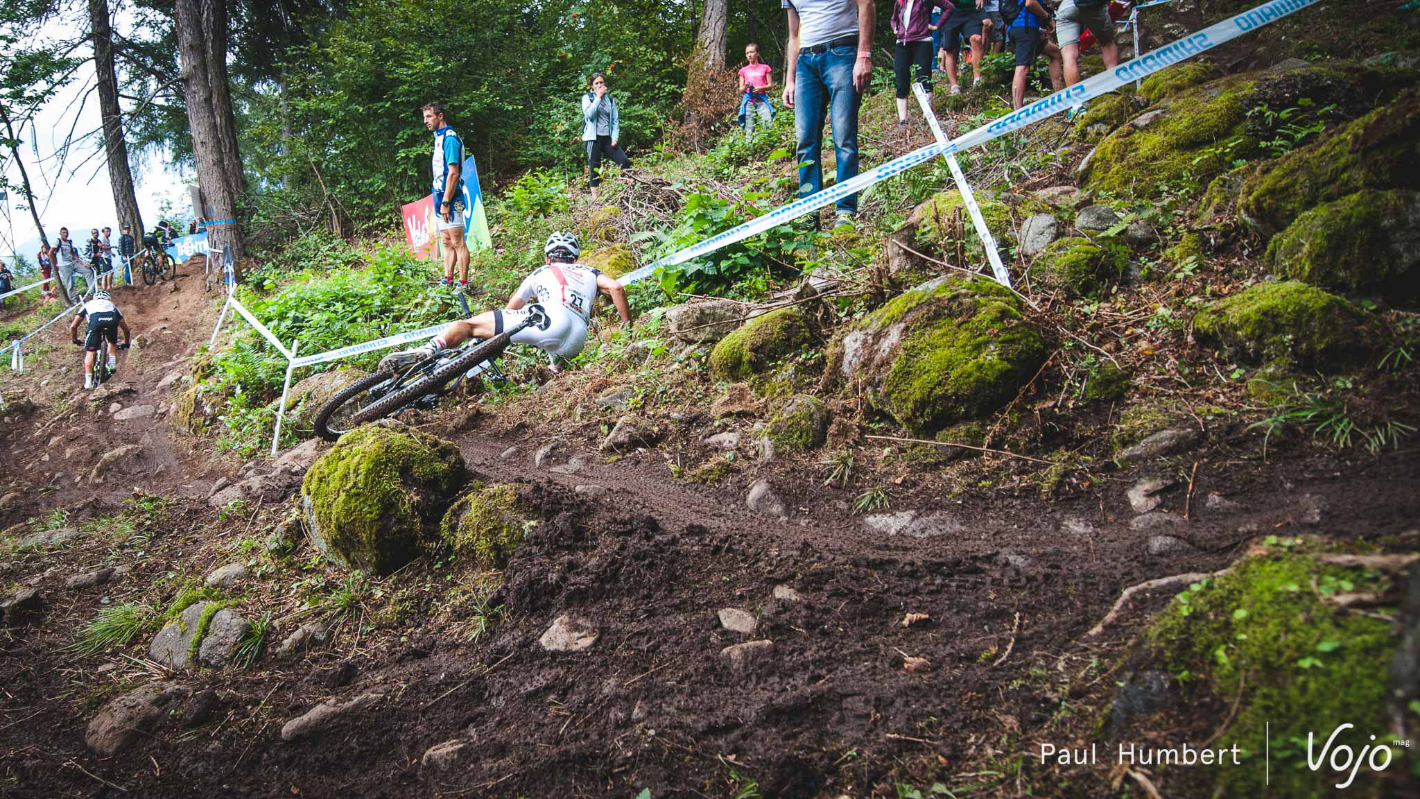 Juste après le fameux pierrier, plusieurs grosses doubles bosses viennent rappeler que la parcours XC emprunte une partie du final de la piste de 4X. On parle souvent du style de Nino Schurter, mais Manuel Fumic n’est pas mal non plus dans son genre ! Derrière lui, Maxime Marotte observe les frasques du pilote Cannondale qui, après son énorme performance de Windham (3e), termine cette fois 12e.