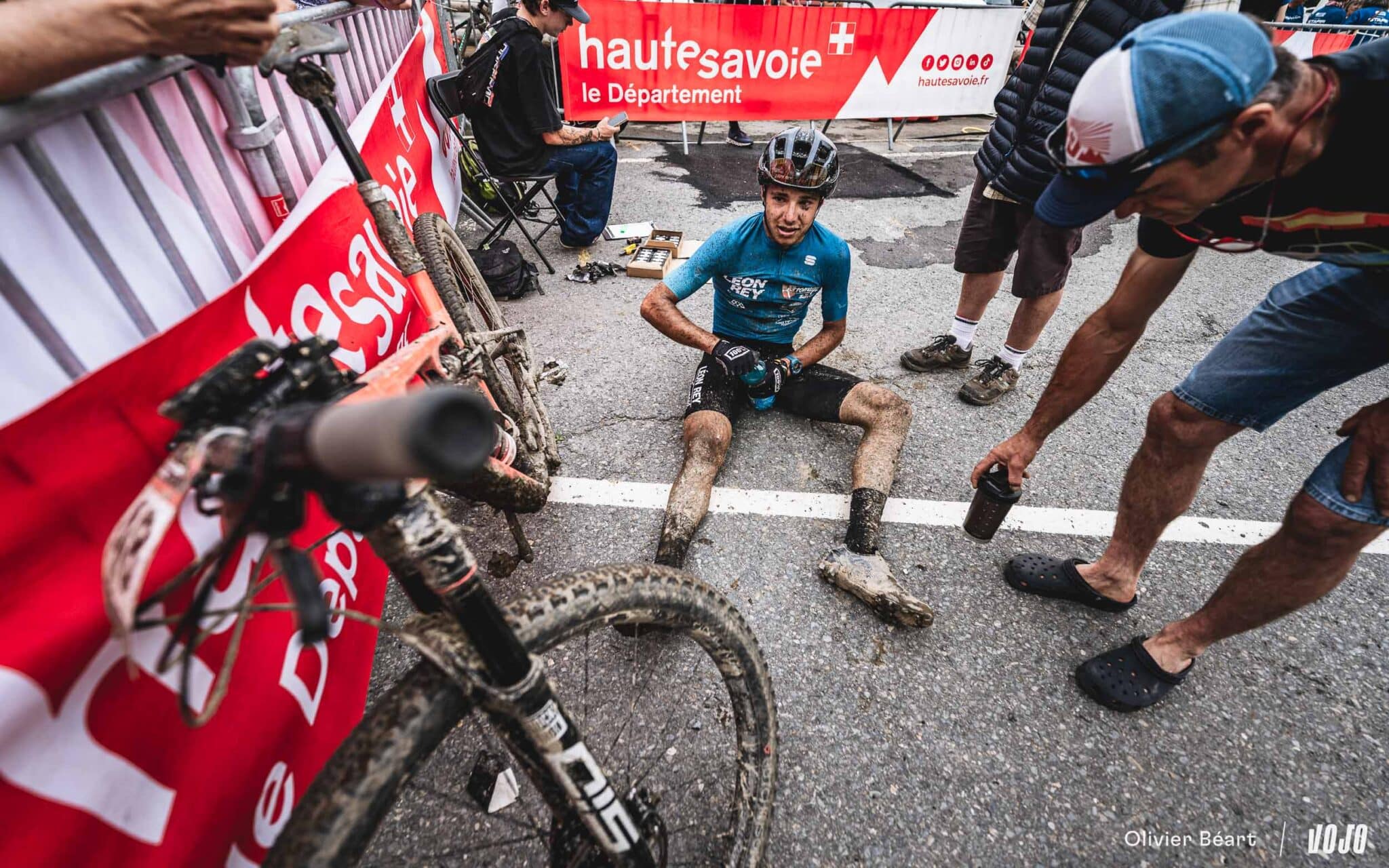 Dans cette ambiance de fin du monde qui cache le mont Blanc, Rémi Groslambert pointe le bout de son pneu avant. Il est dans le dur, mais l’ancien vainqueur de la MB 140 km tente de profiter de ses qualités de grimpeur pour sauver sa place dans le top 30.