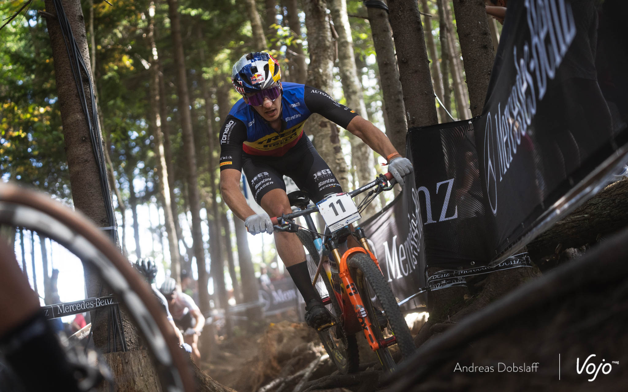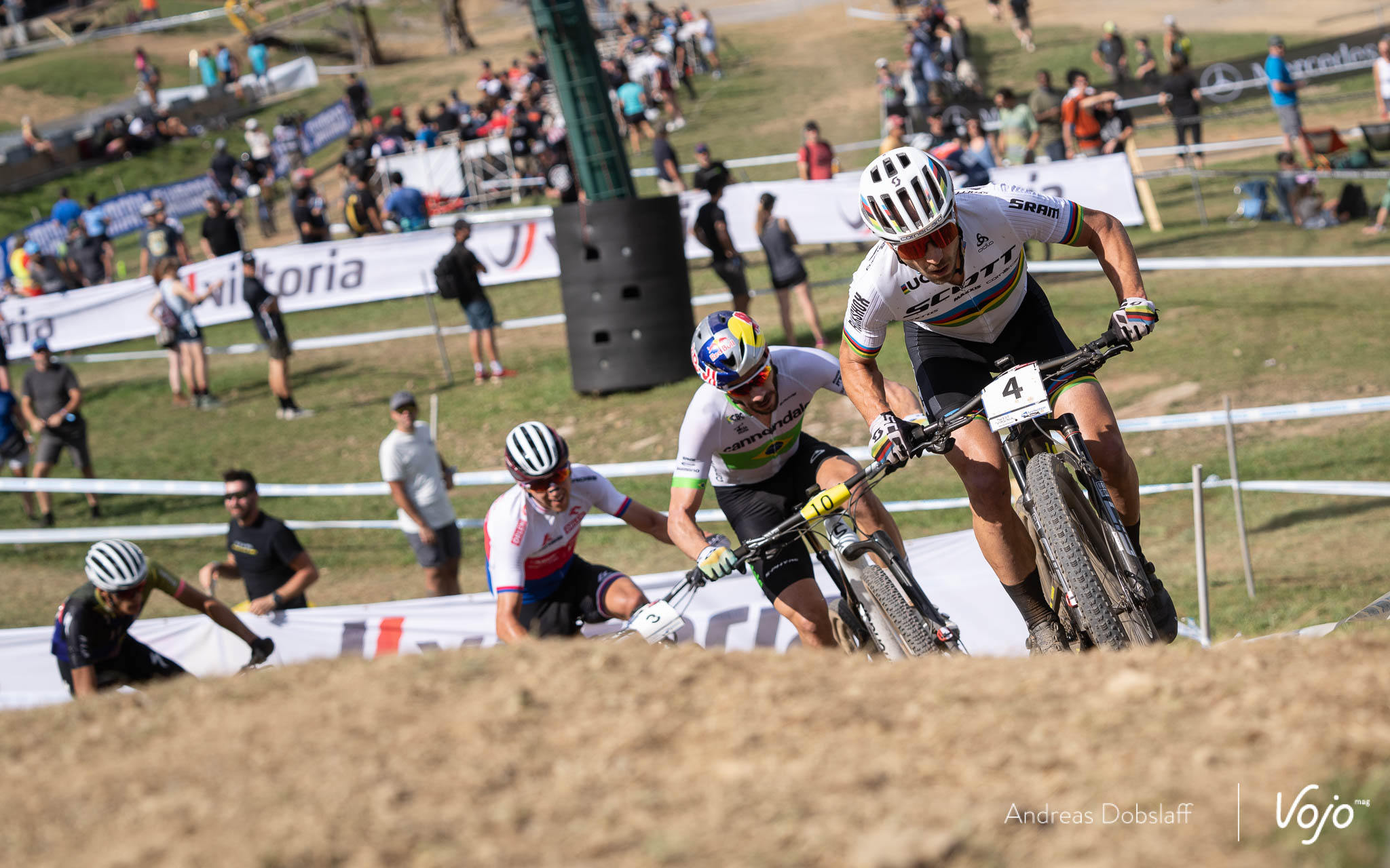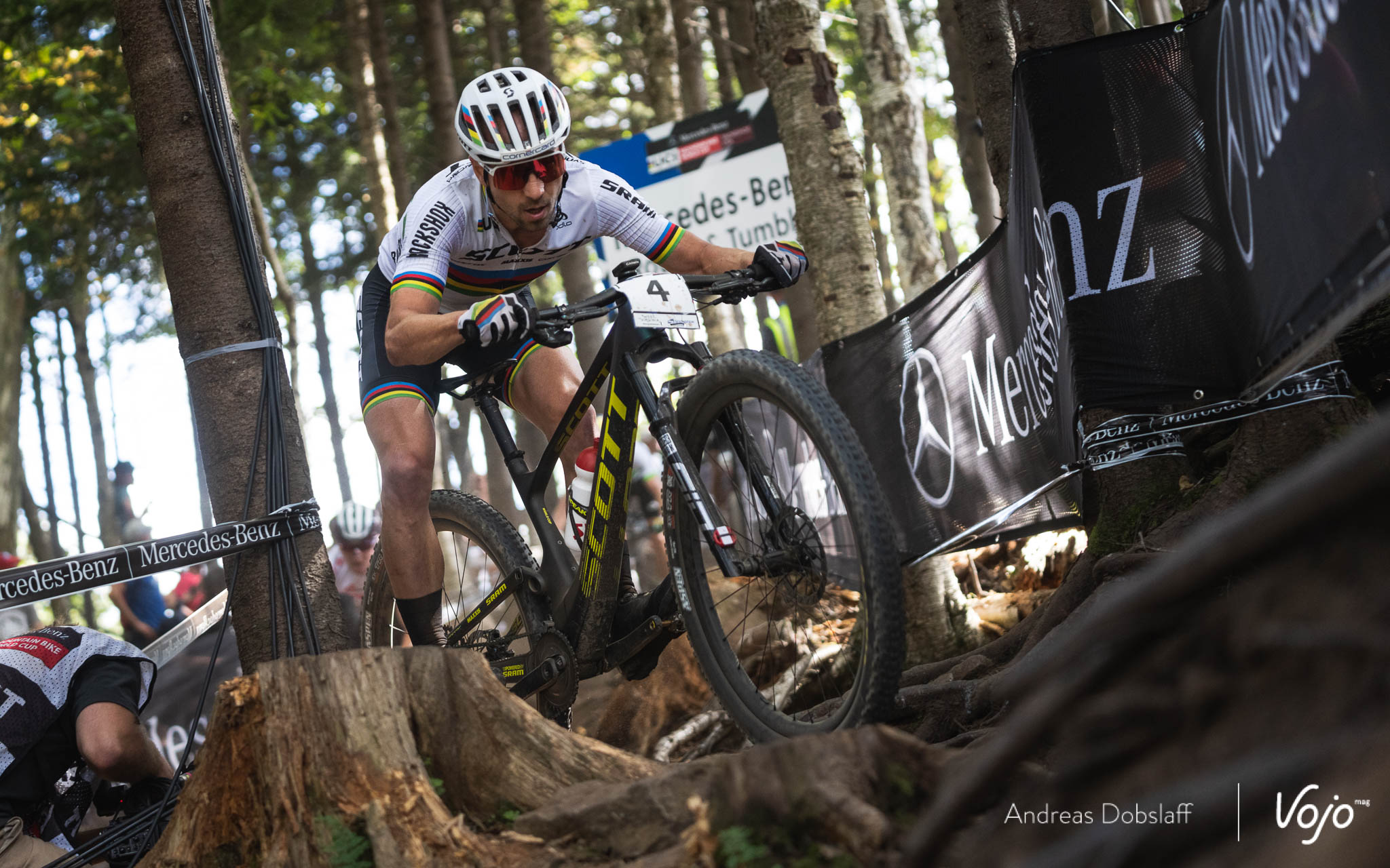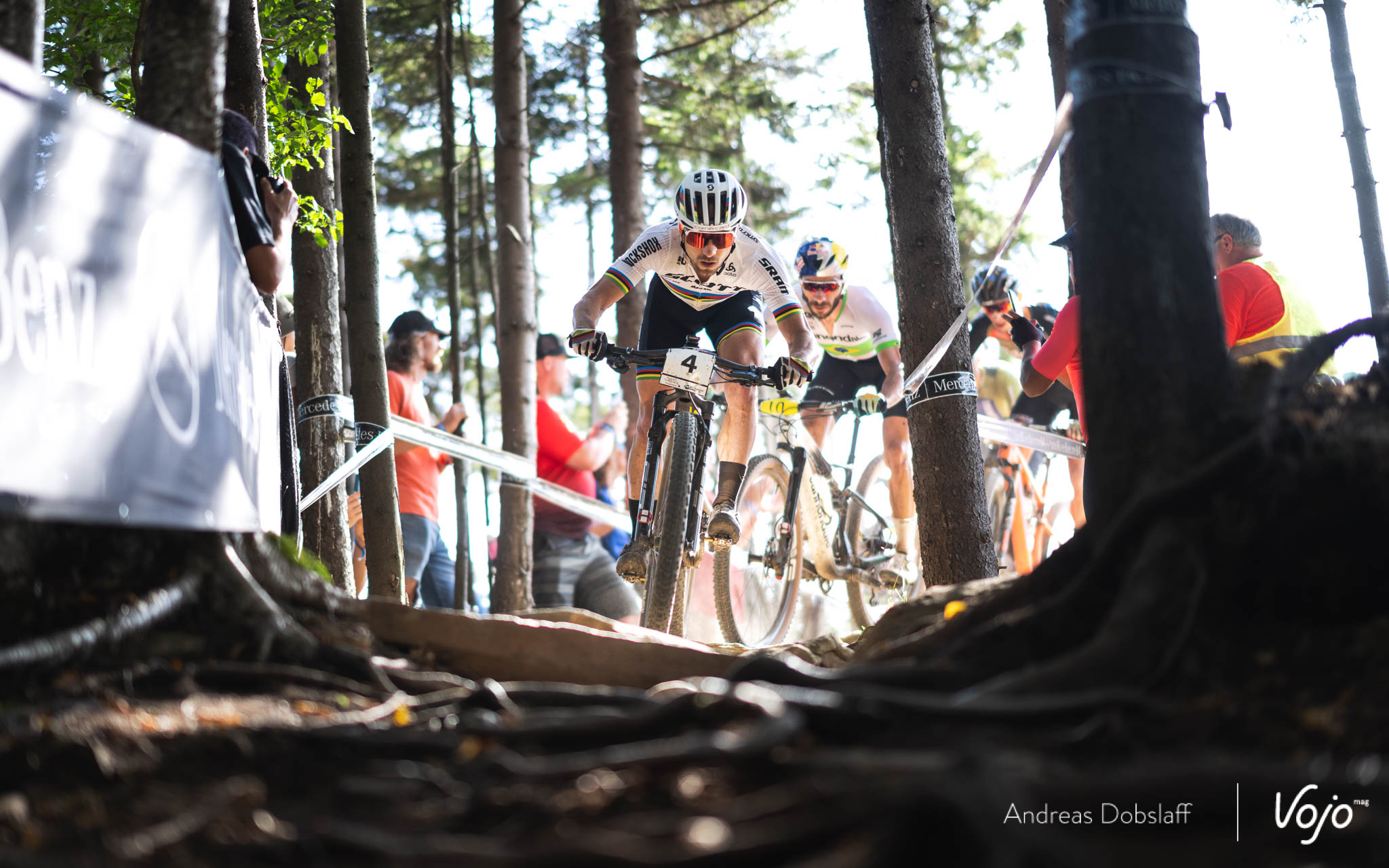 Schurter donne tout dans les dernières descentes… mais il crève de l’avant ! Eh oui, encore une crevaison ! Il n’a pas été le seul (Avancini a aussi crevé dans le dernier tour, ce qui l’a relégué en 15e position), mais c’est un fait rarissime pour cette légende au pilotage très fin, et impossible de ne pas penser que cette erreur est peut-être due à pressing imposé par les jeunes du groupes ! Le champion du monde terminera tout de même à une belle 4e place.