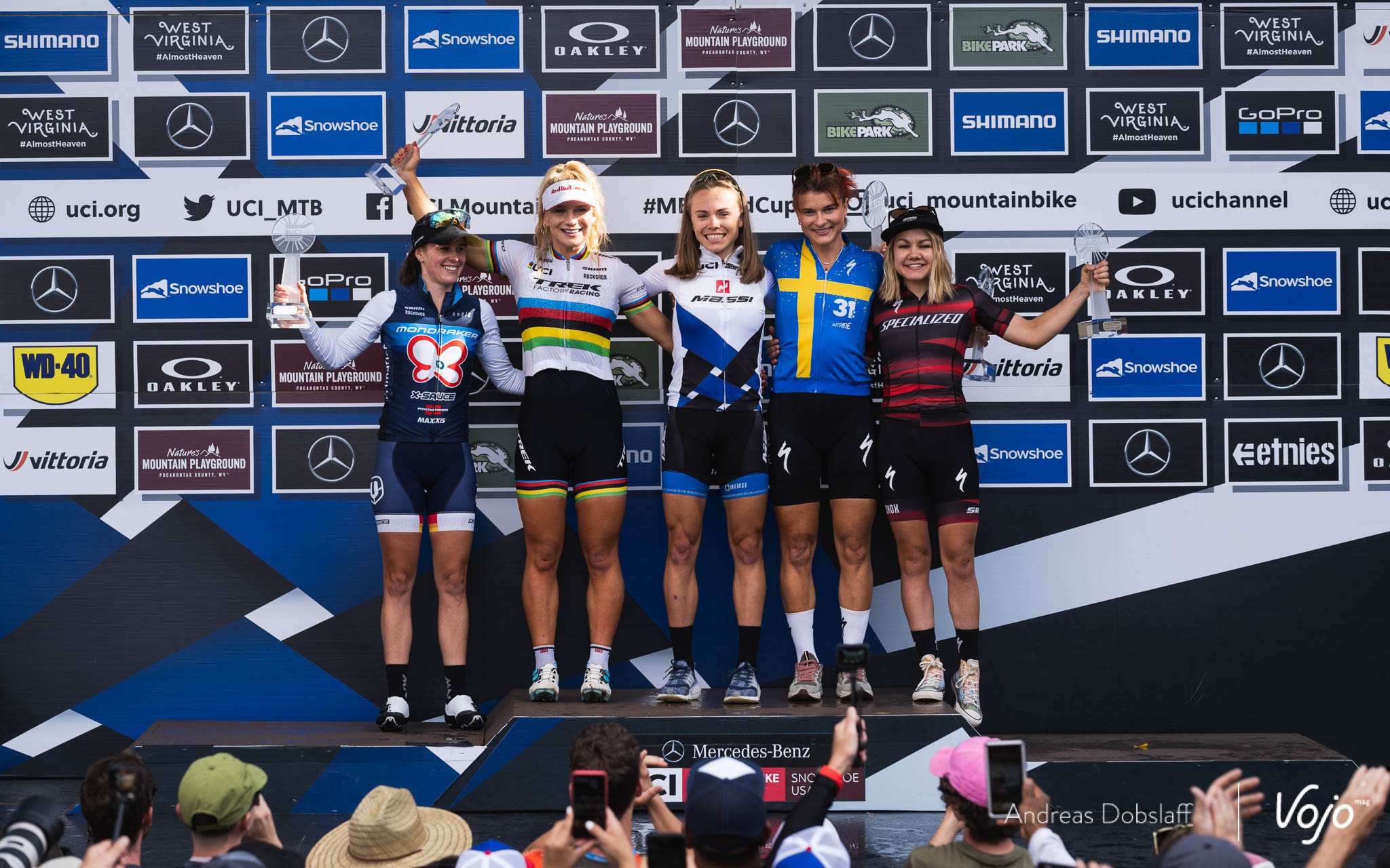 Même si elle n’a pas roulé, Loana Lecomte était bien présente pour recevoir son globe de cristal, remporté grâce à sa domination sans partage sur les quatre premières manches de la saison. Vivement 2022, en espérant voir des duels de haut vol avec sa dauphine, Evie Richards ! Jenny Rissveds conserve de justesse la 3e place, devant Rebecca McConnell et Sina Frei qui assure la 5e place devant Linda Indergand et Pauline Ferrand-Prevot.
