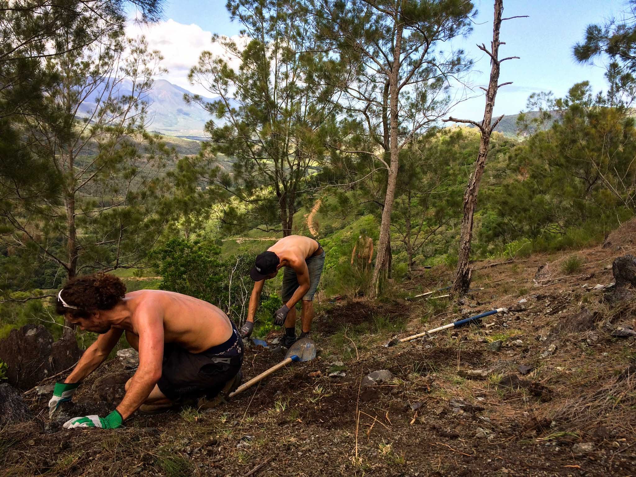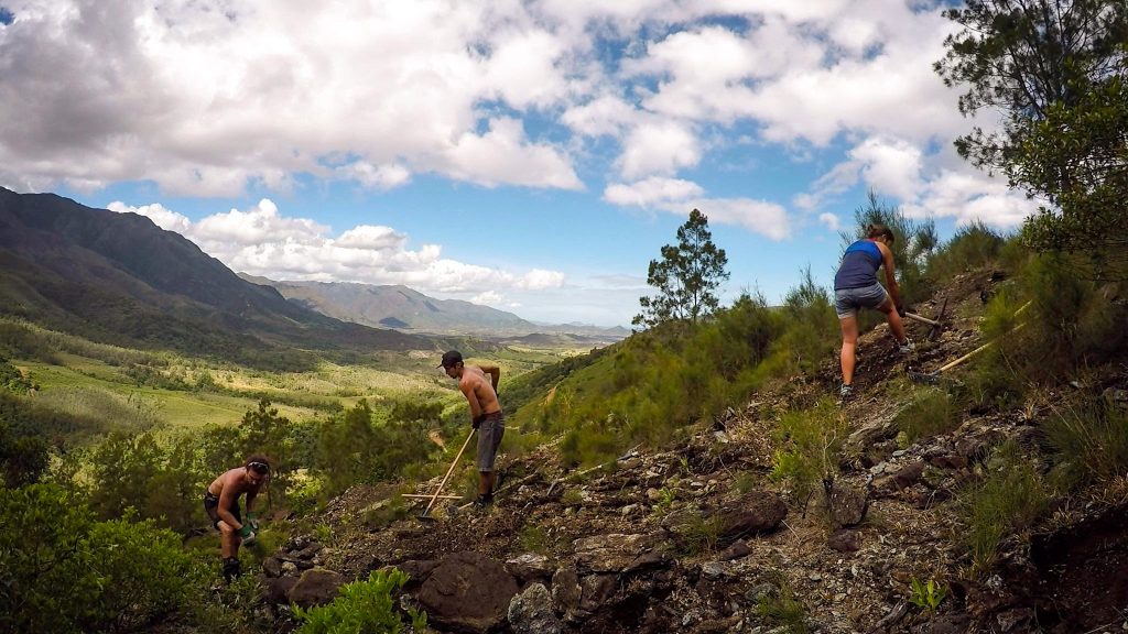 Allez hop, on charge pelles, pioches, tronçonneuses et râteaux dans le quad. On commence notre journée par 20 minutes de quad façon Indiana Jones à traverser les rivières et à grimper des pentes hyper raides, c’est super cool ! Par contre je fais moins la maligne quand on commence à s’aventurer dans la forêt remplie de toiles d’araignées énormes…tout comme les araignées qui les garnissent ! Elles font la taille de ma main, mieux vaut regarder où on met la tête (et les pieds) quand on marche !!