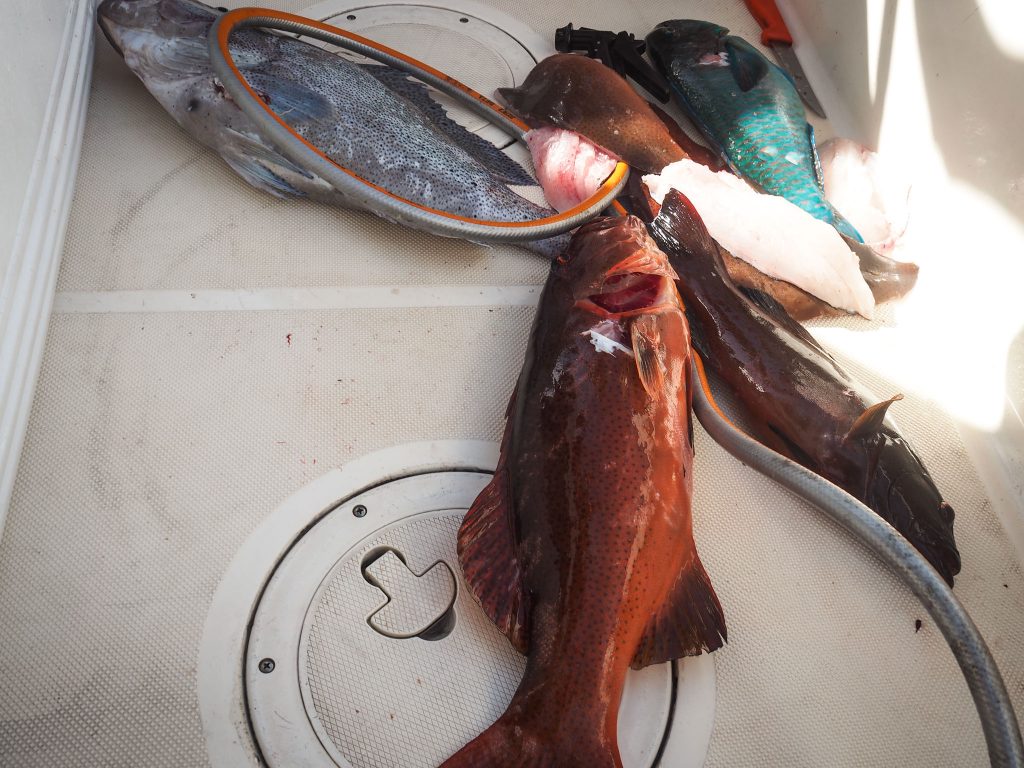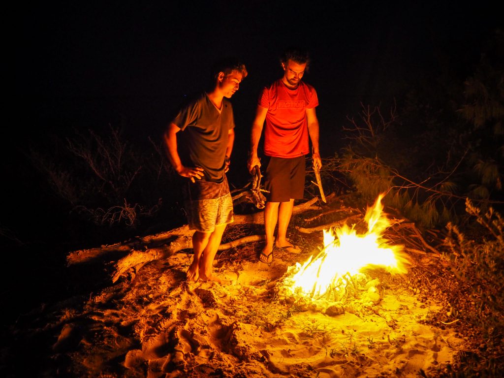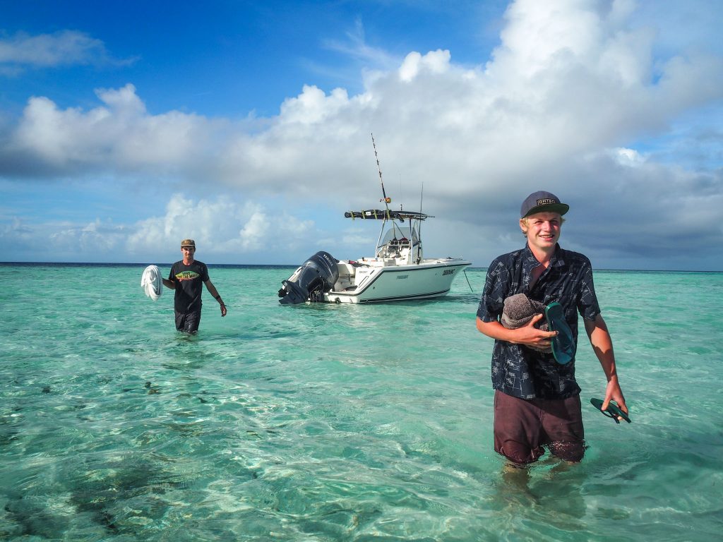 Une fois la chasse finie, notre guide amarre le bateau à une cinquantaine de mètres de l’îlot. Après plusieurs aller-retours pour tout décharger, nous voilà fin prêts à camper là-bas. J’ai du mal à croire ce qui m’arrive. C’est vraiment trop chouette. On cuisine le poisson cru fraîchement pêché: de la loge bleue, du saumoné, et du perroquet. Le tout est mariné au citron et assaisonné de soja, de tomates et d’oignons verts. Je donnerais n’importe quoi pour en remanger tellement c’était délicieux ! Pour le dessert, on a eu droit a un couché de soleil magnifique, allongé sur la plage de sable fin.