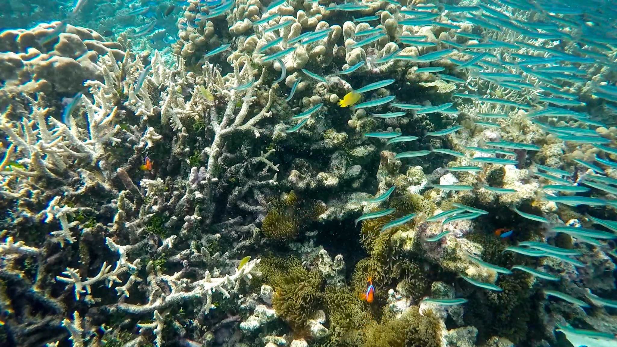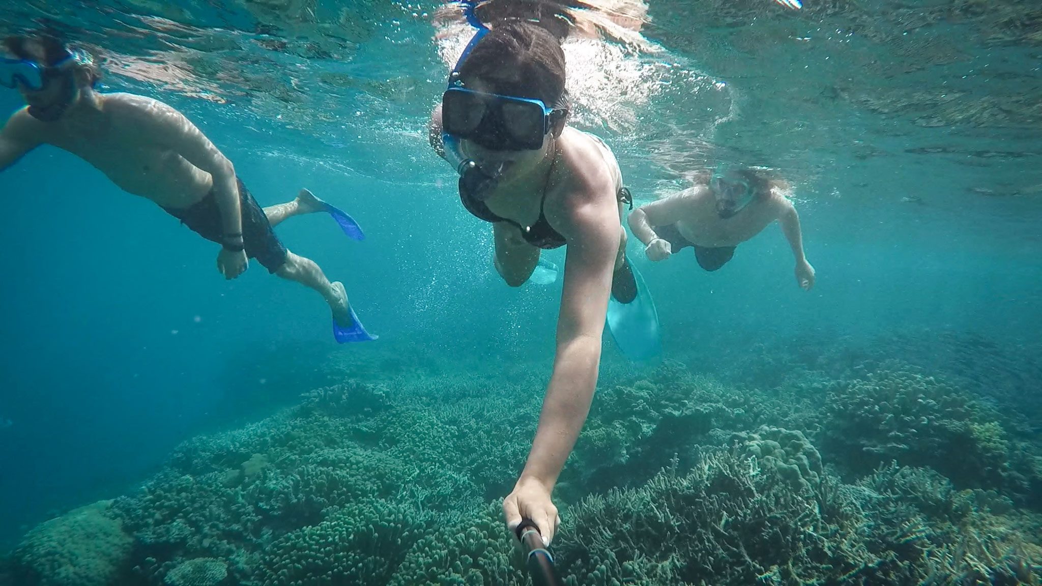 C’est bien beau de parler de bicyclette, mais il commence tout de même à me démanger d’aller voir ce qui se passe du côté des lagons ! Pour nos deux jours de congés, on décide de descendre à la « ville », à Nouméa. Un ami de Nico et son fils nous proposent de nous emmener pour une virée en bateau sur un îlot. 1h de bateau plus tard, on se retrouve au milieu des lagons bleu turquoise. Ouah ! Les locaux enfilent une combinaison de plongée et s’équipent de lances pour partir à la pêche. Nous, on se contente de palmes, masques et tubas pour aller se balader en surface. D’habitude je ne suis pas trop fan de l’eau, mais là, il n’y a pas à chipoter, c’est génial ! Une fois la tête sous l’eau chaude et translucide, on se croirait dans un aquarium géant. Il y a des bancs de poissons partout ! Des anchois, des « Némo », des poissons zèbres, des poissons discothèques, c’est tellement classe !
