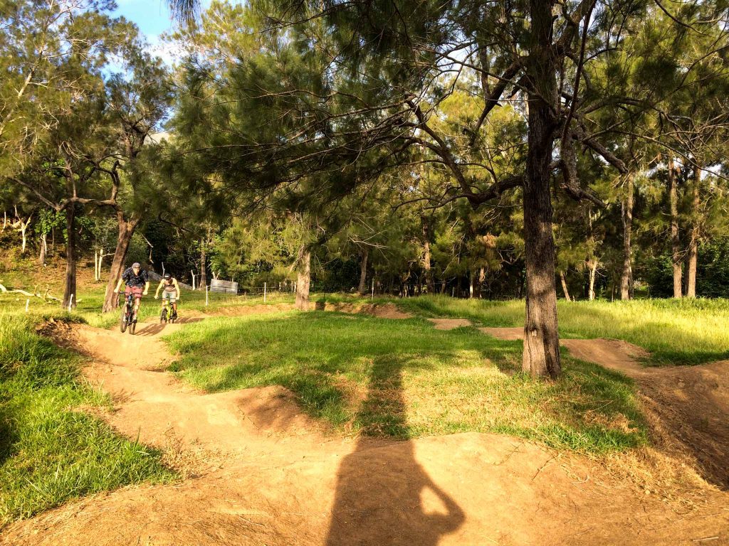 Ça monte raide par ici, il fait vraiment chaud on est rapidement trempés ! Mais plus on monte et plus la vue et les descentes seront belles. C’est sur un terrain sec et de la terre rouge que passent la majorité des pistes. Il n’est pas rare d’entendre ou même de croiser des cerfs, il y en a plein la propriété. La vue est exceptionnelle, on surplombe toute la jungle bordée par l’océan pacifique, d’ailleurs, il me tarde d’aller le voir de plus près !