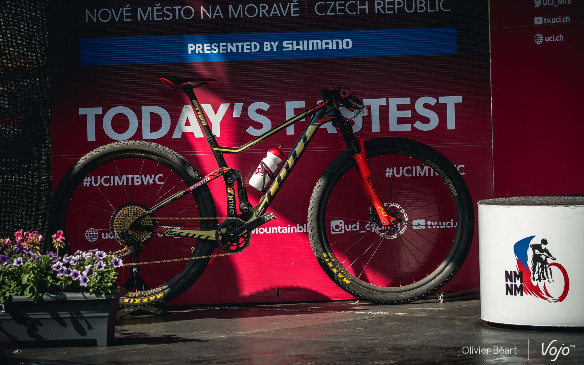Le vélo le plus rapide du jour, un Scott Spark avec une déco spéciale pour fêter les victoires de Nino Schurter.