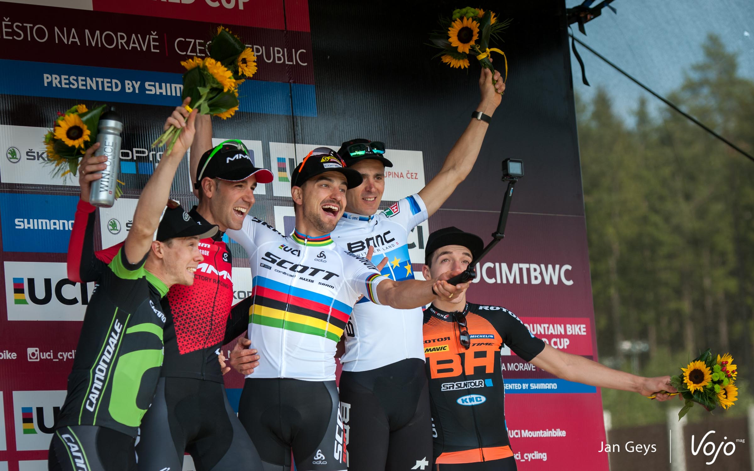 Mesdames et messieurs : Nino Schurter, David Valero, Julien Absalon, Maxime Marotte et Jordan Sarrou ! En mode selfie s’il vous plaît !