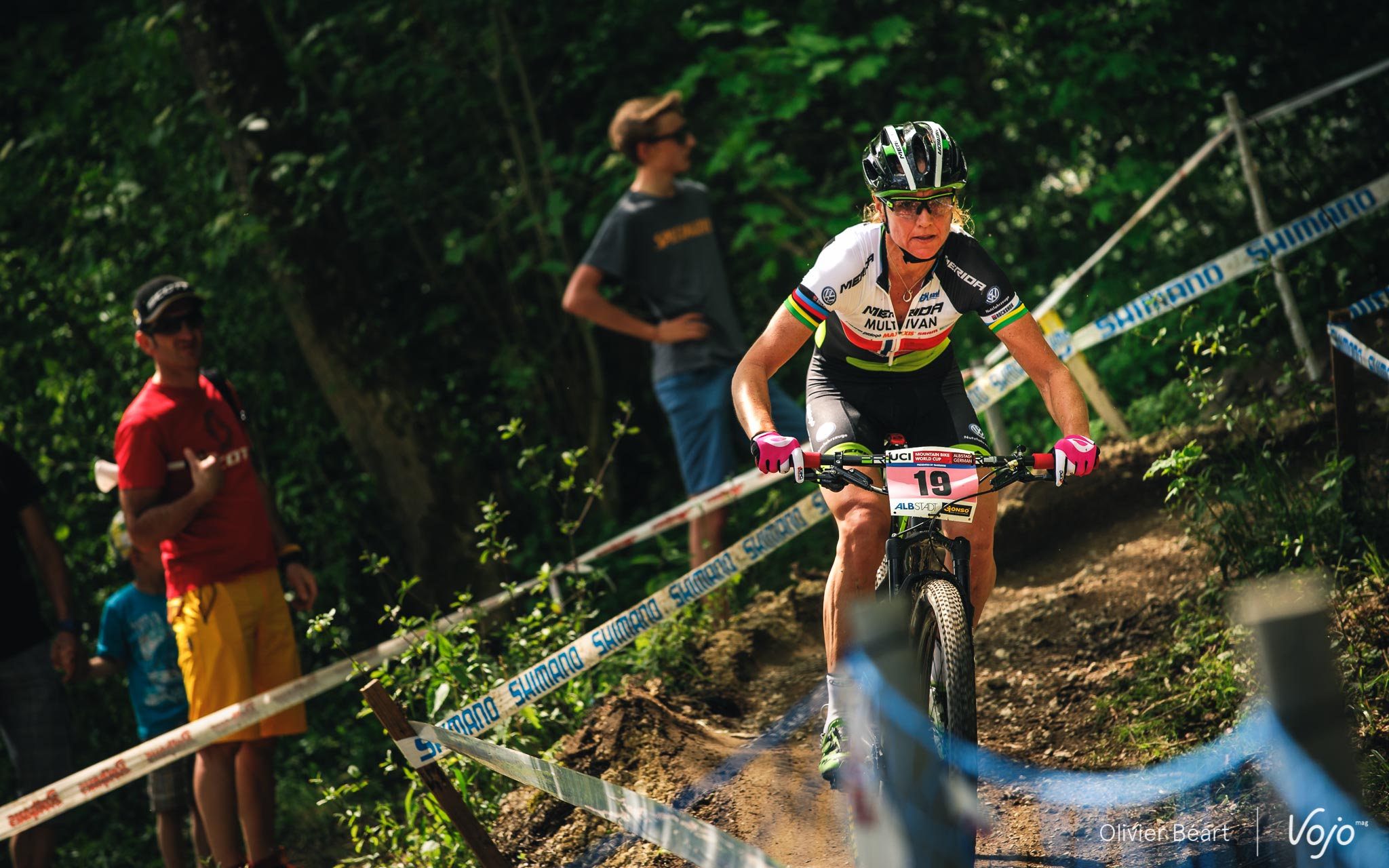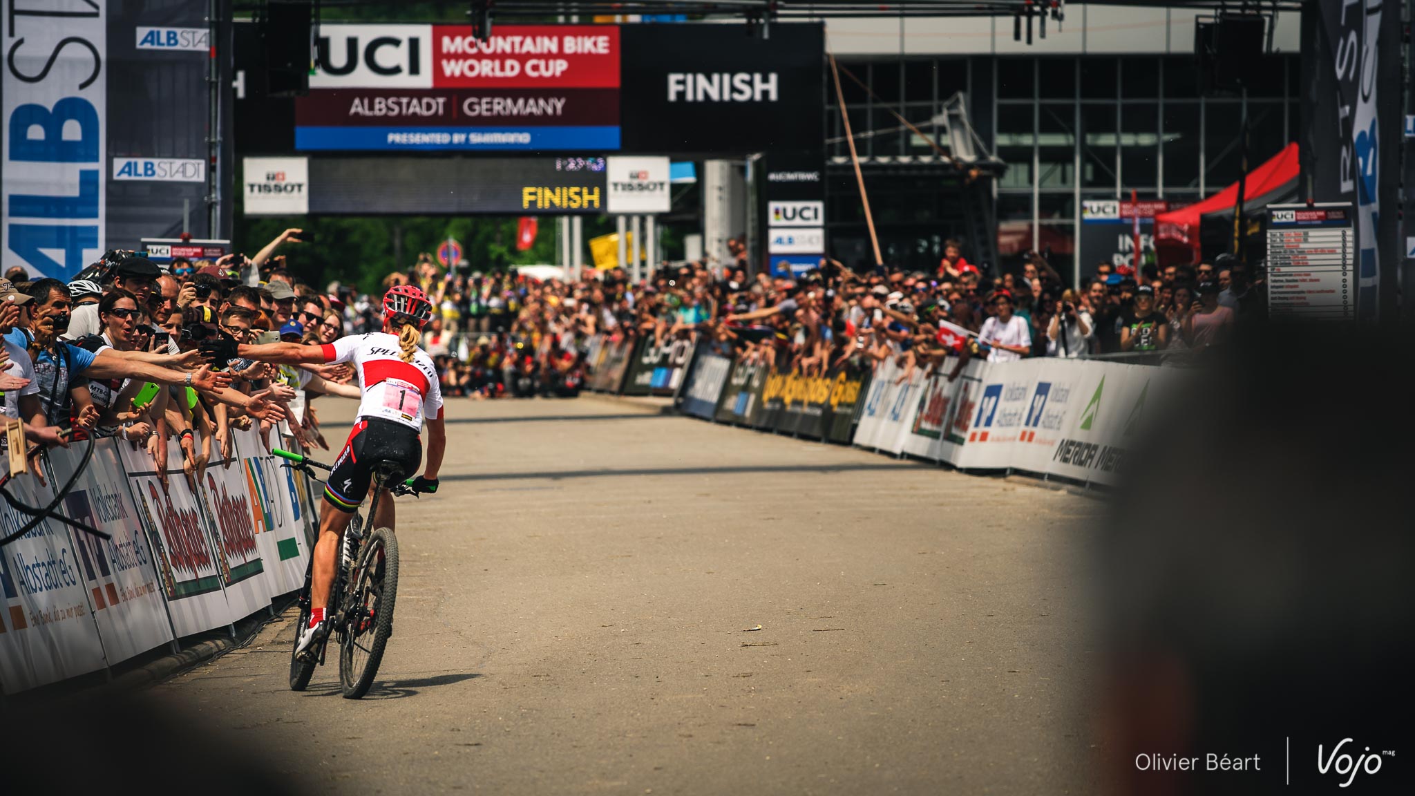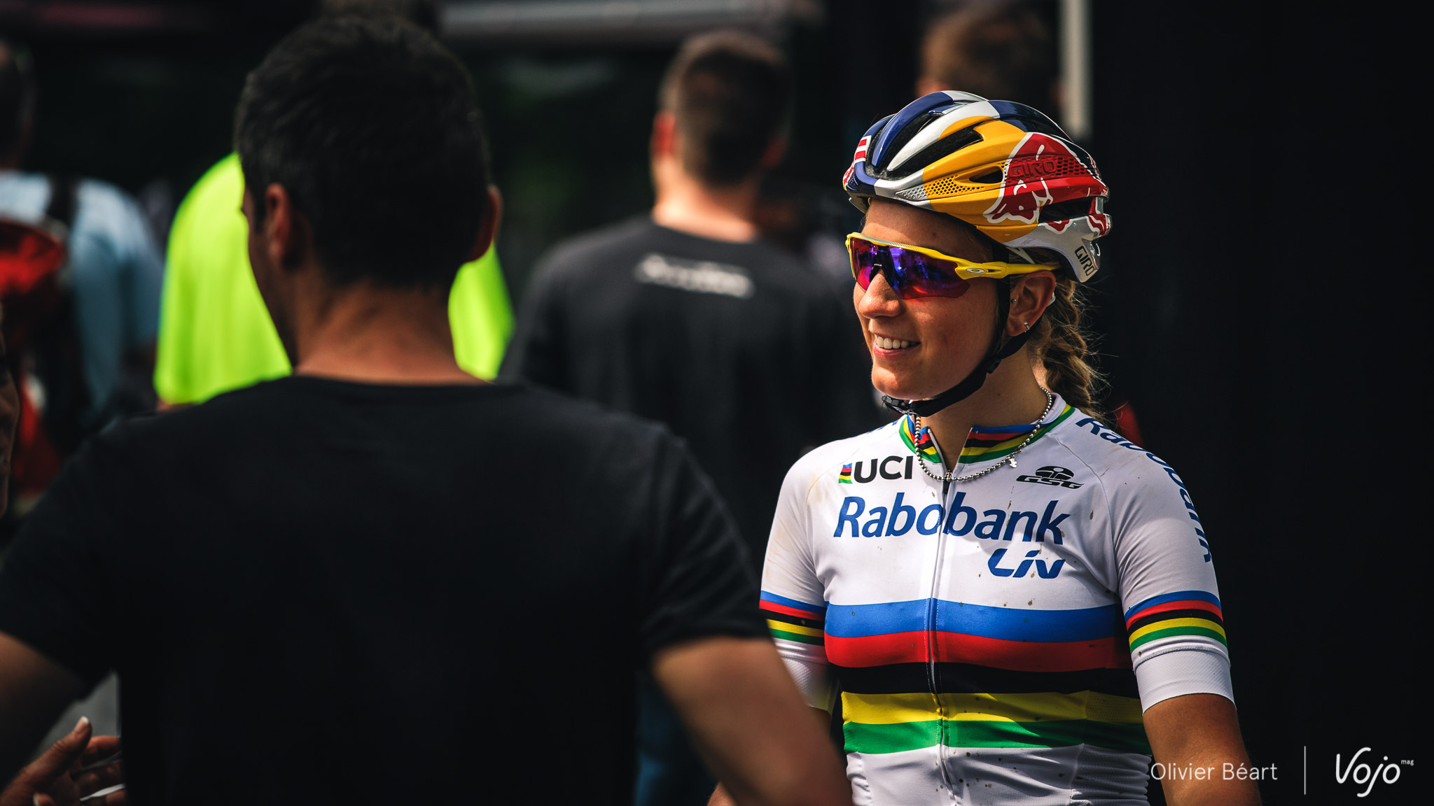 Mais, à l’interview, c’est à la jeunesse qu’elle a pensé, en adressant quelques mots en direction de Jenny Rissveds : « Je suis heureuse pour elle. Ce n’est pas la fille qui a tout gagné depuis qu’elle fait du vtt. L’an dernier elle a vraiment commencé à dominer en U23, mais elle n’a jamais été championne du Monde par exemple. C’est une fille qui progresse pas à pas. Elle est dans un des meilleurs teams, au contact du meilleur biker du moment et avec un staff incroyable. C’est beau de voir que cela fonctionne, et je pense qu’elle est partie pour aller très loin. »