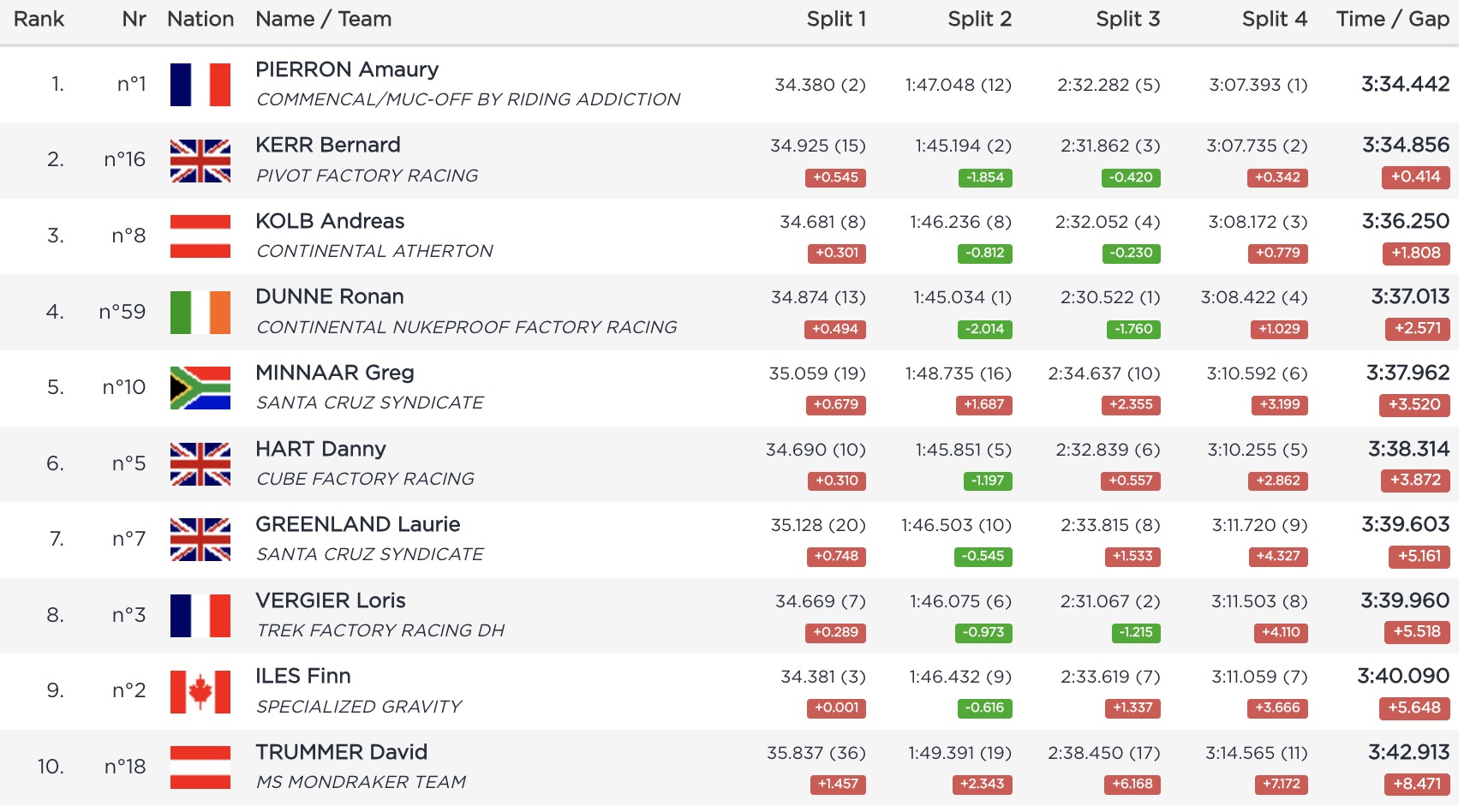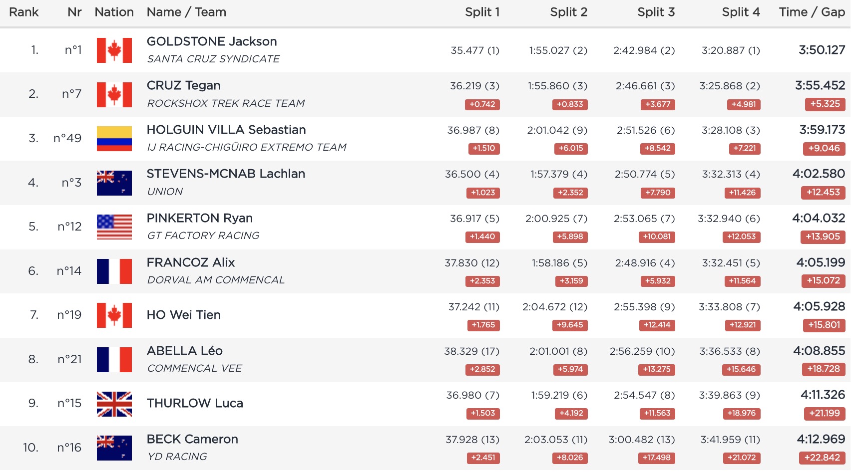 En dehors du top 10, on notera la 11e place de Dylan Levesque, la 13e d’un ultra-spectaculaire Matteo Iniguez, la 14e d’Aaron Gwin, la 15e de Troy Brosnan, la 16e de Benoît Coulanges, ou encore la 18e de Thibaut Dapréla, sans doute déçu alors qu’il avait signé le 2e temps des qualifications.