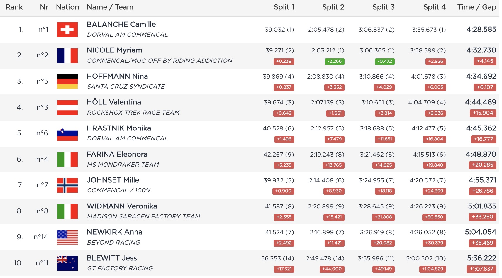 Vali Höll, qui semblait rouler à 120% sans pour autant que ce soit payant, complète le podium en compagnie de Monika Hrastnik, 5e. Elles sont toutes deux à plus de 15 secondes du chrono de Balanche !