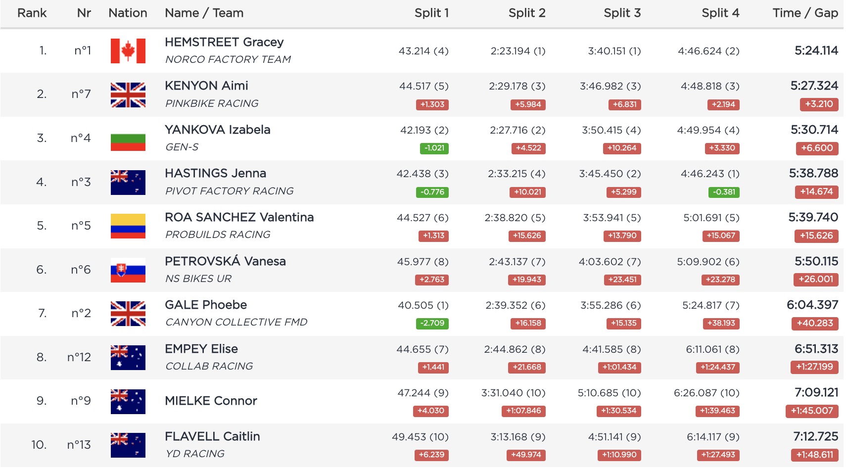 Pas vraiment de surprises dans le reste du top 10 où l’on retrouve, dans l’ordre, Eleonora Farina (6e), Mille Johnset (7e), Veronika Widmann (8e), Anna Newkirk (9e) et enfin Jessica Blewitt (10e).