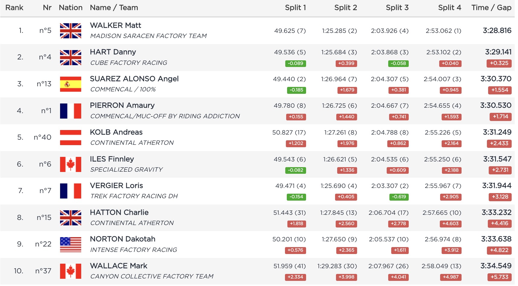 Walker domine un podium pour le moins inattendu puisqu’il est accompagné par son compatriote Danny Hart (2e), Angel Surez (3e), Amaury Pierron (4e) et l’Autrichien Andreas Kolb (5e), qui monte pour la première fois sur un podium de coupe du monde… devant son public !