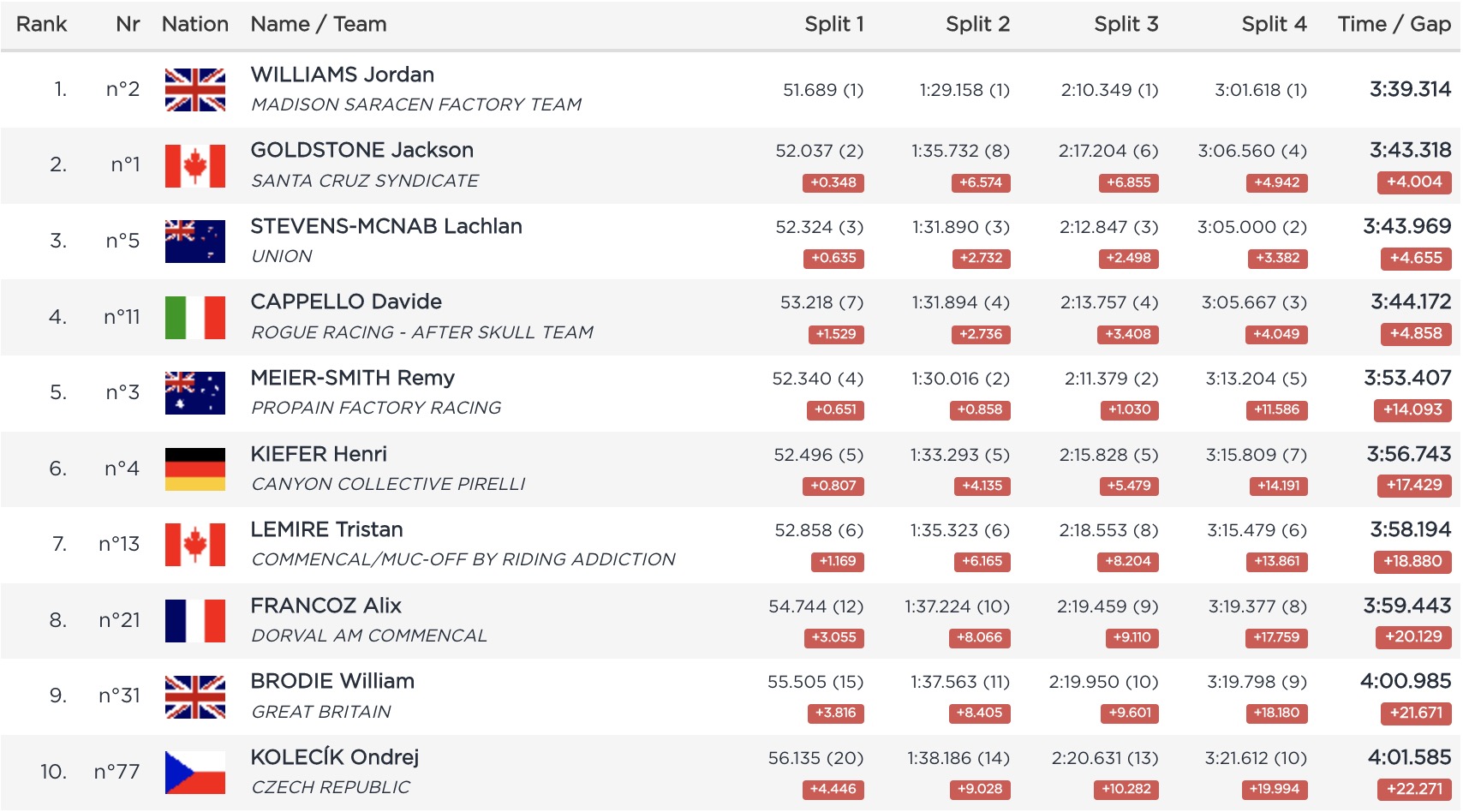 Au-delà du top 10, on notera la 11e place d’Aaron Gwin, la 16e de Troy Brosnan, la 18e de Laurie Greenland, la 41e de Greg Minnaar ou encore la 59e de Thibaut Dapréla.