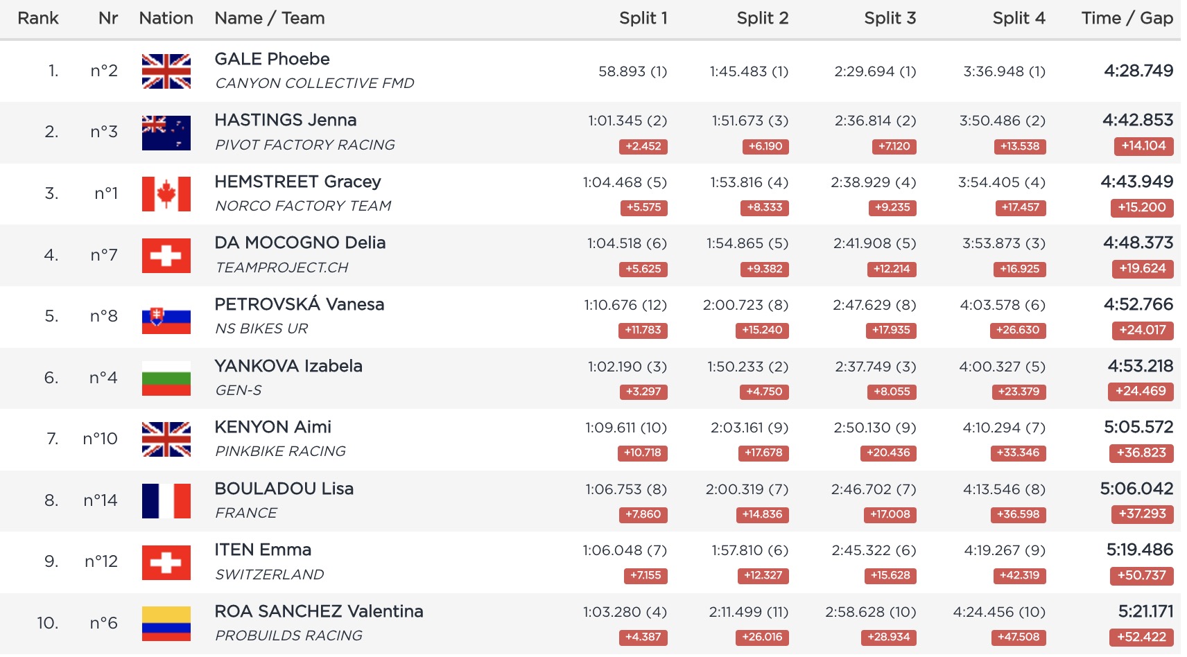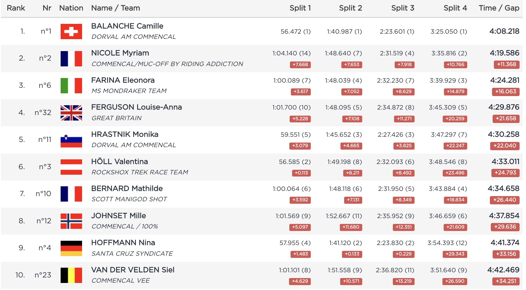 Pas vraiment de quoi effrayer la Suissesse qui virevolte littéralement sur la boue et les racines, parfaitement maître de son sujet, et s’empare de la victoire avec un écart colossal : 11.368 secondes !