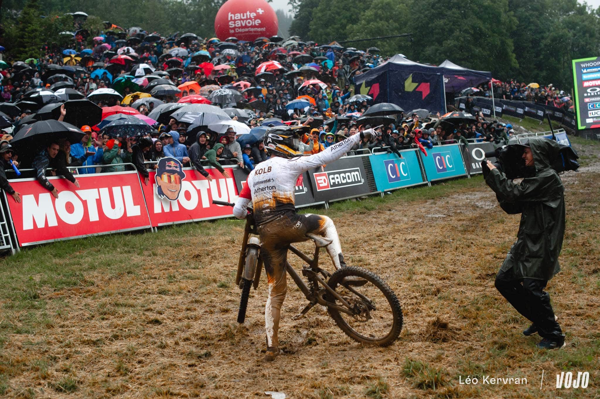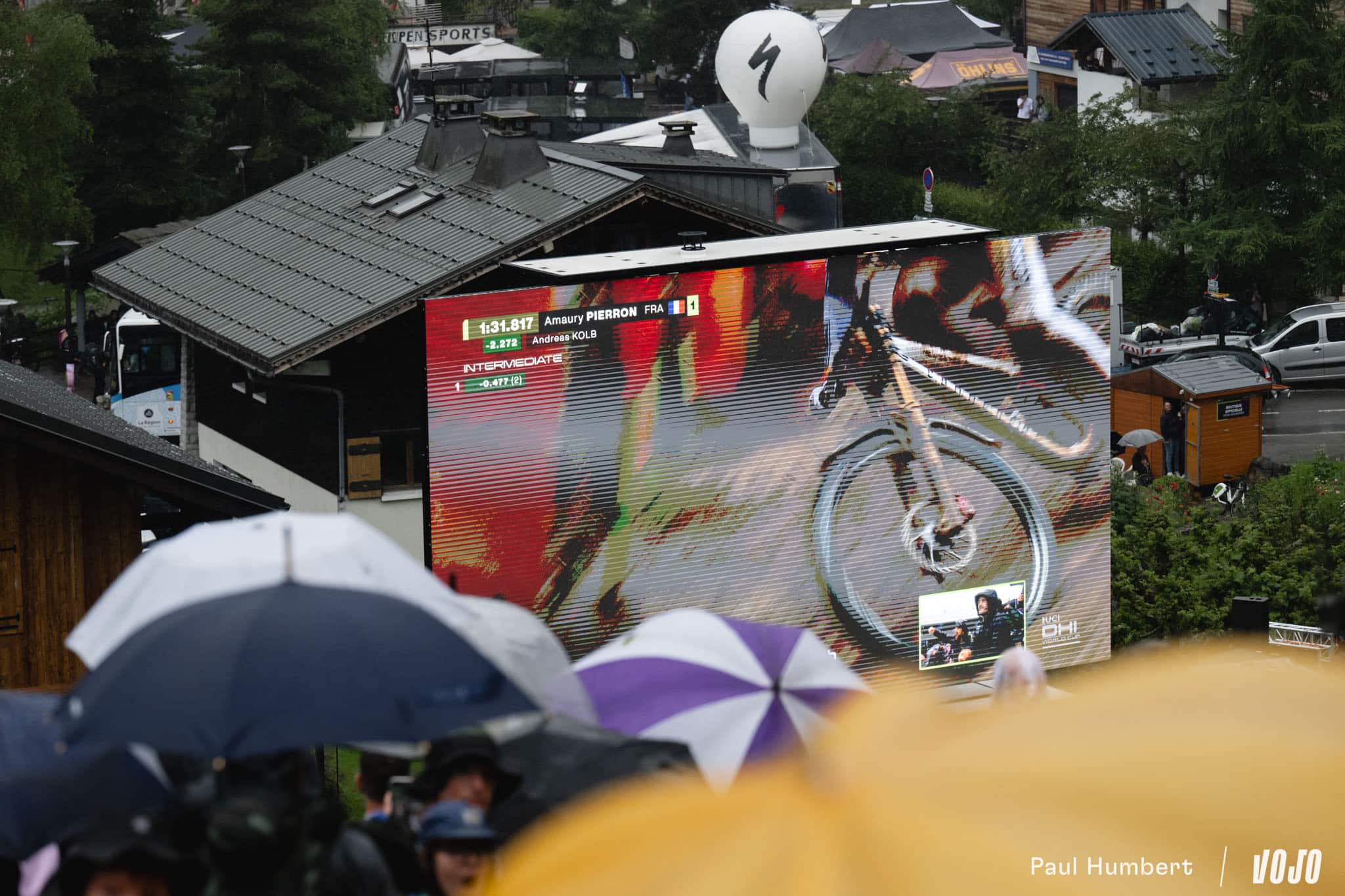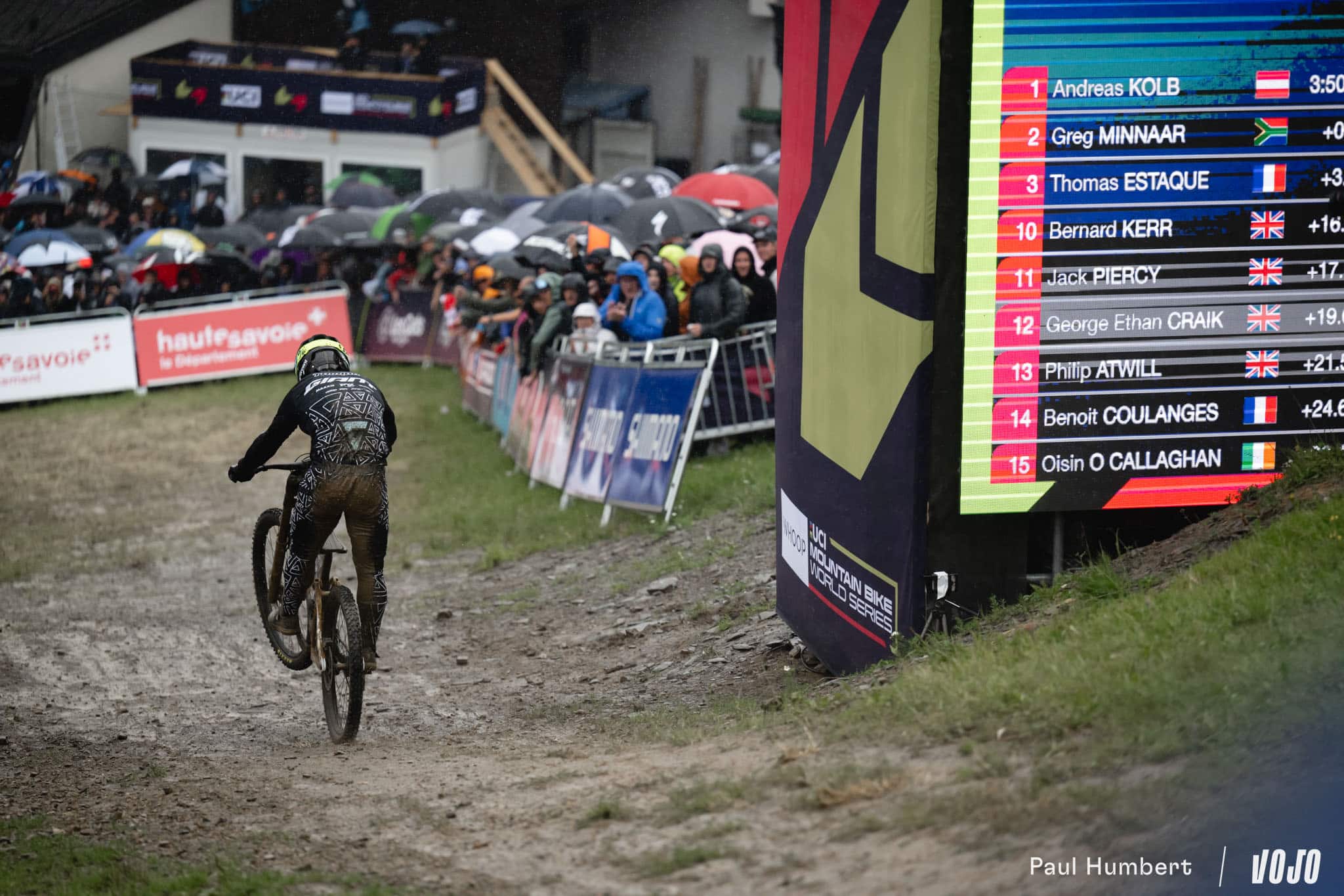 De 4 dixièmes de secondes, son avance passe à plus de 2 secondes au pointage suivant puis 2,7 s au milieu de la piste. Et d’un coup… plus de 5 secondes d’avance ! Alors que plus des deux tiers des pilotes au départ sont tombés aujourd’hui, Pierron ne semble pas affecté de la même manière par les conditions. Ce run est de ceux qui forment les légendes, de l’envergure d’un Danny Hart à Champéry en 2011. Intouchable, il passe la ligne avec presque 6,5 s d’avance sur Andreas Kolb !