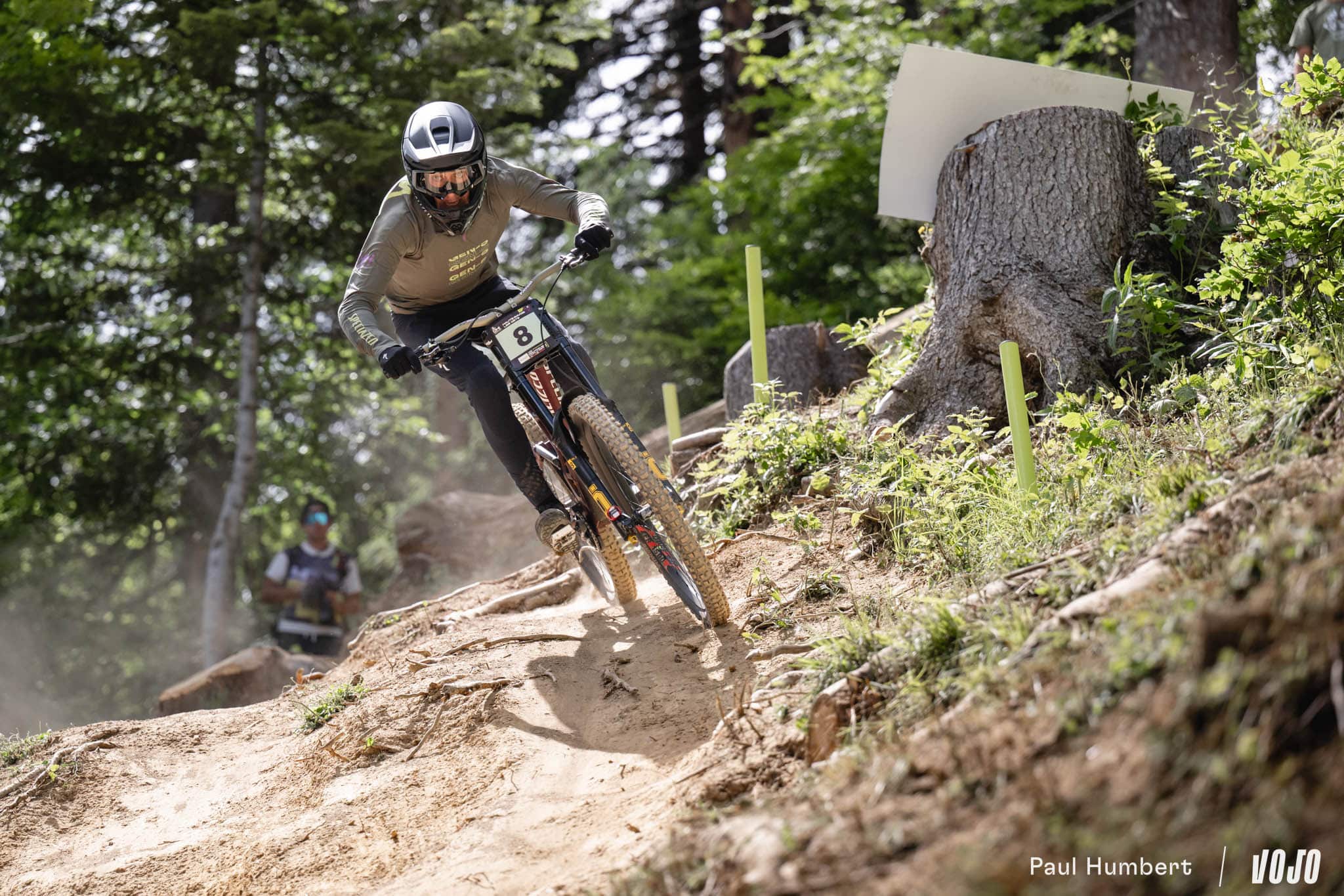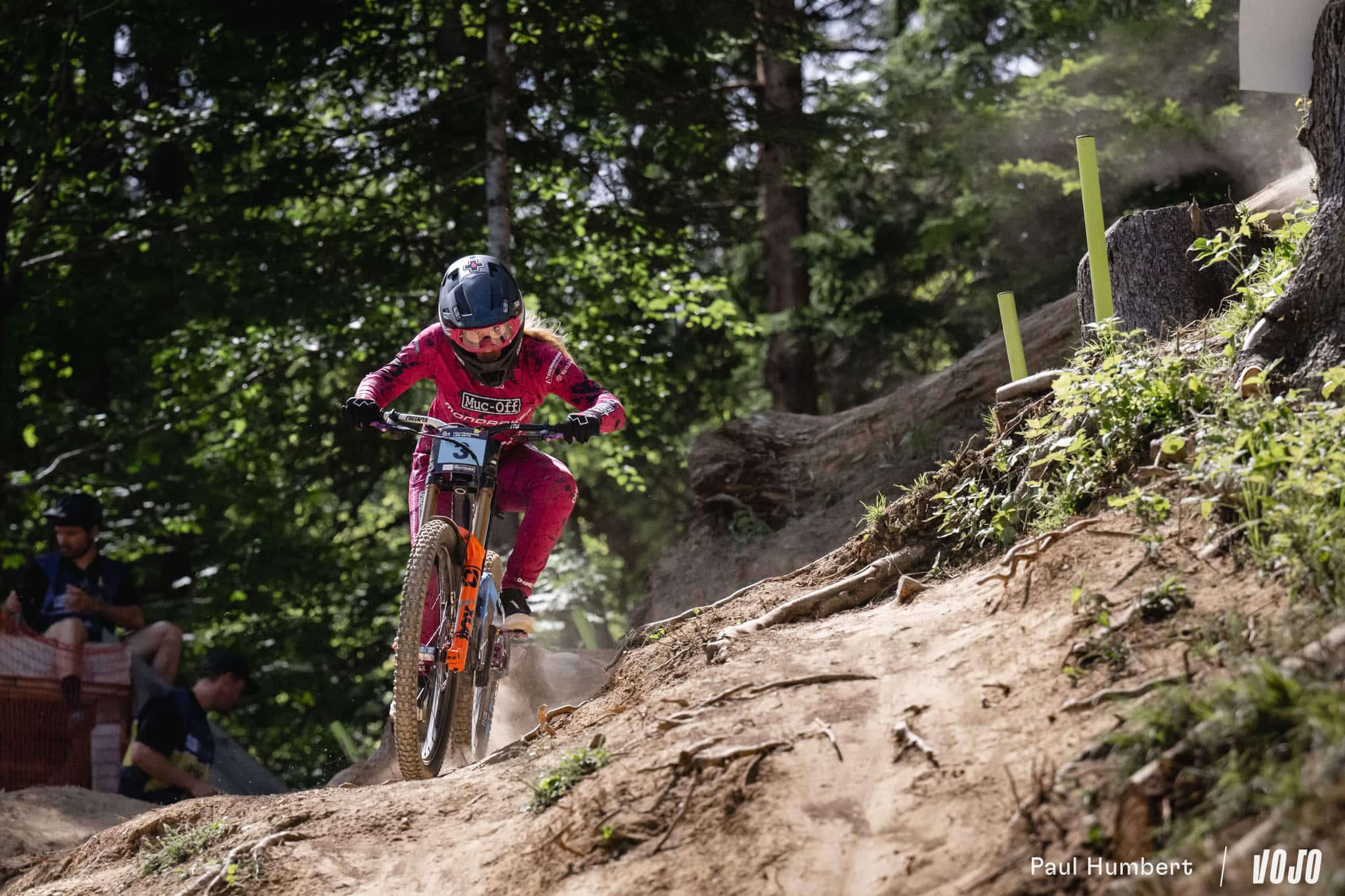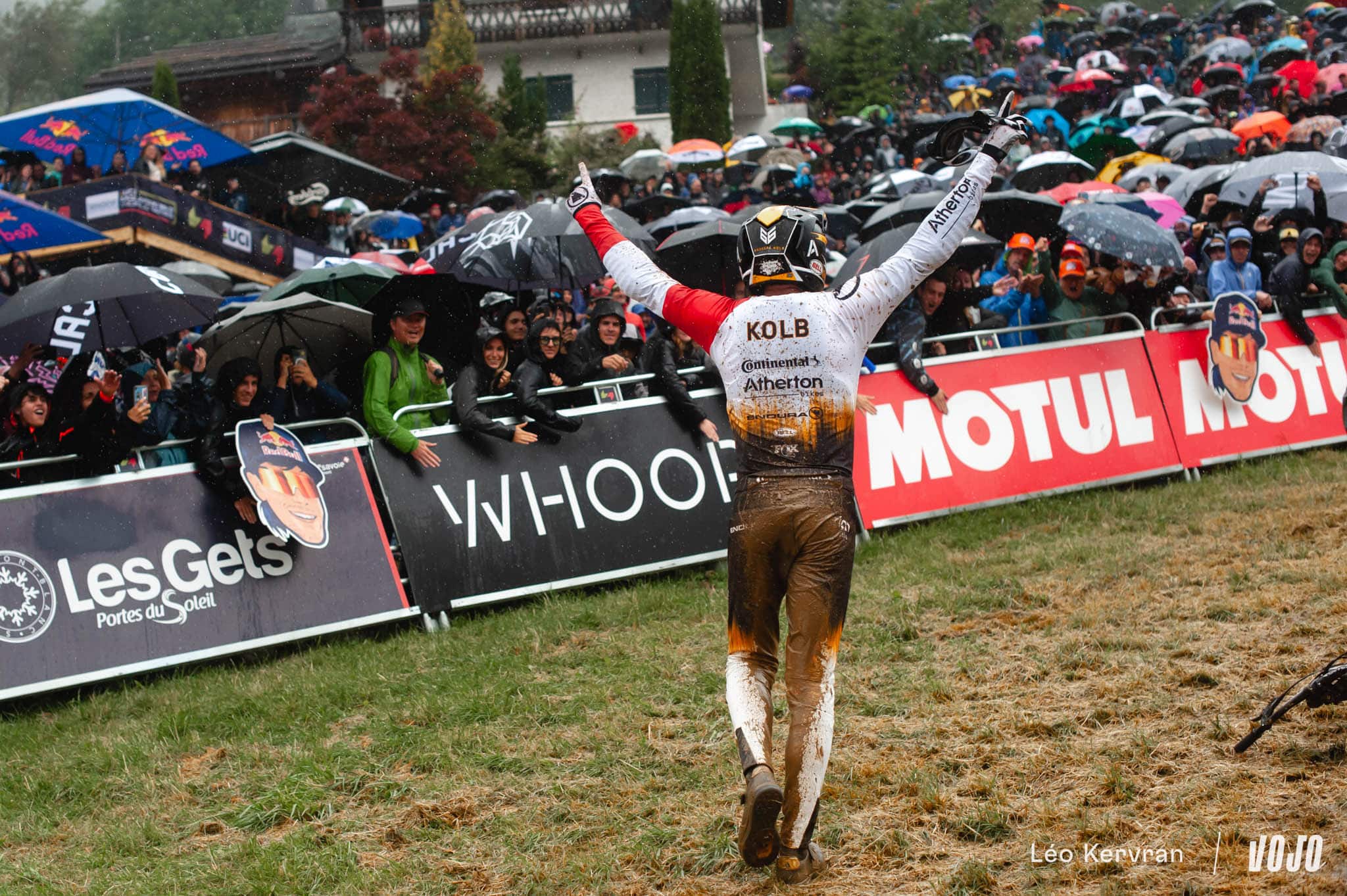 De 4 dixièmes de secondes, son avance passe à plus de 2 secondes au pointage suivant puis 2,7 s au milieu de la piste. Et d’un coup… plus de 5 secondes d’avance ! Alors que plus des deux tiers des pilotes au départ sont tombés aujourd’hui, Pierron ne semble pas affecté de la même manière par les conditions. Ce run est de ceux qui forment les légendes, de l’envergure d’un Danny Hart à Champéry en 2011. Intouchable, il passe la ligne avec presque 6,5 s d’avance sur Andreas Kolb !