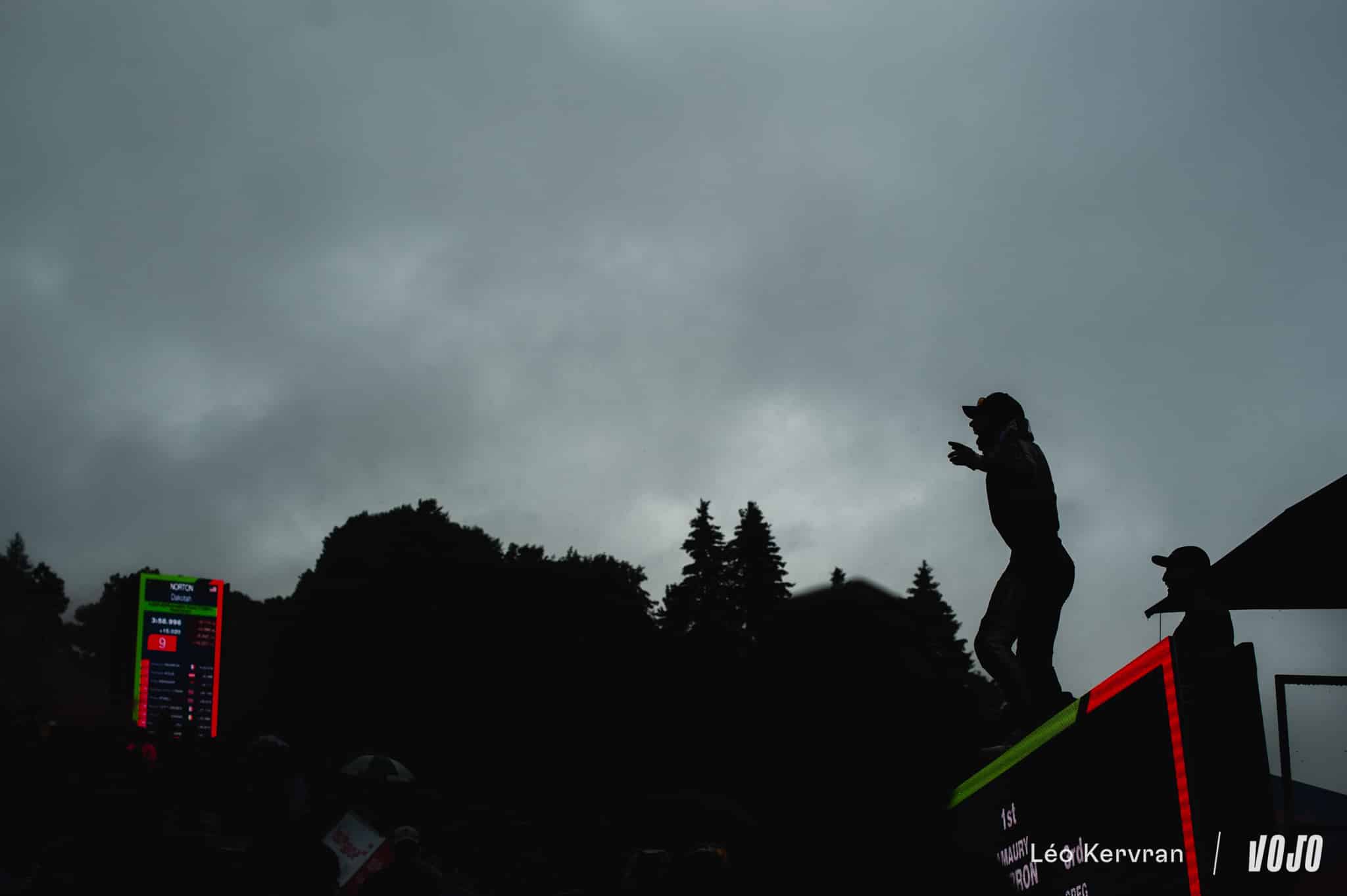 Si rouler sous la pluie fait partie du VTT, les pilotes partaient ici avec un inconvénient supplémentaire : jusque-là, toutes les reconnaissances et sessions d’entraînement se sont déroulées sur le sec. Les trajectoires, les vitesses de passage, les points de freinage… Tout cela avait été travaillé sur une piste à peine humide en milieu de semaine et de plus en plus sèche au fil des passages.