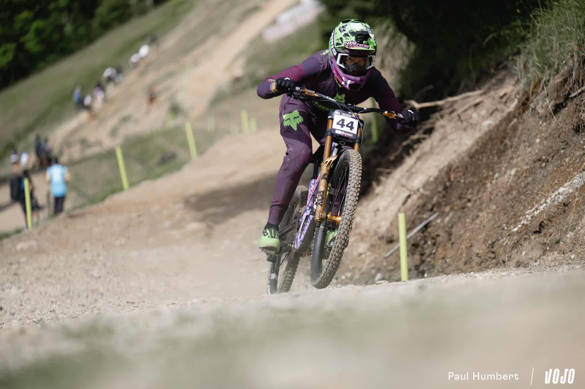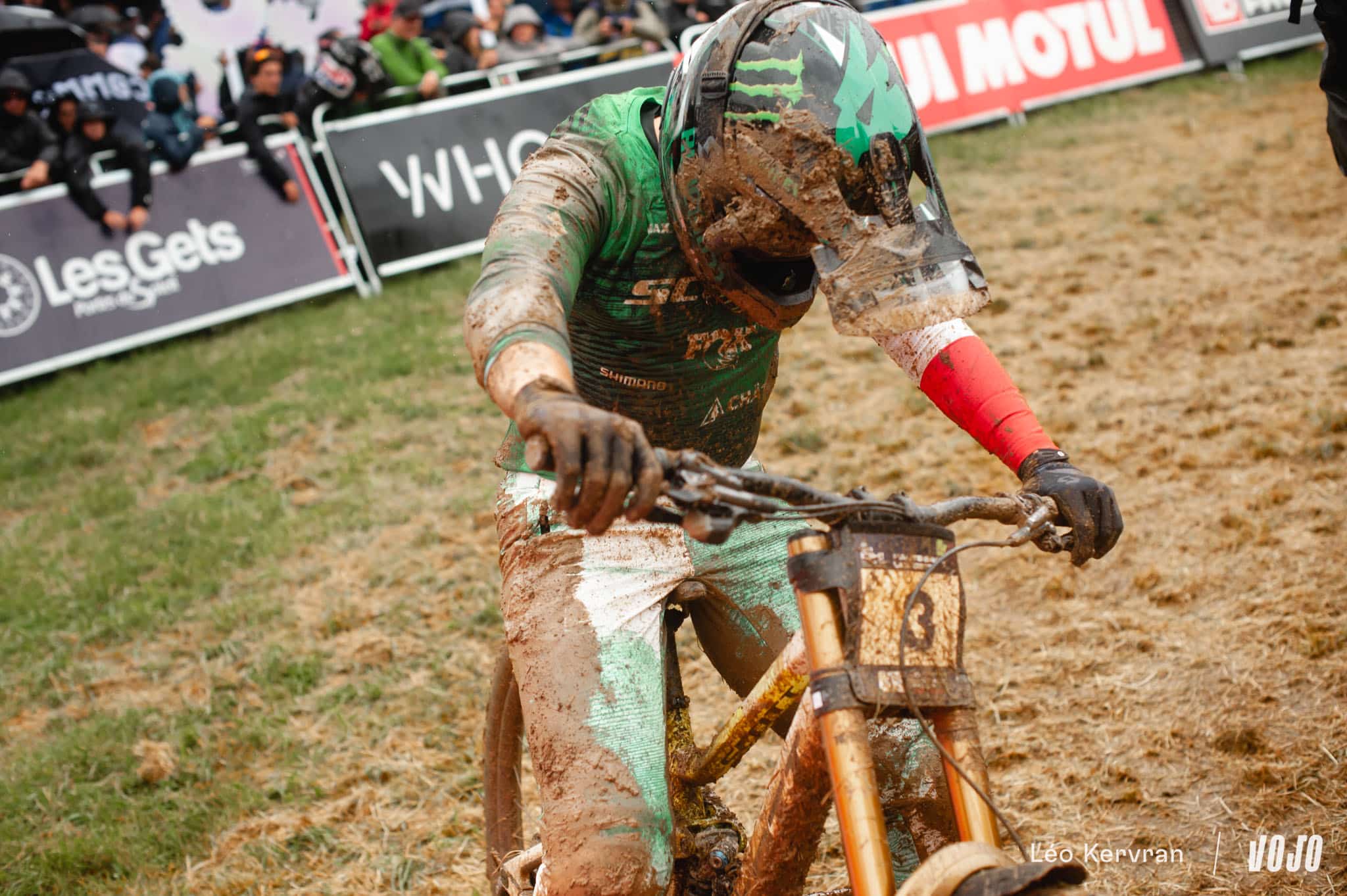 Nathan Pontvianne, le jeune pilote du team Goodman – Santa Cruz, est l’un des premiers à réveiller sérieusement le public : au premier intermédiaire, il est plus rapide que Greg Minnaar ! Malheureusement, son run va lui aussi se terminer au sol et on le retrouve logiquement frustré dans la raquette d’arrivée : « Je savais que pour faire un beau run il ne fallait pas tomber, pour être devant. Je me suis senti vraiment bien dans le premier secteur du coup j’ai voulu en mettre et j’en ai trop mis, dès l’entrée du premier secteur j’ai glissé. Après j’ai quand même poussé, je suis retombé et j’ai continué de pousser jusqu’à la fin. Pas de bobo, ça me fait une belle expérience. C’était très très dur, on a roulé dans le sec toute la semaine et là on arrive, on doit faire notre run de final, notre run à bloc, dans le gras et c’est très compliqué à gérer. Il n’y a pas de pneu vraiment précis pour ces conditions, c’est béton, verglas, très très dur à rouler. »