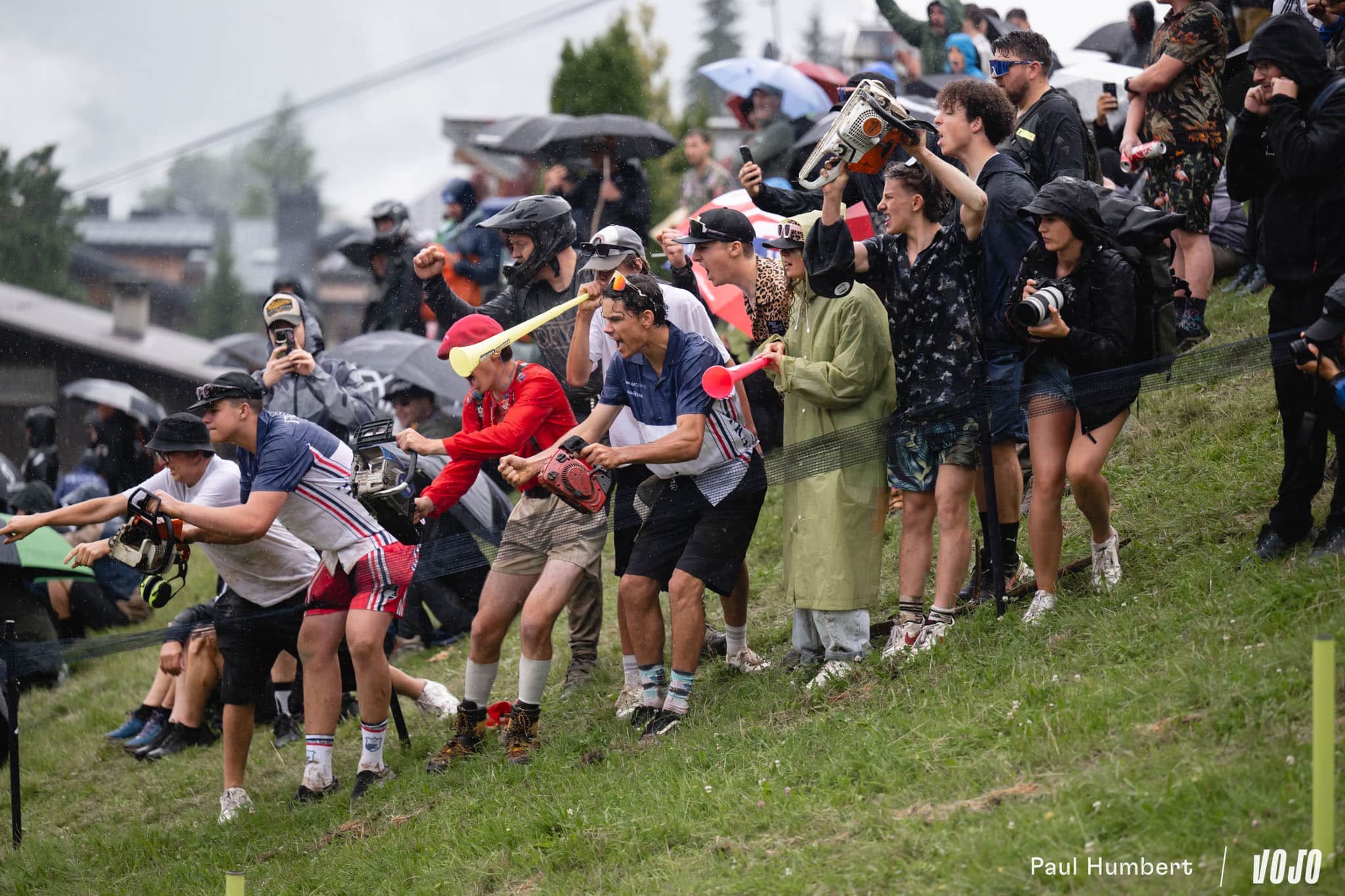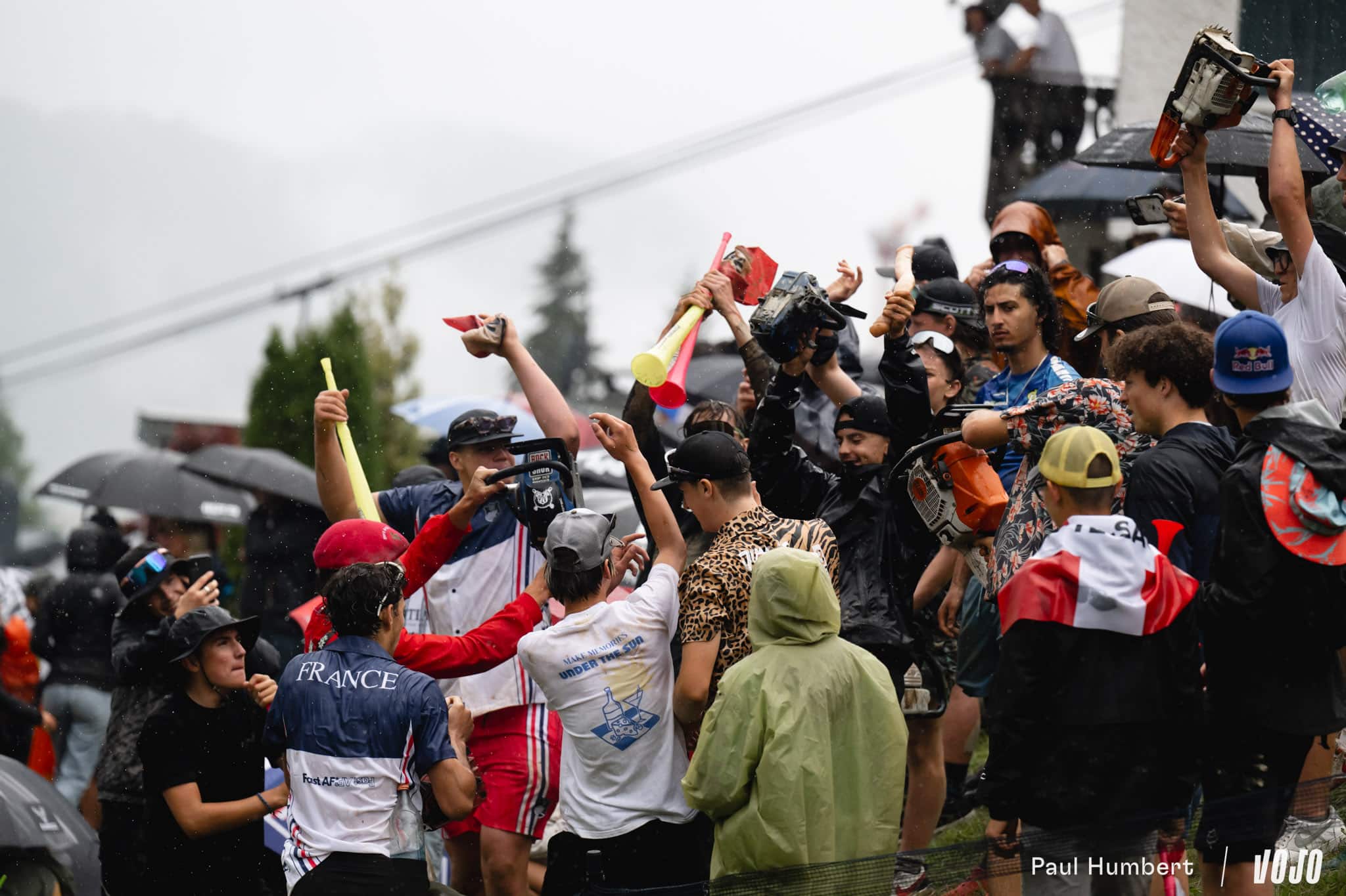 Si on avait peur que la pluie ou le changement de programme réduise la foule venue assister aux finales, les spectateurs et spectatrices nous ont vite montré qu’il en fallait plus pour les décourager. Déjà bien présents pour les femmes, leur nombre n’a fait que grossir pendant l’épreuve hommes jusqu’à ce final en apothéose. Tronçonneuses, fumigènes, vuvuzela, klaxons, déguisements, concours de ventriglisse dans l’herbe, envahissement de la raquette d’arrivée, bain de foule pour les vainqueurs… Vous connaissez la recette, on est aux Gets !