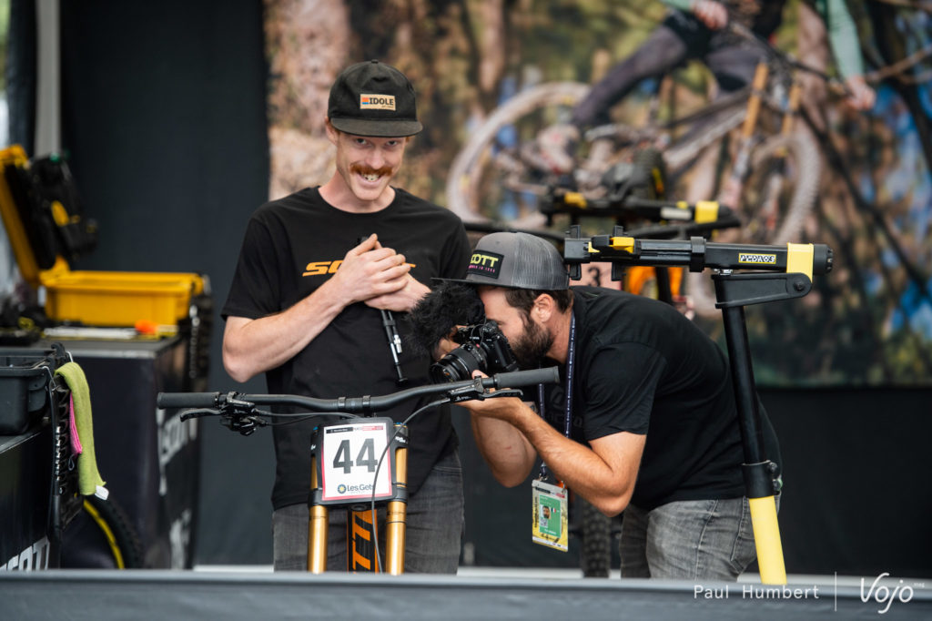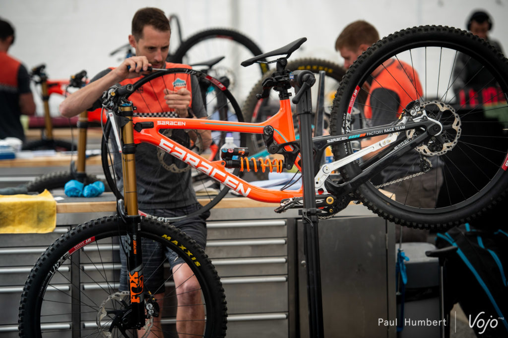 Après de longs mois de galère, le Mondraker Summum semble enfin fonctionner à la hauteur des espérances des pilotes et mécanos avec une roue de 29 pouces à l’avant. En s’attardant sur le vélo de Brook MacDonald avec son mécano, Benoit Vergnaud, on repère une biellette limée, pas mal de bricolages et toujours une roue arrière de 27,5 pouces ! Là encore, les nouvelles Deemax sont de sortie.