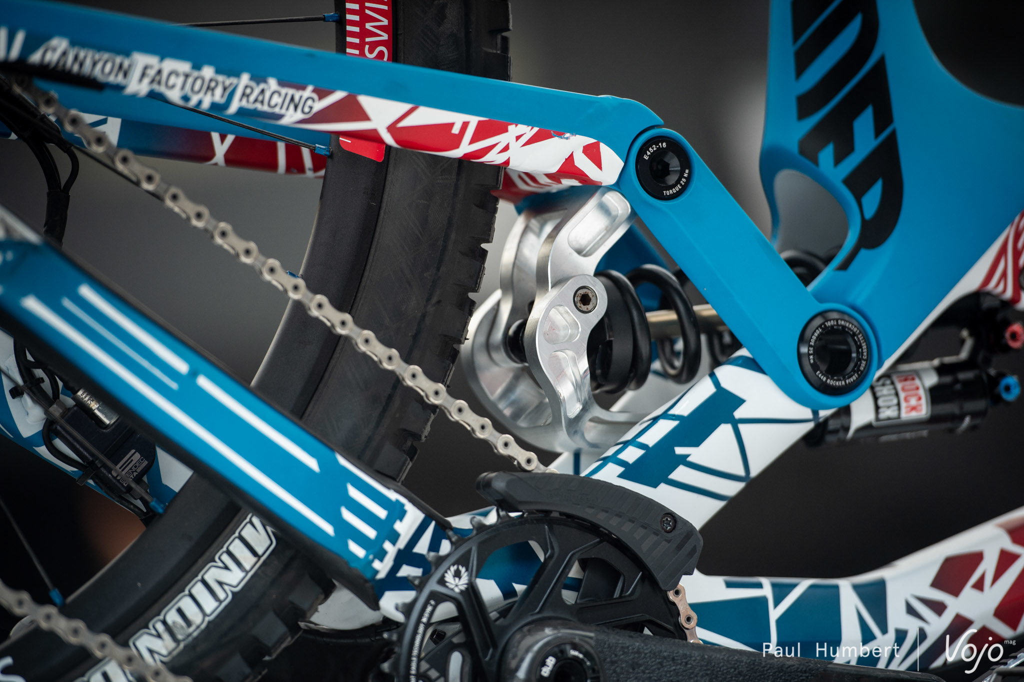 Chez Canyon, le Sender est équipé d’une biellette spécifique à l’équipe. On repère également du matériel d’acquisition de données sur la fourche.