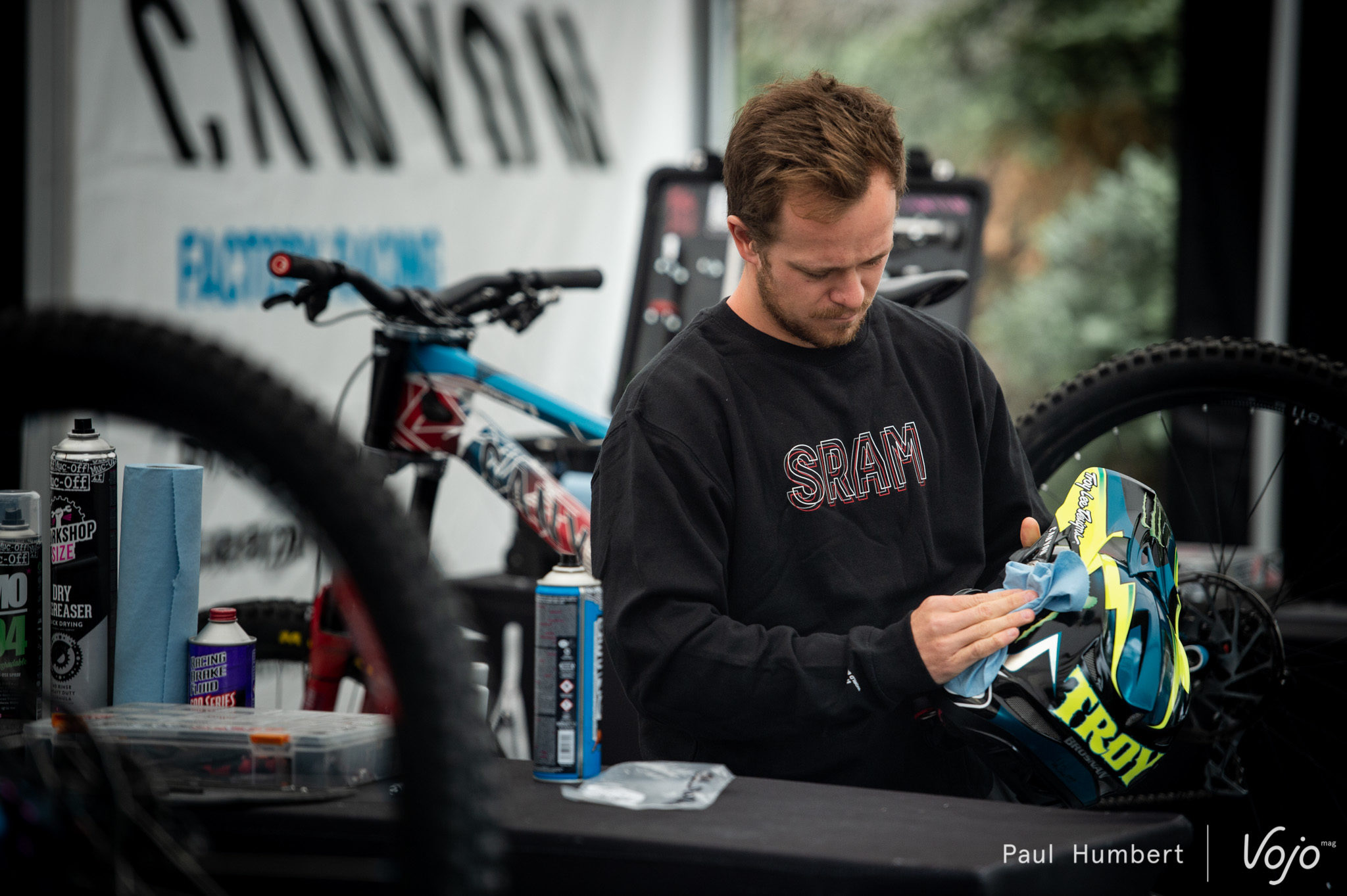 Derrière l’immense structure Mondraker coule une rivière, un emplacement bien exploité par l’équipe !