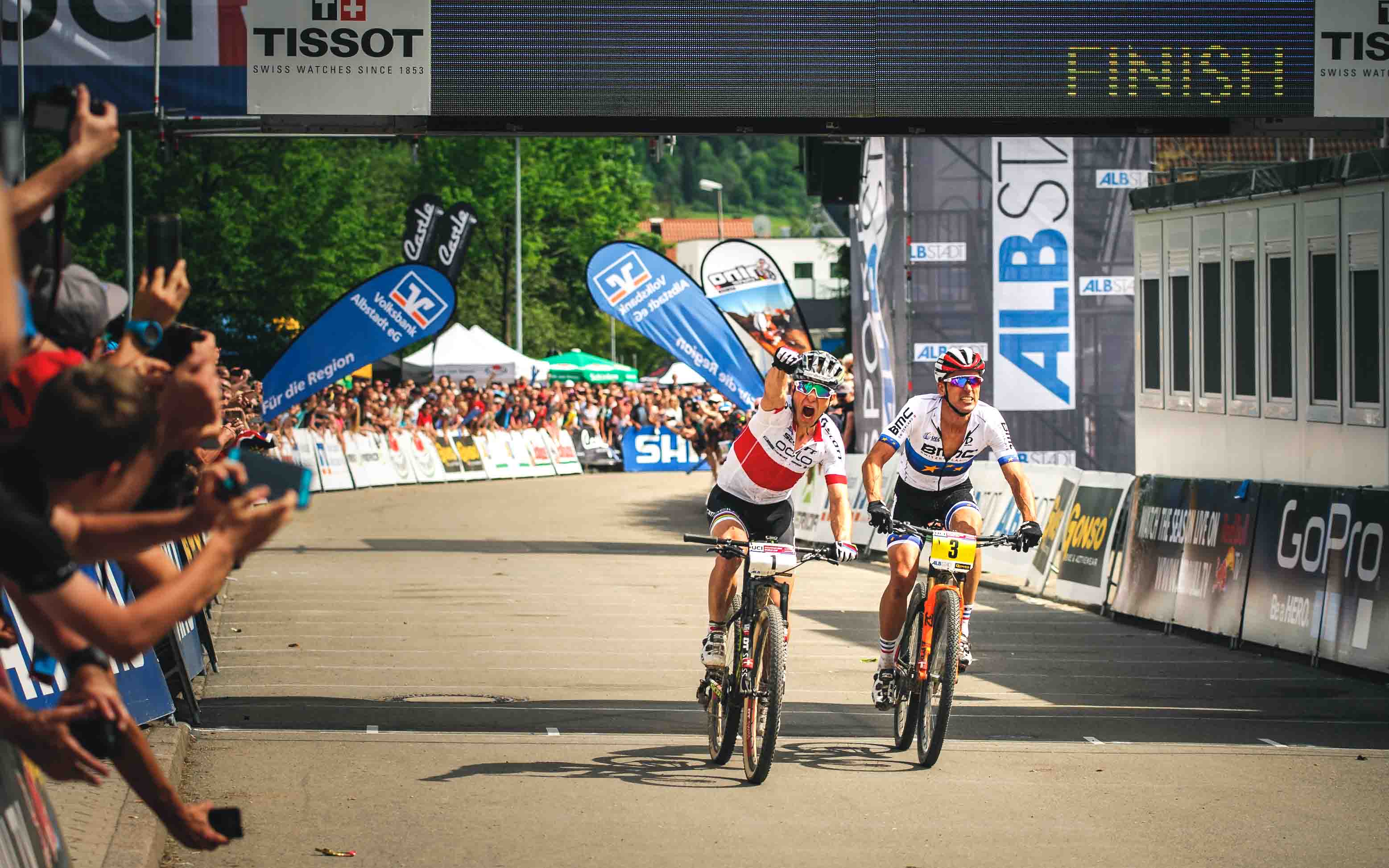 Le Suisse tente une dernière attaque en descente mais Absalon réplique dans le dernier tobboggan vers l’arrivée. Nino Schurter nous raconte ses derniers hectomètres : « Julien était très fort. Il m’a poussé dans mes derniers retranchements dans la descente finale. J’ai dû attaquer fort pour revenir et je me suis fait peur. J’ai senti ma roue avant glisser et j’ai cru revivre le scénario de l’an dernier. Mais j’ai réussi à rattraper le vélo cette fois. Je n’ai rien lâché, et je suis revenu sur Julien dans la prairie. C’était bon pour moi car je sais qu’au sprint j’ai toujours gagné. Mais cette fois, je dois bien dire que c’était la plus serrée de toutes mes victoires. Cela lui donne d’autant plus de saveur ! »