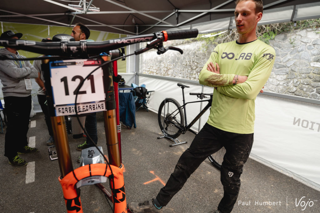 On retrouve Martin Maes sous la tente oolab. Ce dernier a commis une petite faute en début de piste : « Je me suis un peu enflammé », mais il tire un bilan très positif de ce retour en DH sur ce prototype de Rallon à la sauce DH : « J’avais un super vélo avec linkage, et c’était une très bonne expérience. Dès le début des discussions avec Orbea, j’avais annoncé vouloir faire de la descente et ils ont immédiatement été motivés. Je découvrais presque ce vélo puisqu’on avait uniquement fait 2 journées d’essais à Finale Ligure, et ces trois nouvelles journées étaient très positives. Les spectateurs étaient incroyables et j’ai hâte d’être à Fort William. »