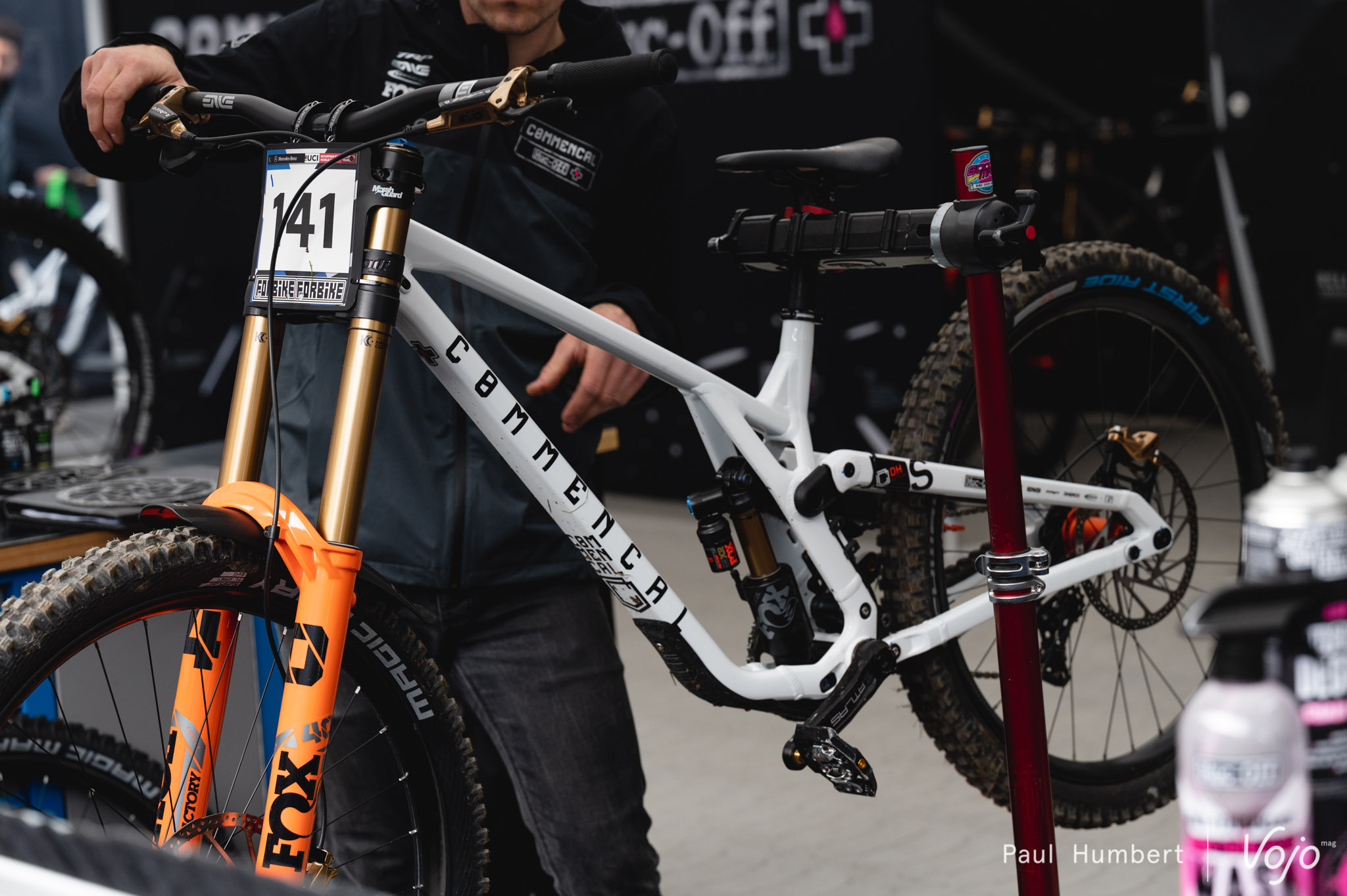 Le Commencal Supreme V5 un peu partout sur la piste, et particulièrement sous la tente Commencal/Muc-off.