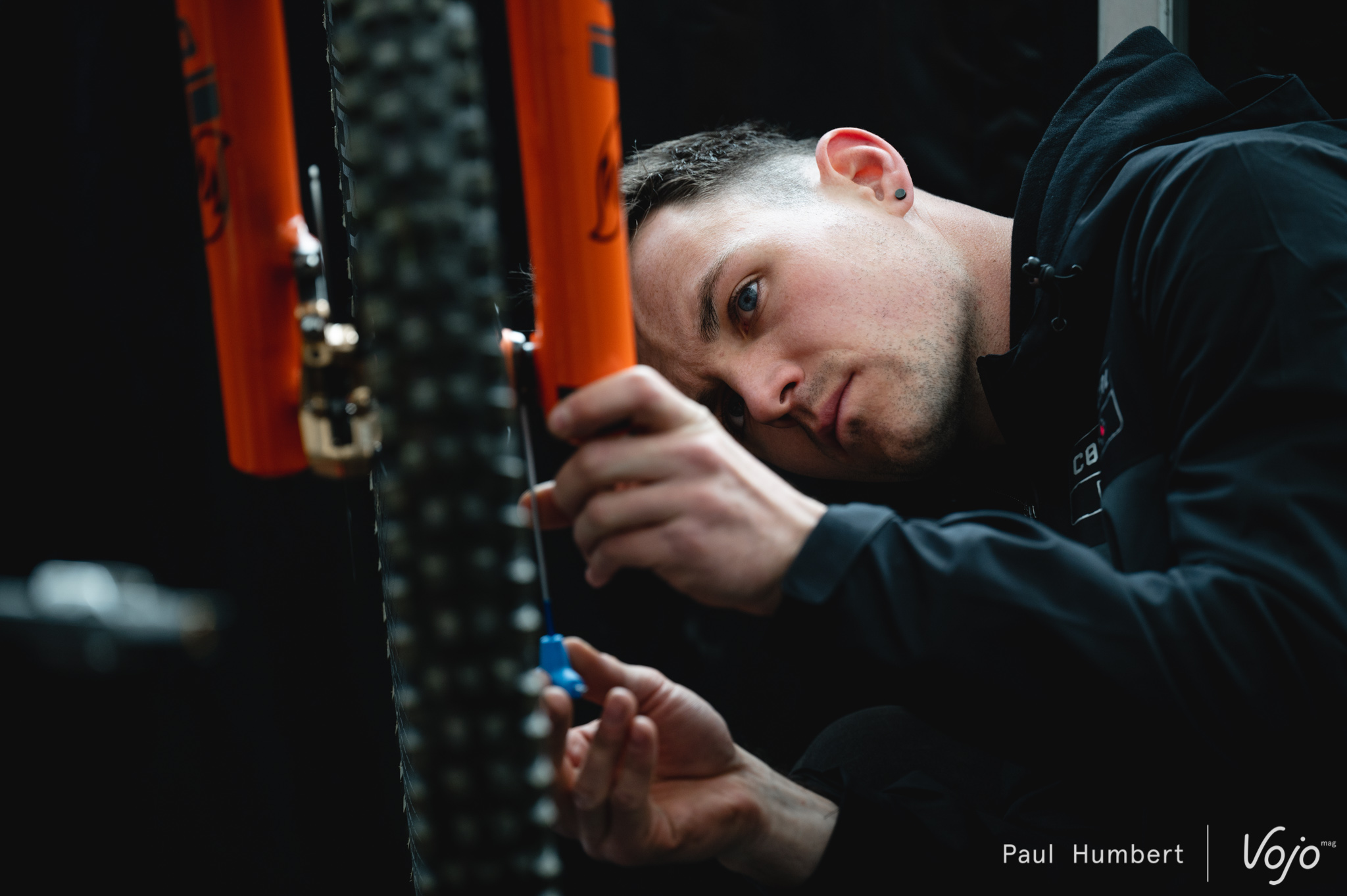 C’est sous une tente Oolab qu’on retrouve Martin Maes, et pas sous une tente Orbea : l’envie de la marque est de présenter son programme de développement. Le pilote belge est ici au guidon d’un Rallon retravaillé à la sauce « DH ».