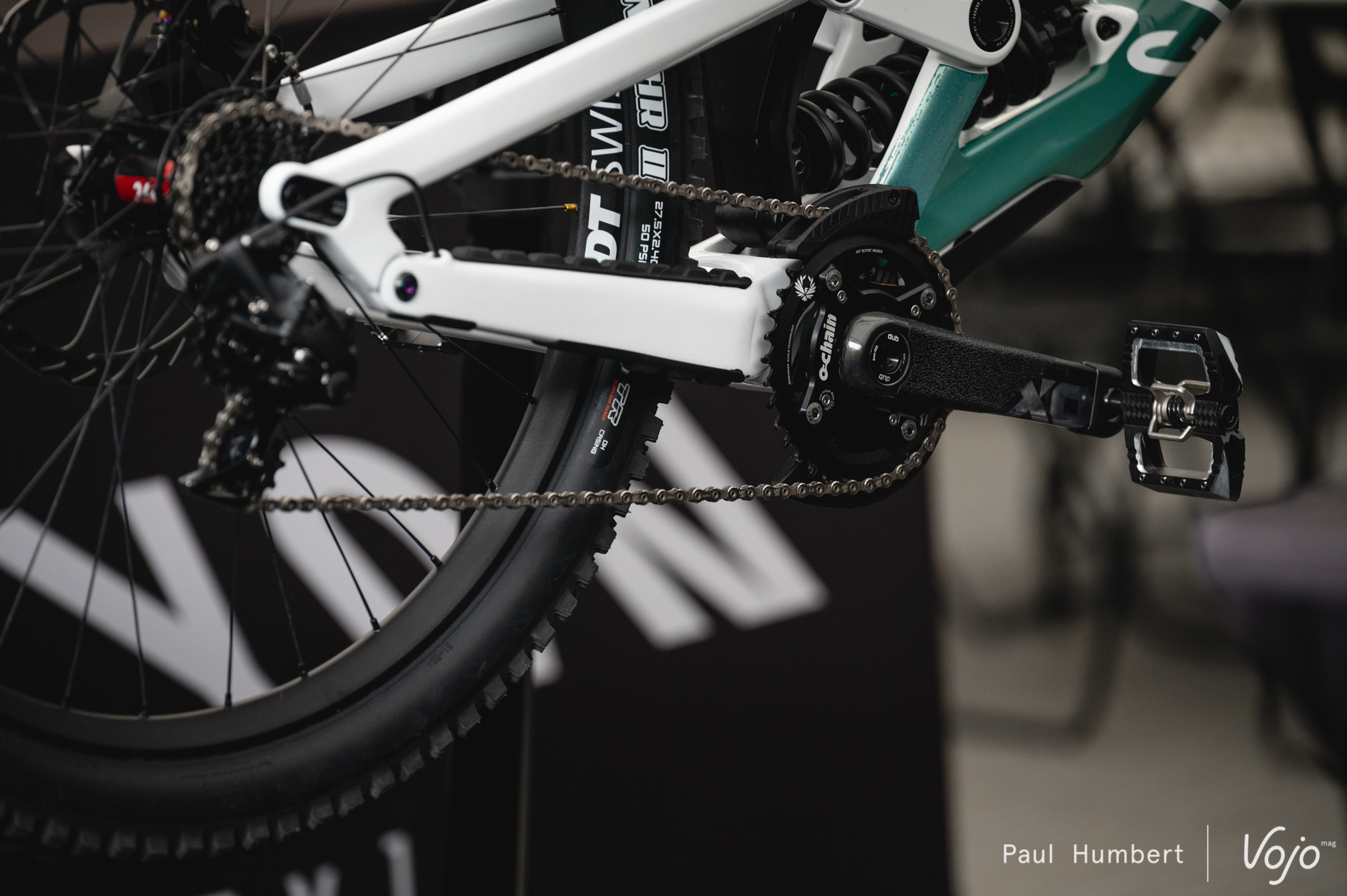 Un pédalier « flottant » Ochain sur le vélo de Luca Shaw pour réduire le kickback (théorique) du Canyon Sender.
