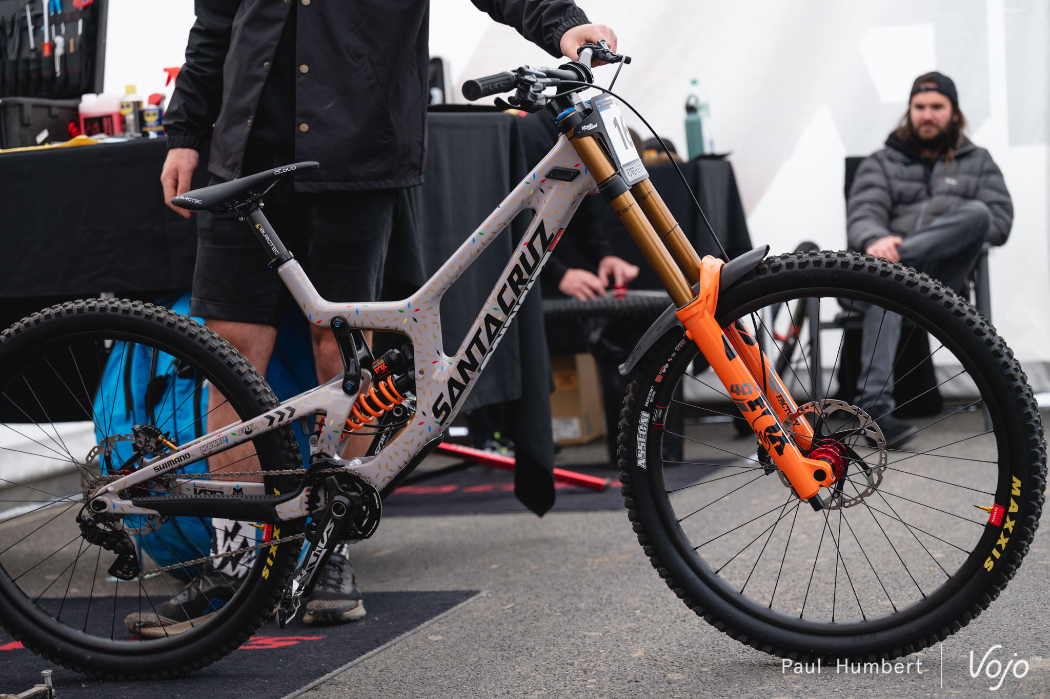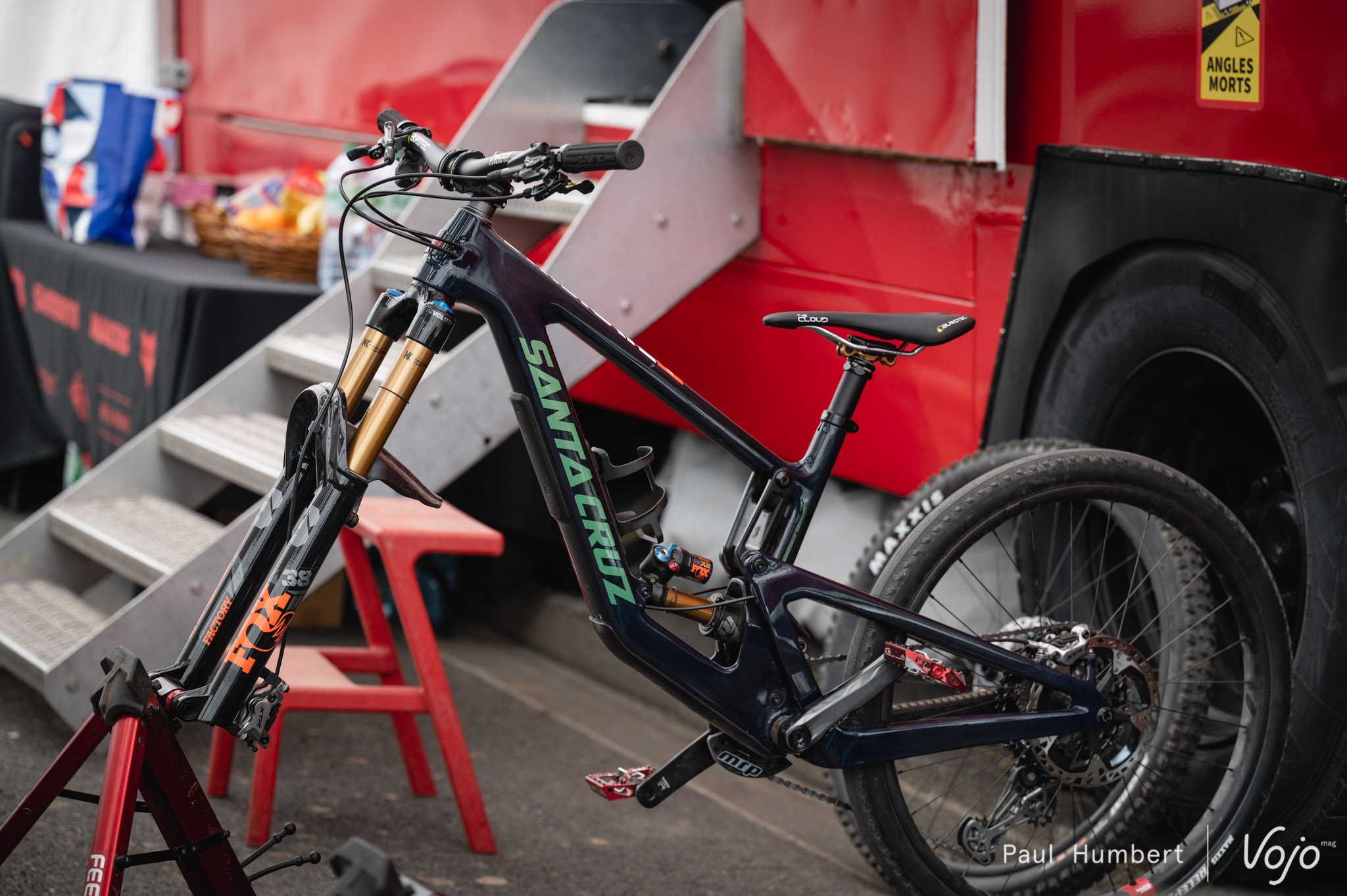 Le Santa Cruz V10 de Greg Minnaar dans les mains de son mécano, Lyle Hyslop (à retrouver en podcast ici : dev.vojomag.com/lyle-hyslop-mecano-de-greg-minnaar-le-lunch-ride-13/ ), juste à côté de ce qu’on imagine être le futur Megatower d’enduro (ici dev.vojomag.com/news/spyshot-santa-cruz-un-nouveau-megatower-en-preparation/ )