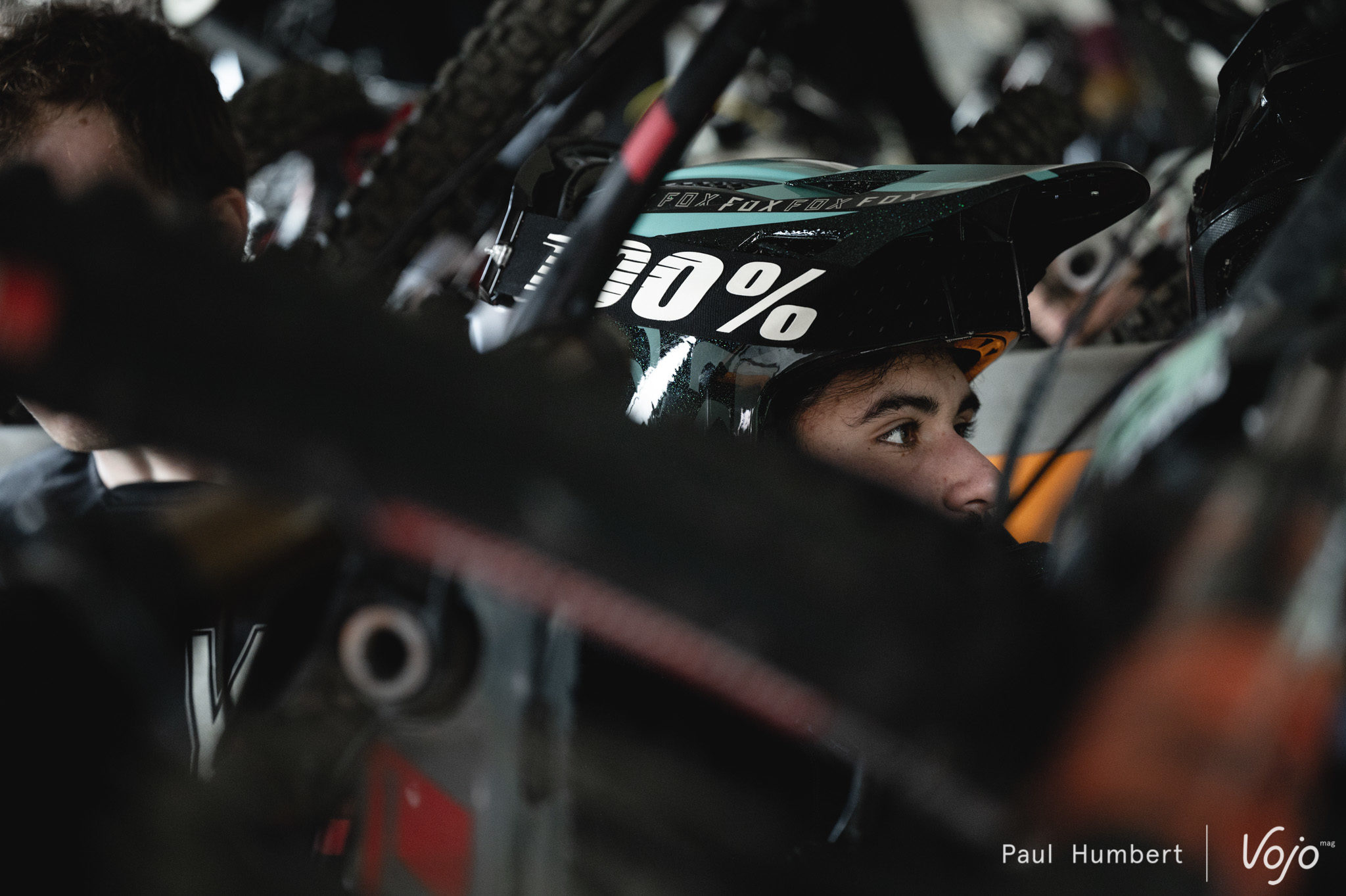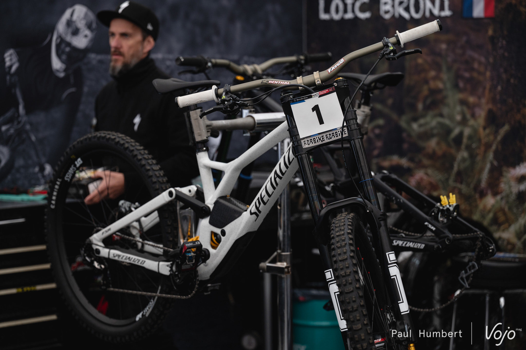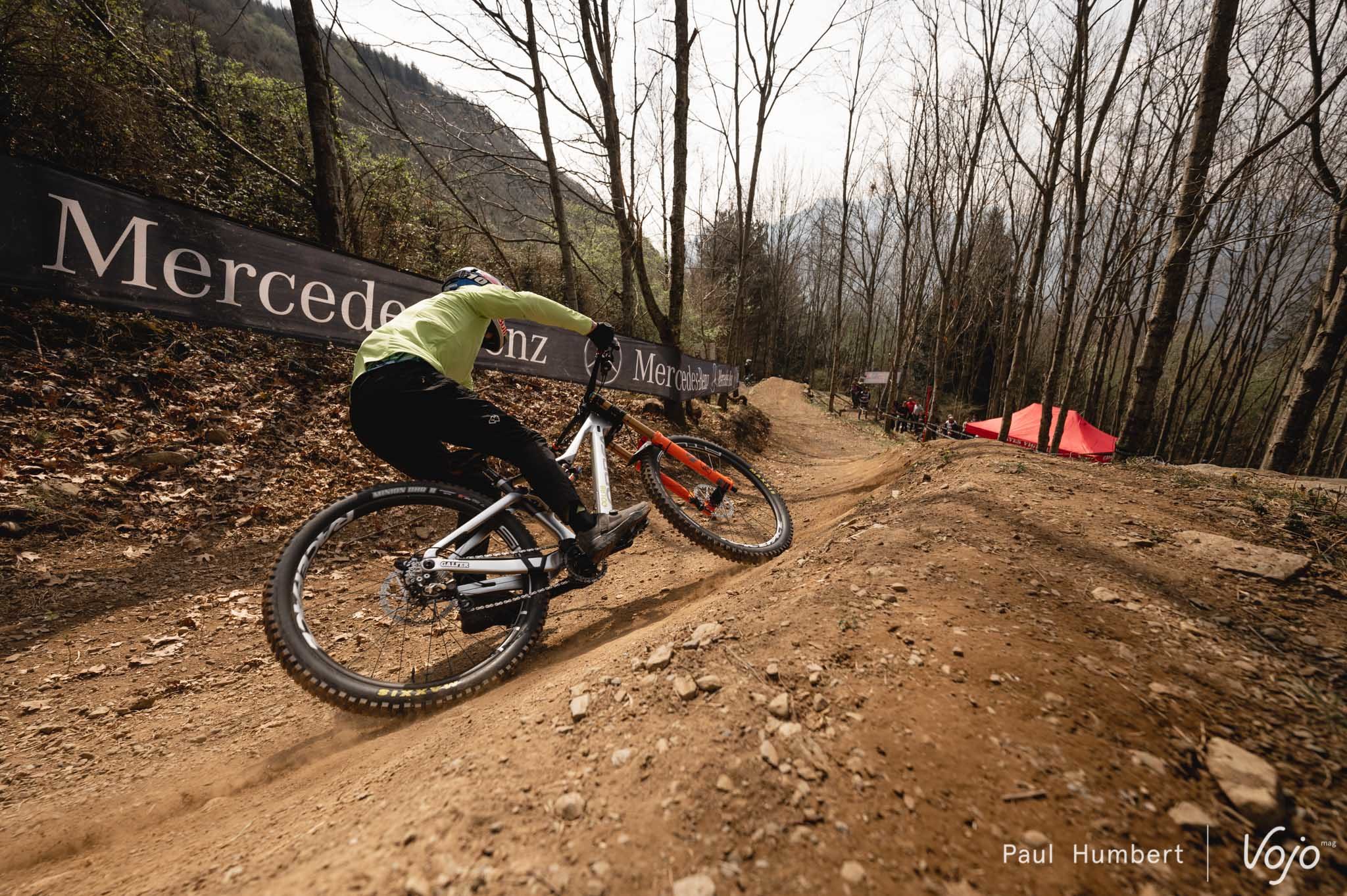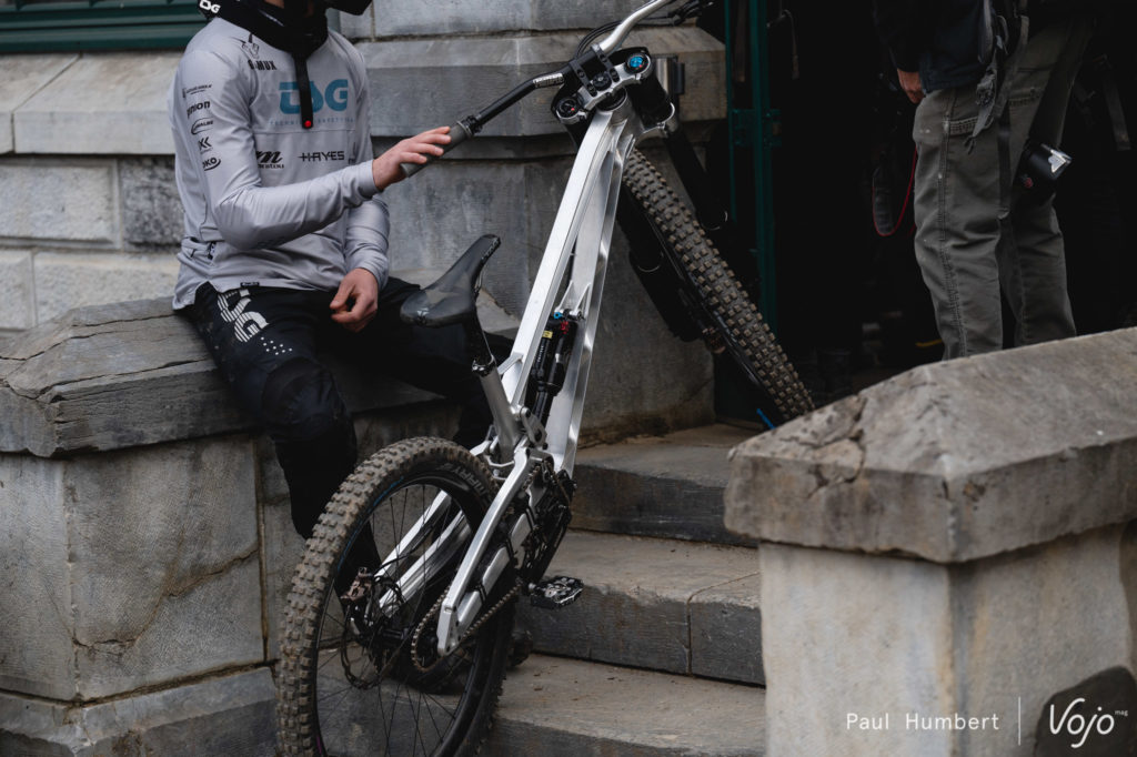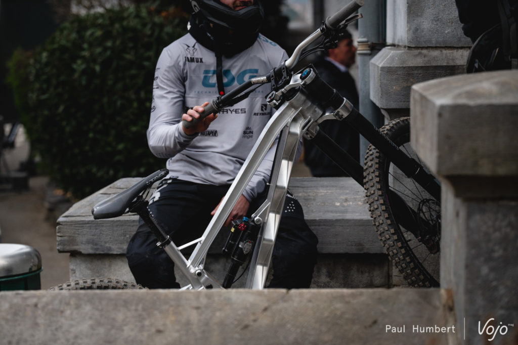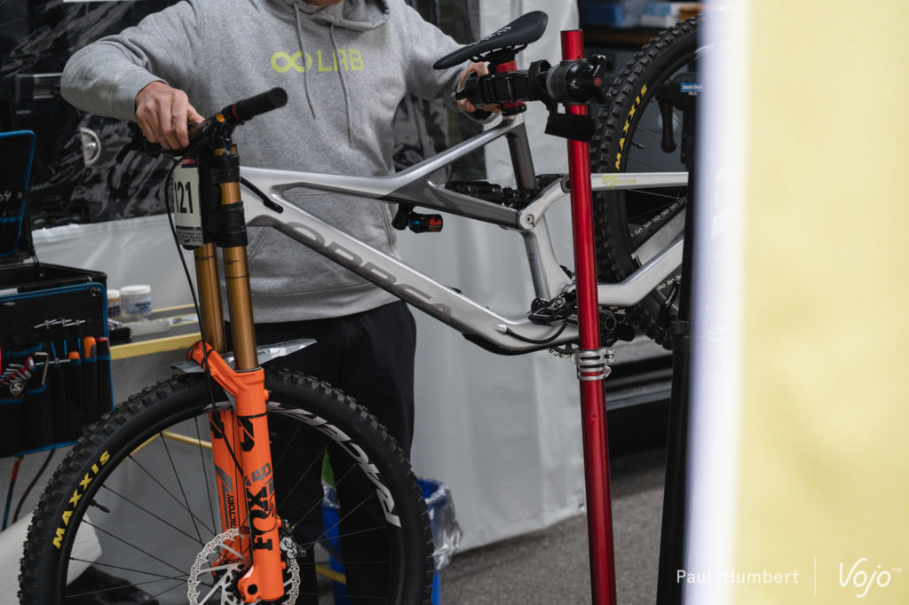 C’est sous une tente Oolab qu’on retrouve Martin Maes, et pas sous une tente Orbea : l’envie de la marque est de présenter son programme de développement. Le pilote belge est ici au guidon d’un Rallon retravaillé à la sauce « DH ».