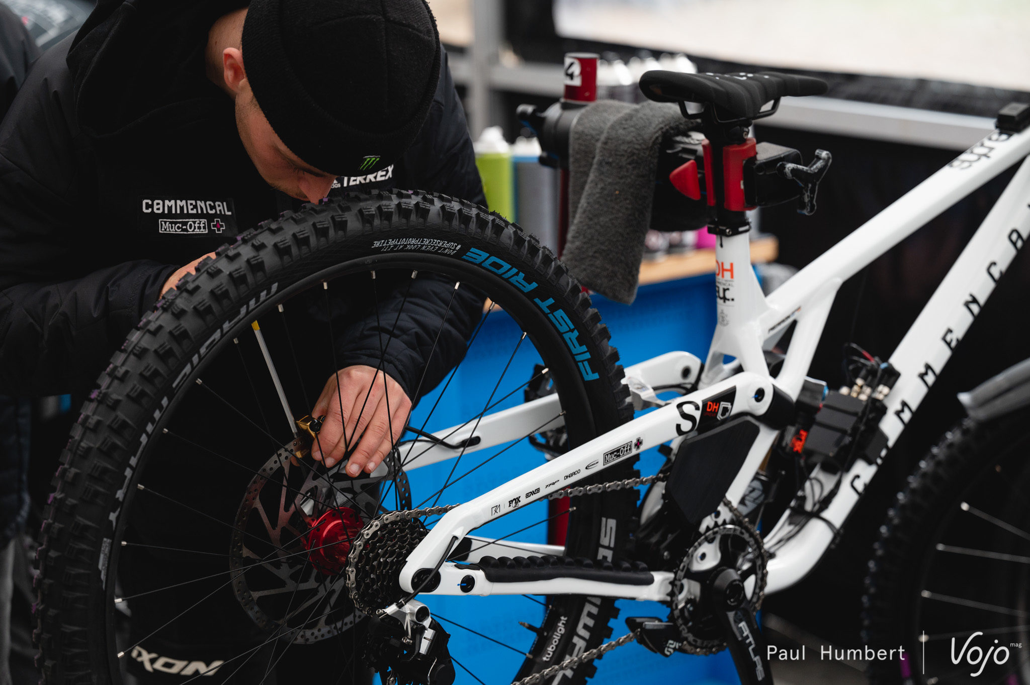 Le Commencal Supreme V5 un peu partout sur la piste, et particulièrement sous la tente Commencal/Muc-off.