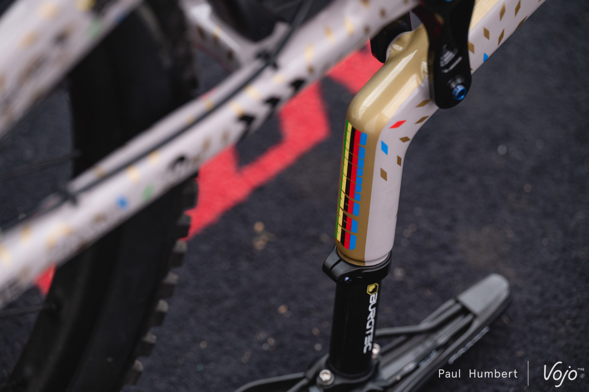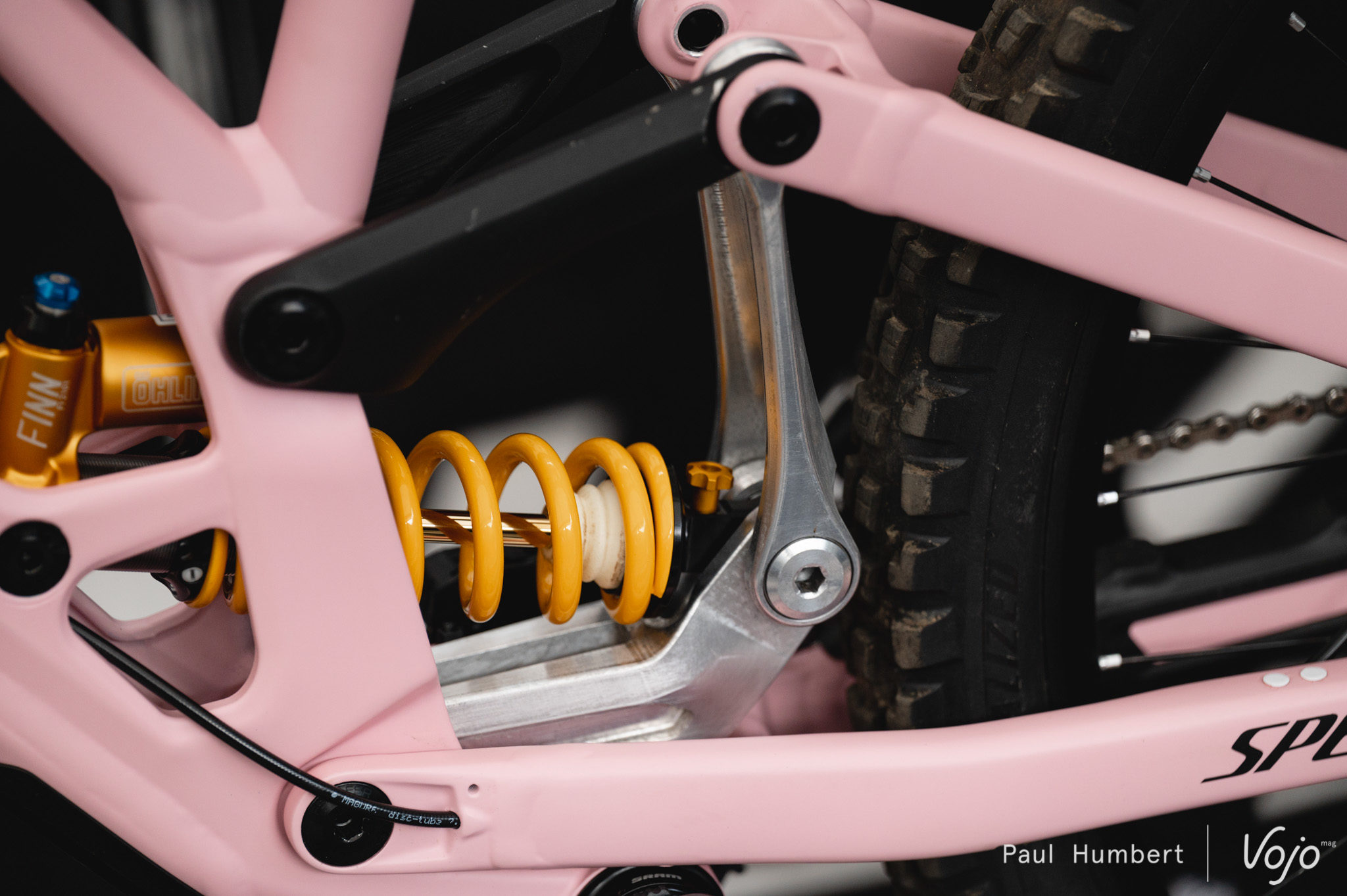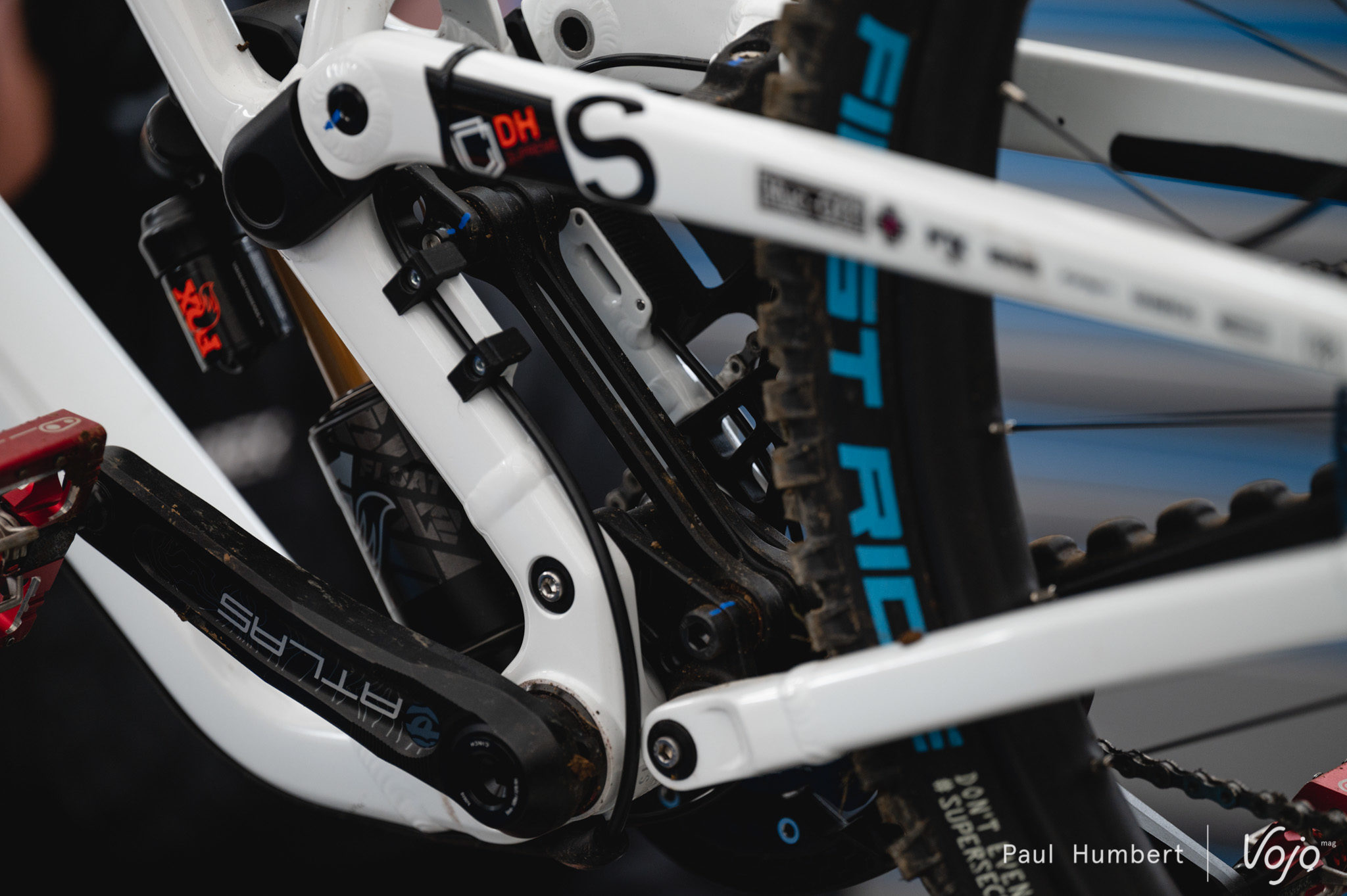 Dans les paddocks, on retrouve pas mal de petites nouveautés : des biellettes spécifiques sur le vélo de Finn Iles, et un levier de frein Magura imprimé en 3D.
