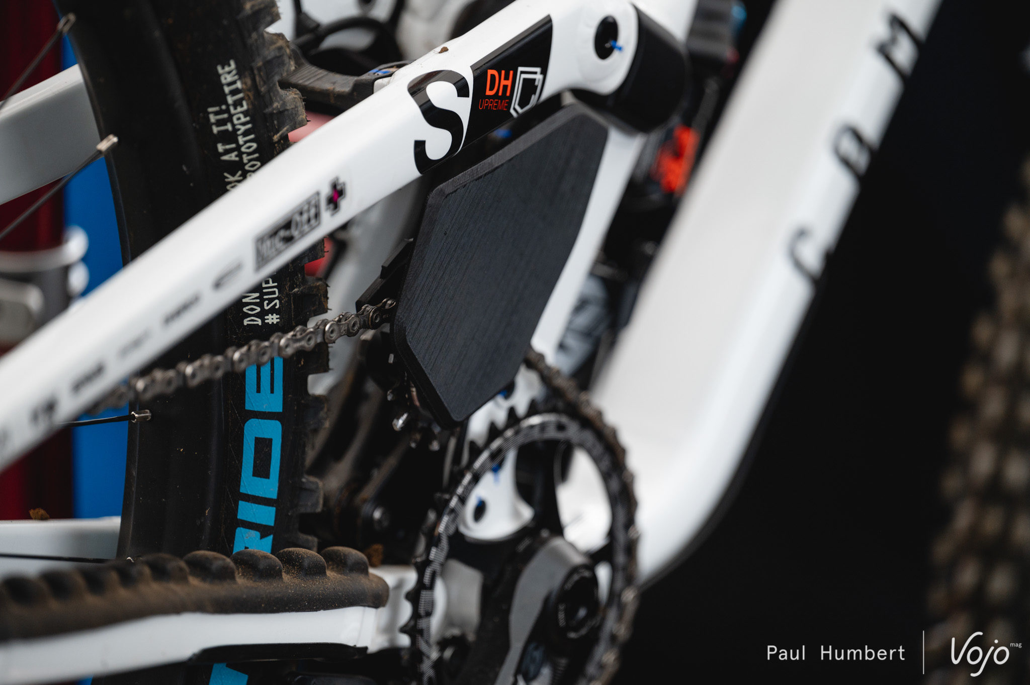 Un pédalier « flottant » Ochain sur le vélo de Luca Shaw pour réduire le kickback (théorique) du Canyon Sender.